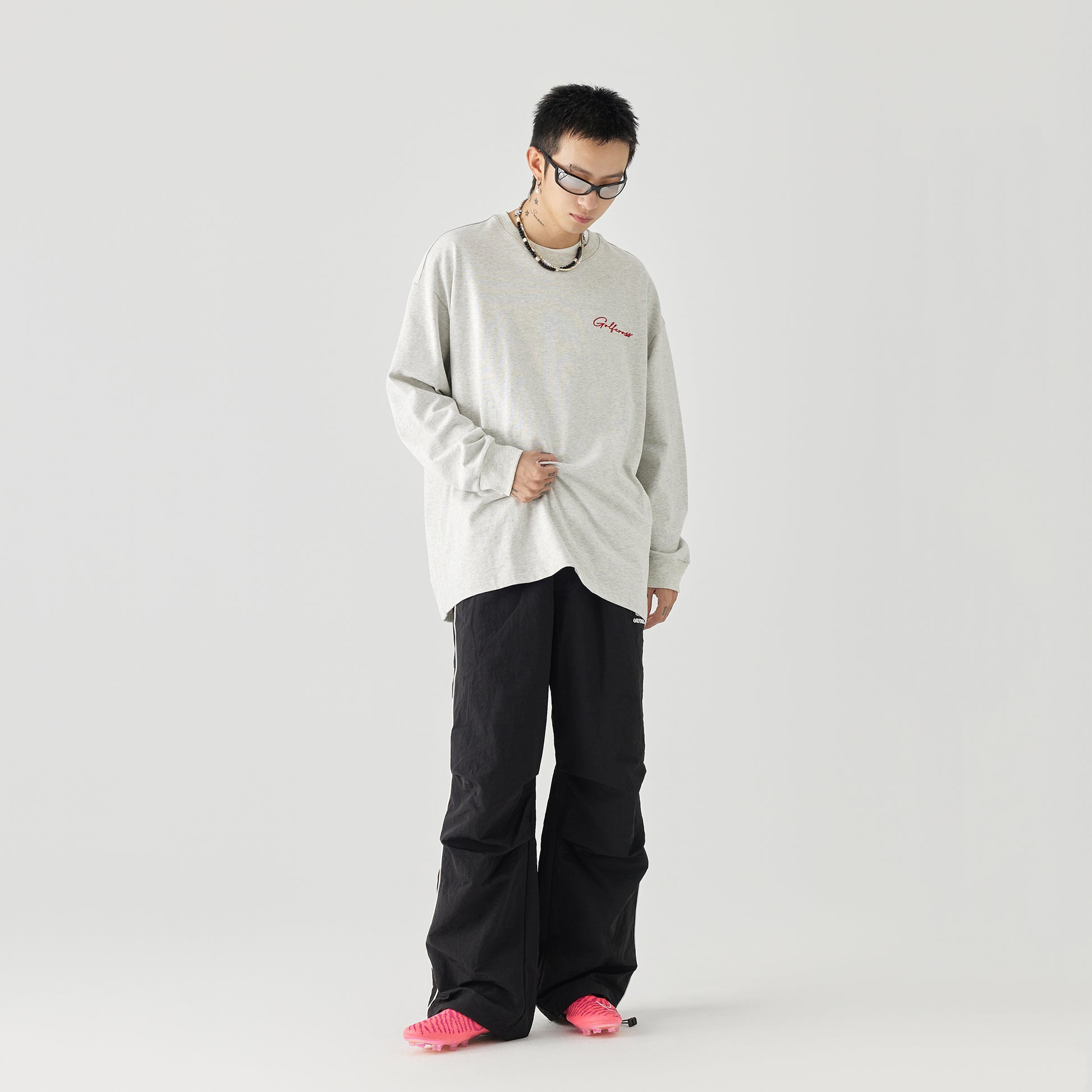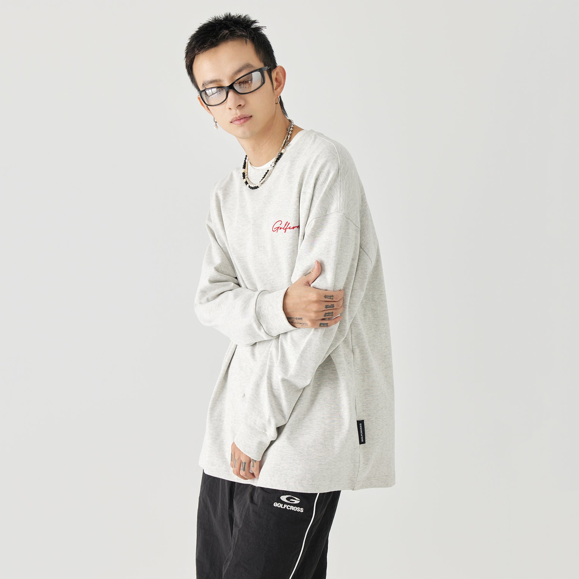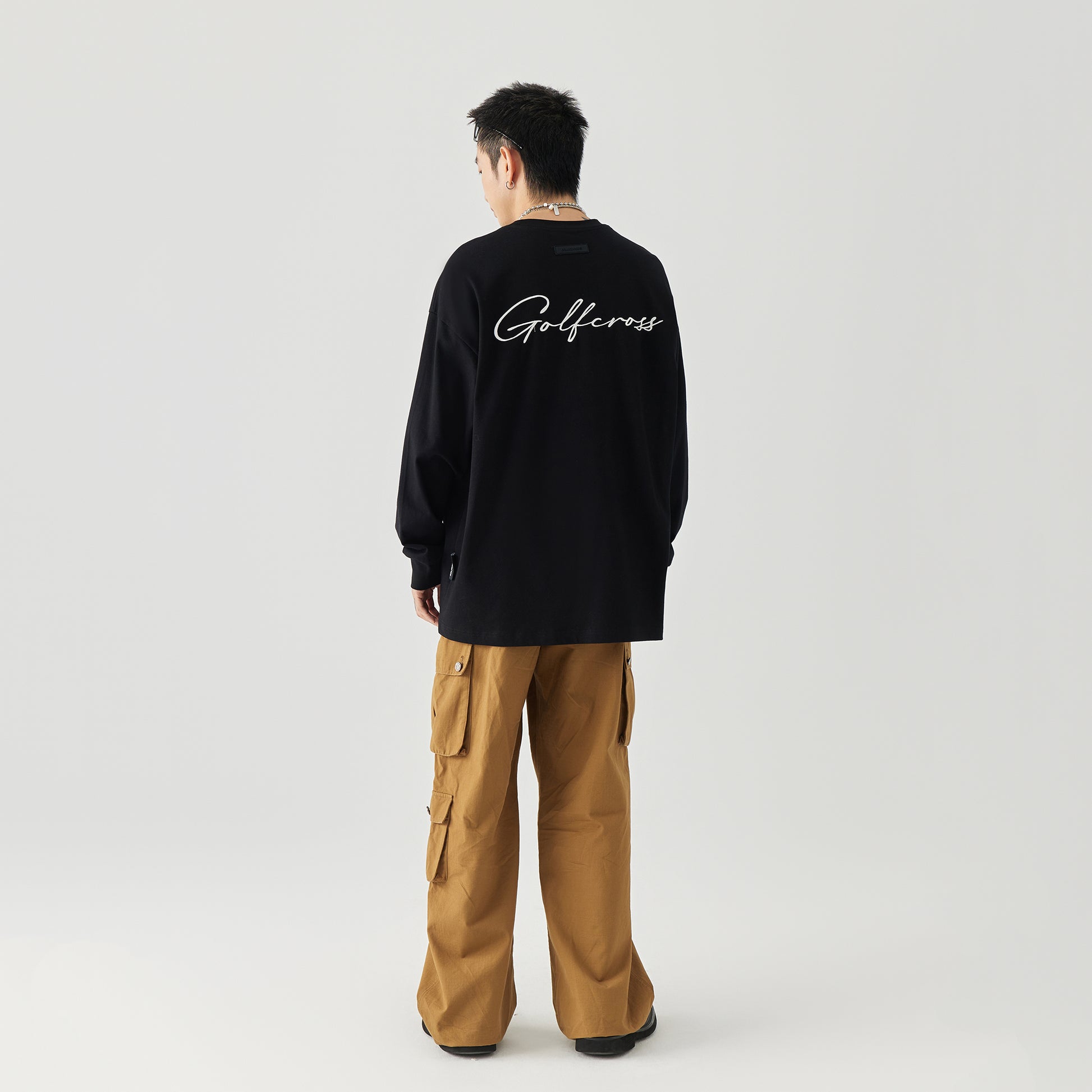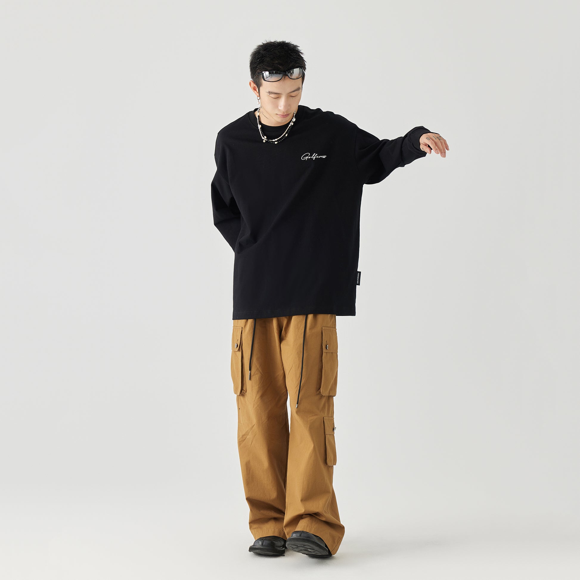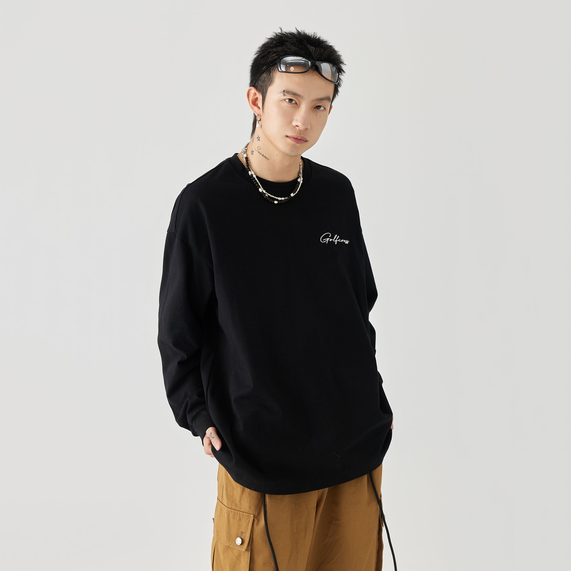 Базовый мужской лонгслив свободного прямого кроя из 100% хлопка с контрастной вышитой надписью и удлиненными плечами. Универсальная модель минималистичного дизайна для многослойных повседневных образов.