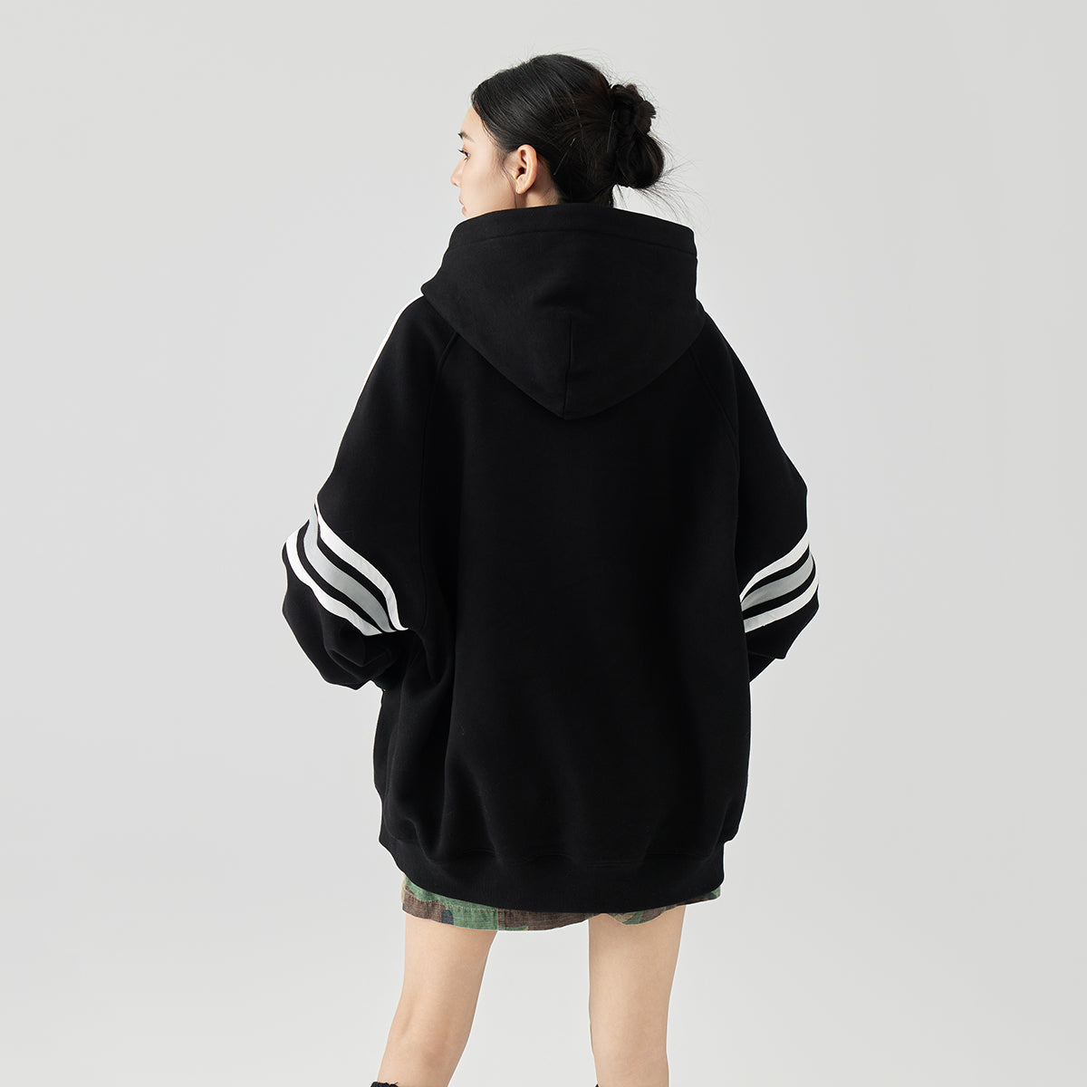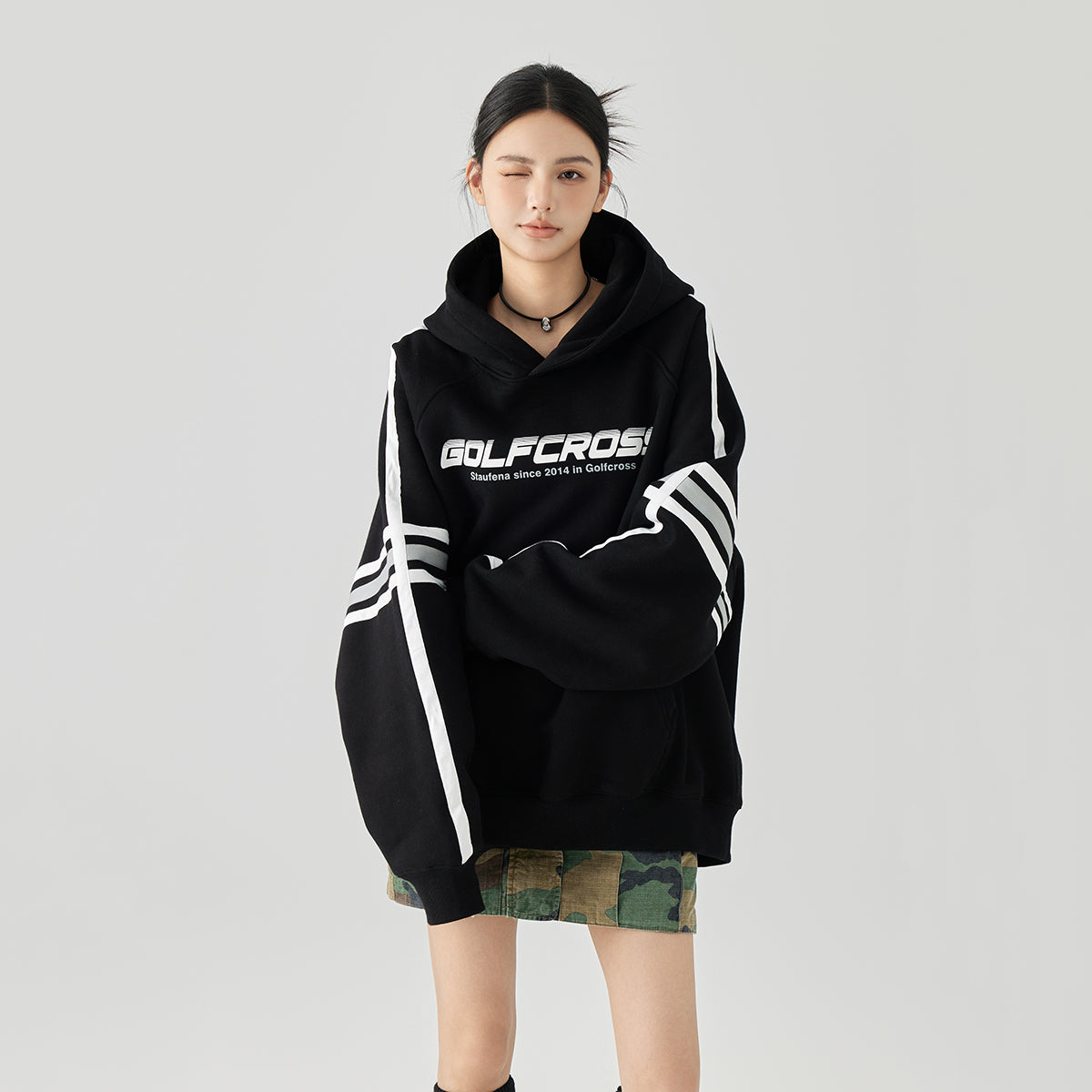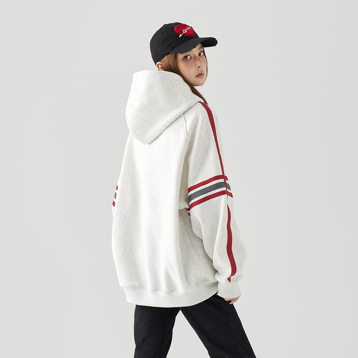 Плотное женское худи свободного кроя в ретро-спортивном стиле с капюшоном, контрастными полосками и нашивкой с логотипом. Модель с кроем реглан выполнена в популярной многослойной технике для создания стильного образа.