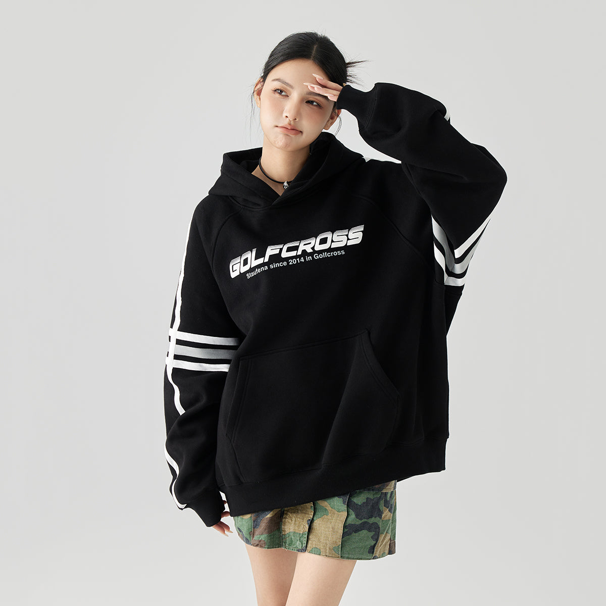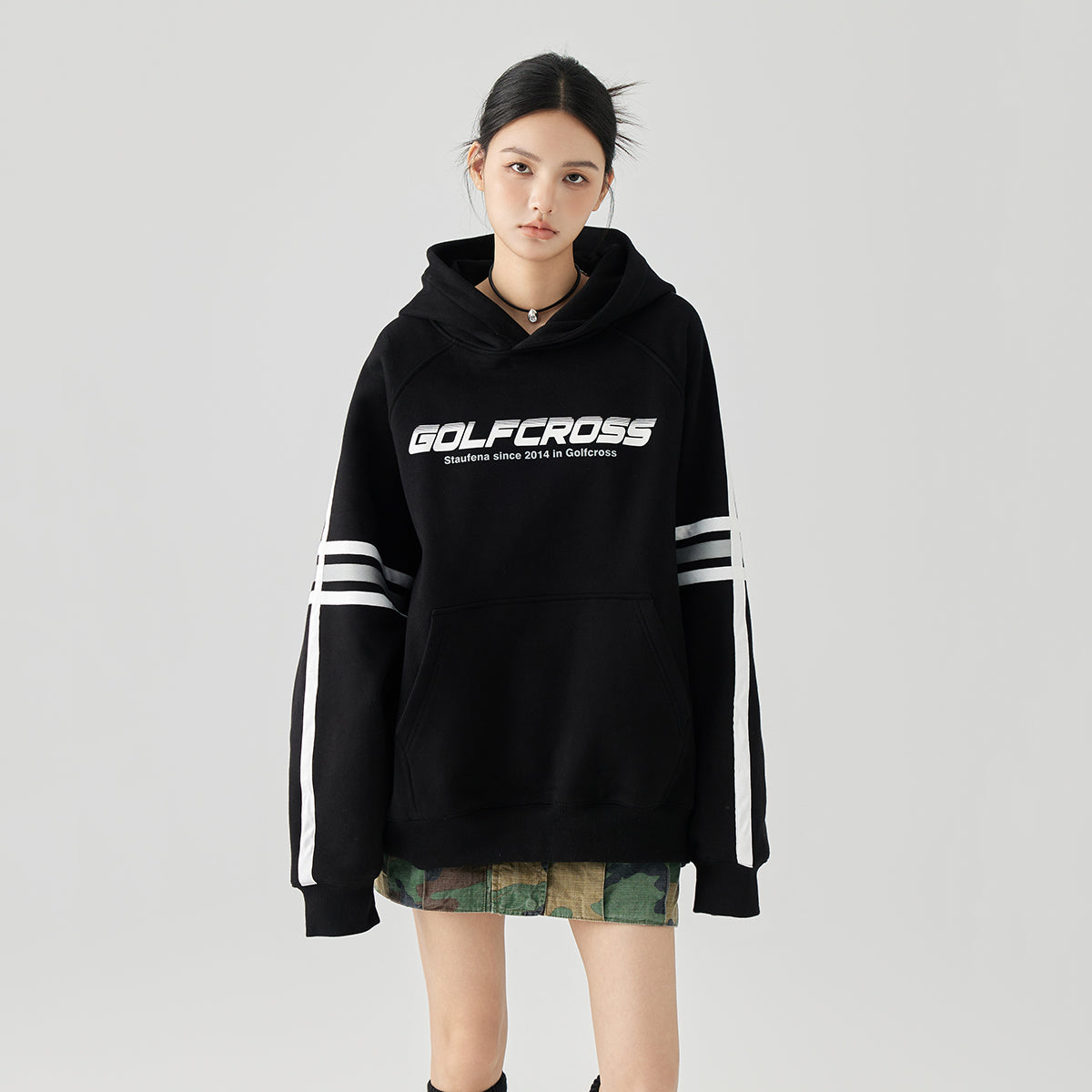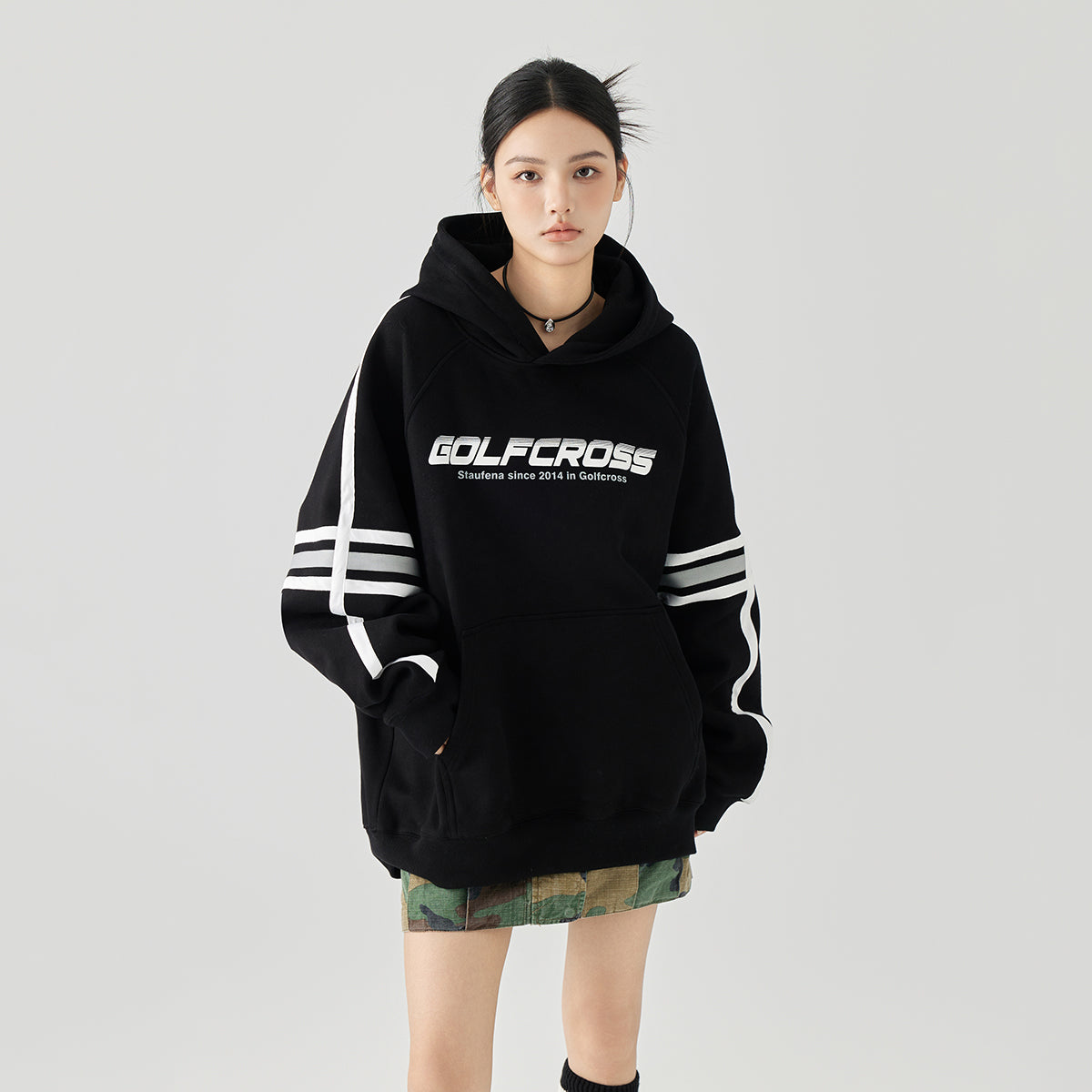 Плотное женское худи свободного кроя в ретро-спортивном стиле с капюшоном, контрастными полосками и нашивкой с логотипом. Модель с кроем реглан выполнена в популярной многослойной технике для создания стильного образа.