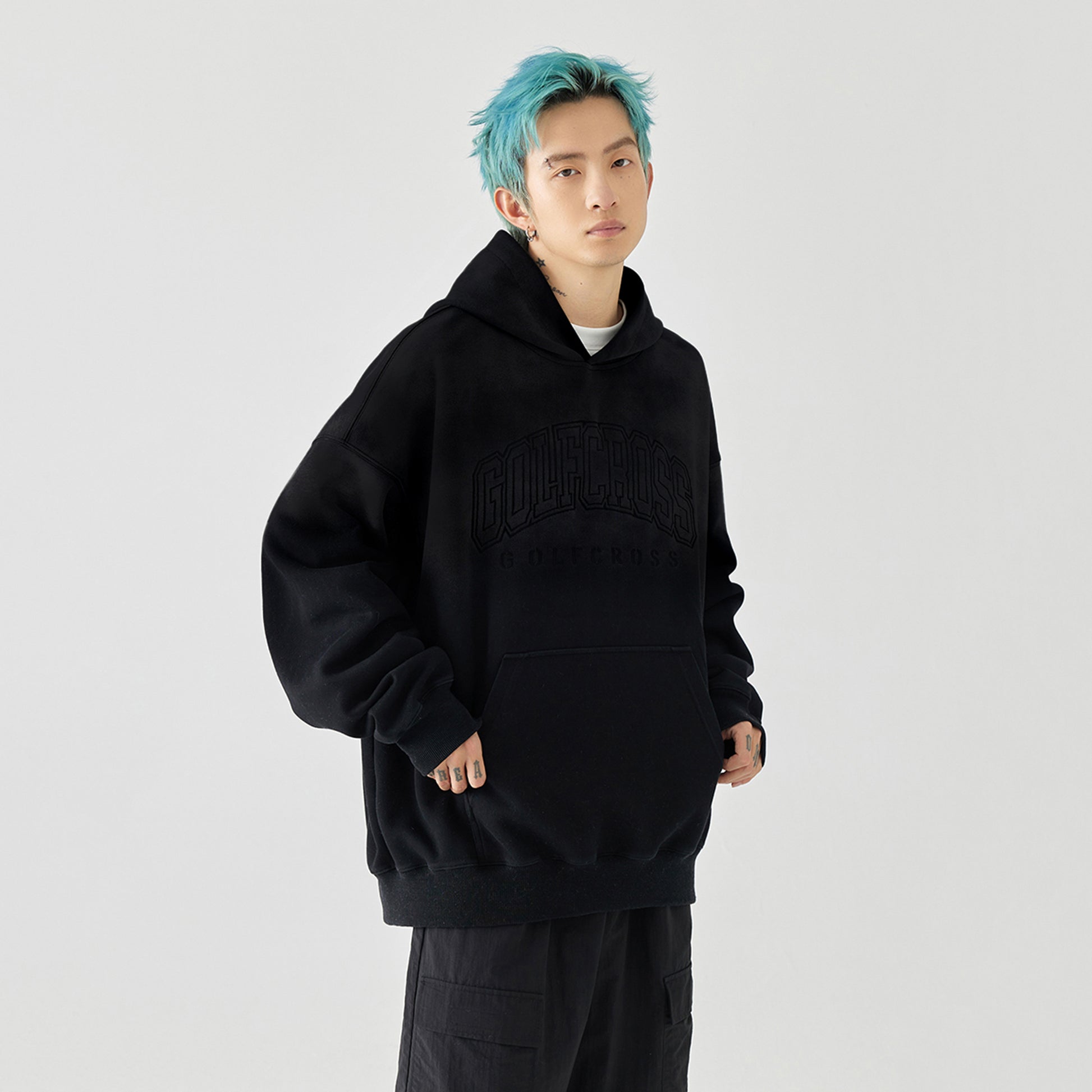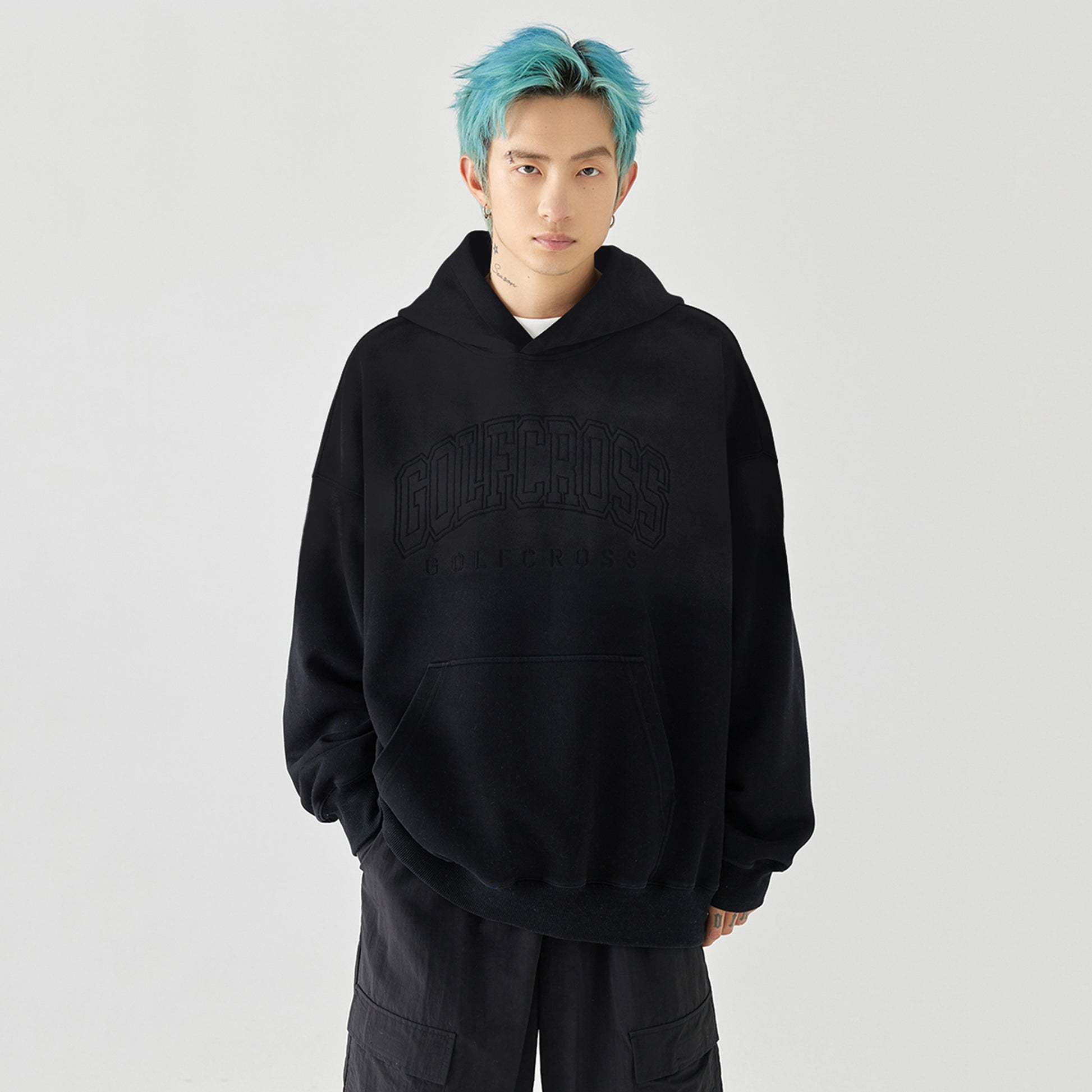Худи свободного кроя с капюшоном, выполненное в винтажном стиле с эффектом потертости, вышивкой и ажурными буквами. Модель из плотной ткани с градиентным промыванием подчеркивает уличный и брутальный образ.