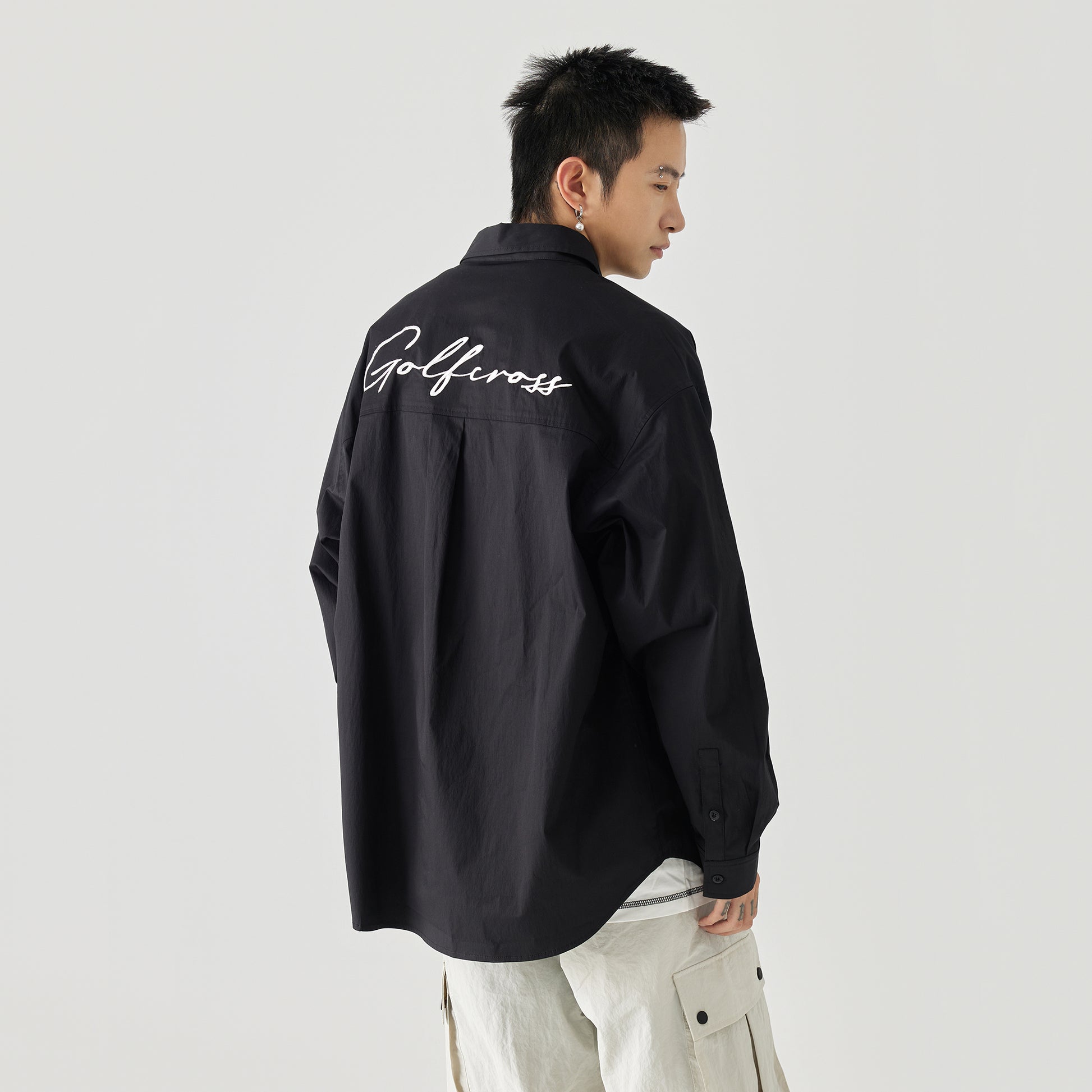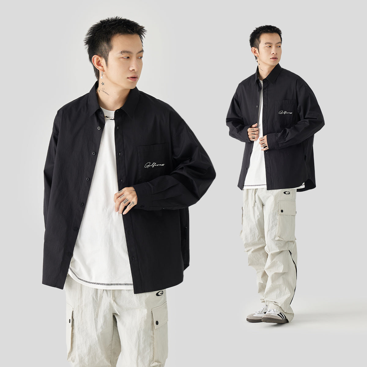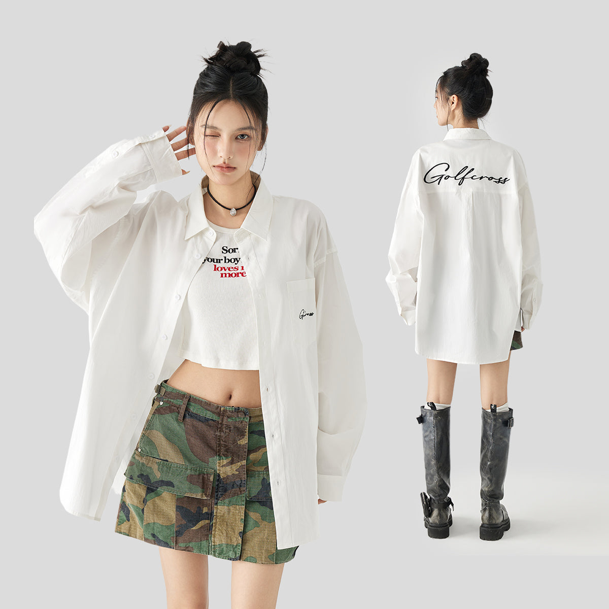 Базовая свободная рубашка с отложным воротником, пуговицами, спущенным плечом и вышитым логотипом. Универсальная модель из смесового хлопка подходит для носки в любое время года.