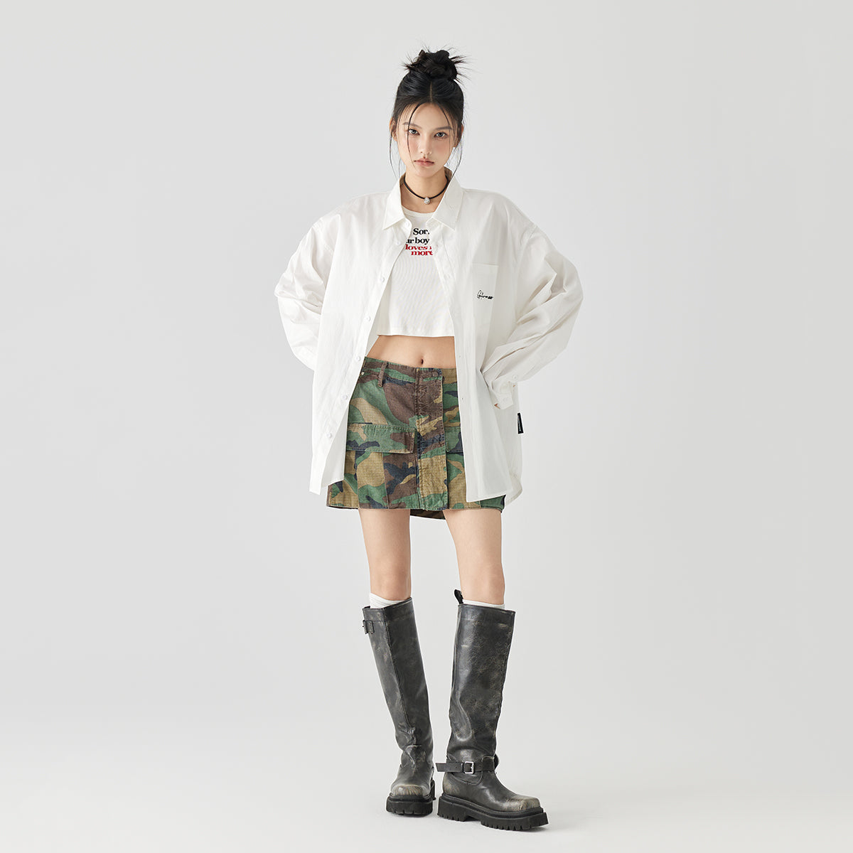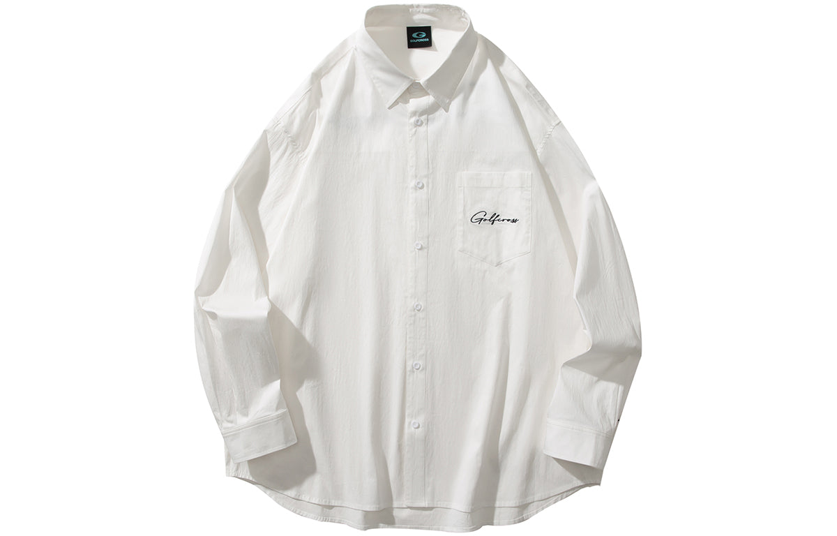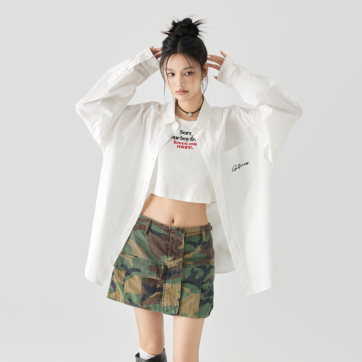 Базовая свободная рубашка с отложным воротником, пуговицами, спущенным плечом и вышитым логотипом. Универсальная модель из смесового хлопка подходит для носки в любое время года.