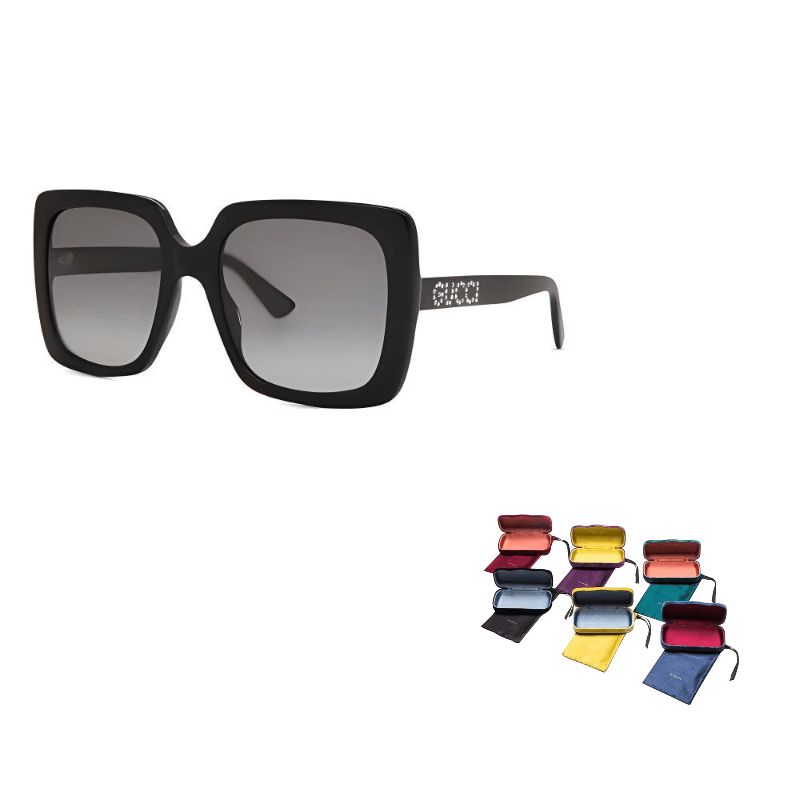 Квадратные солнцезащитные очки с пластиковой оправой, выполненные в черном и сером цветах. Эта стильная модель украшена логотипом Gucci в алмазном дизайне, что придает им уникальность и элегантность. Очки обеспечивают надежную защиту от солнечных лучей и подходят для повседневного ношения, добавляя шик к вашему образу.