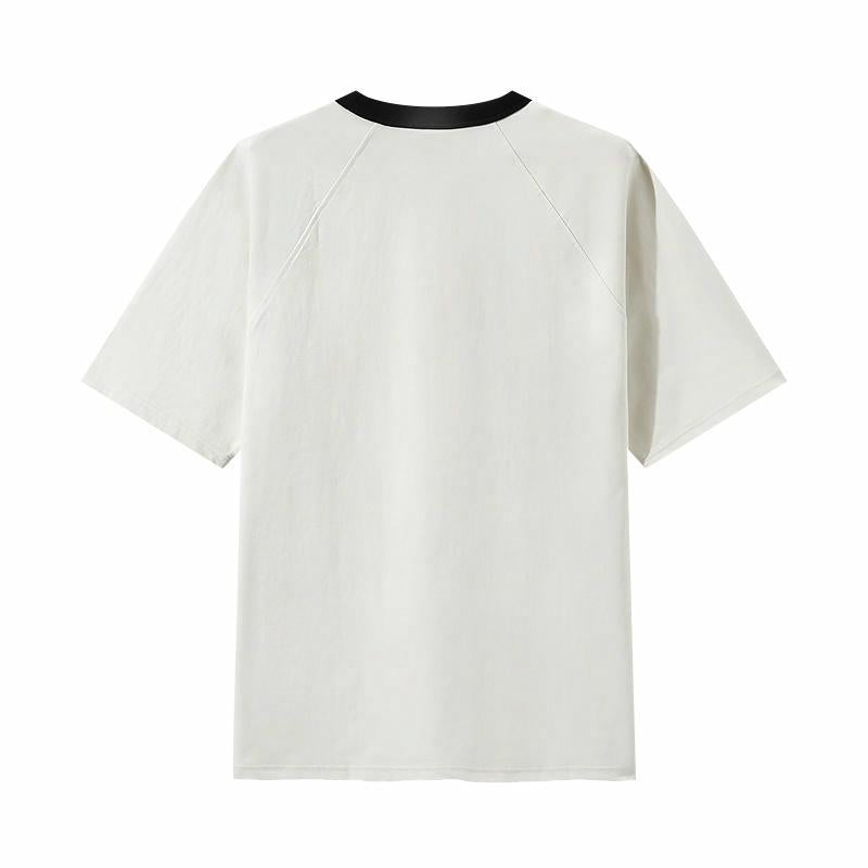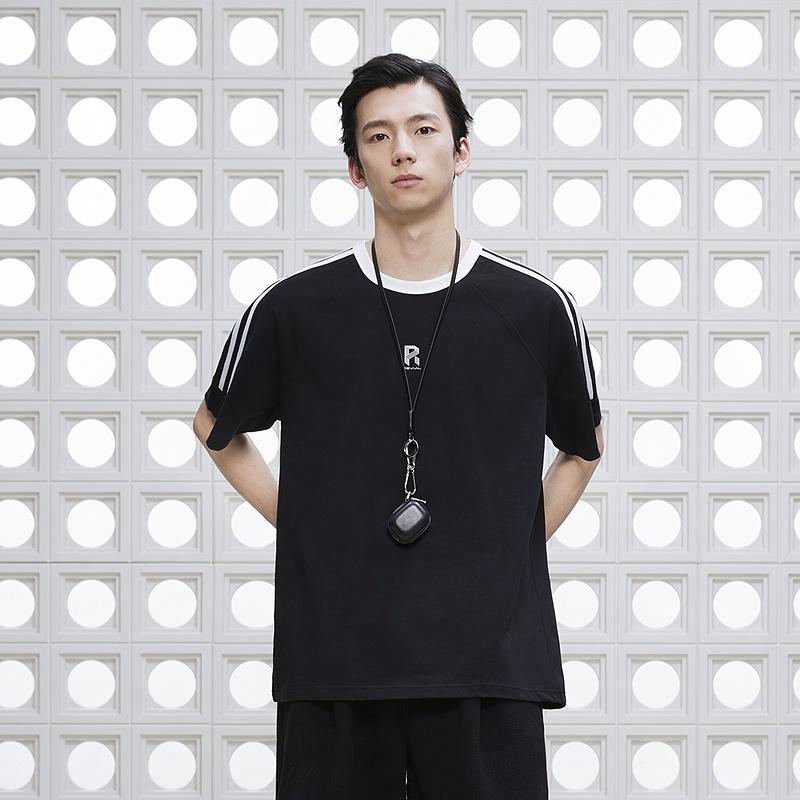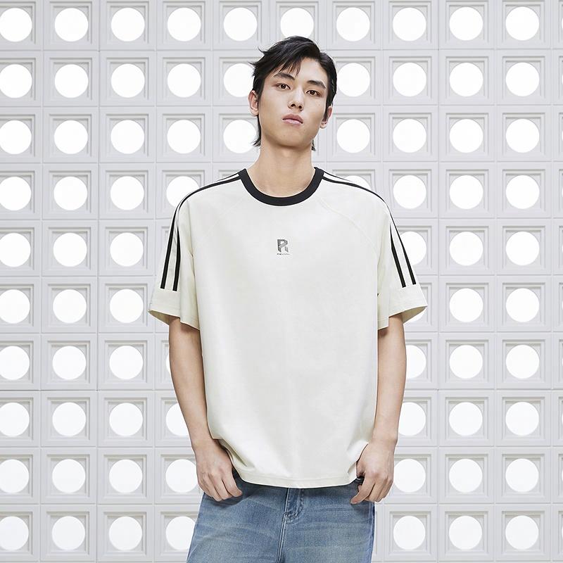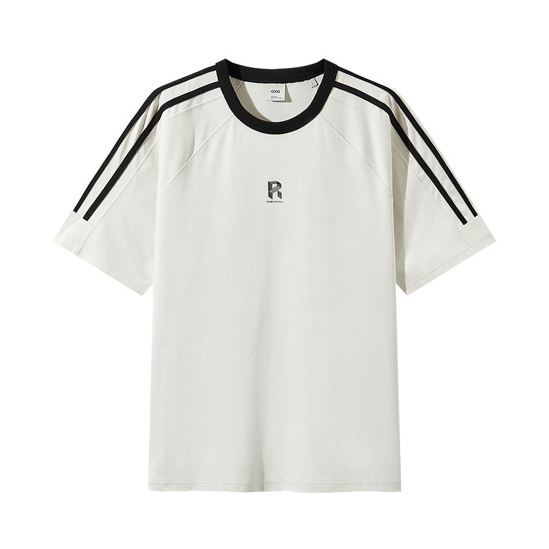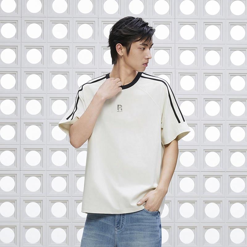 Белая мужская футболка с полосами в рукавах.