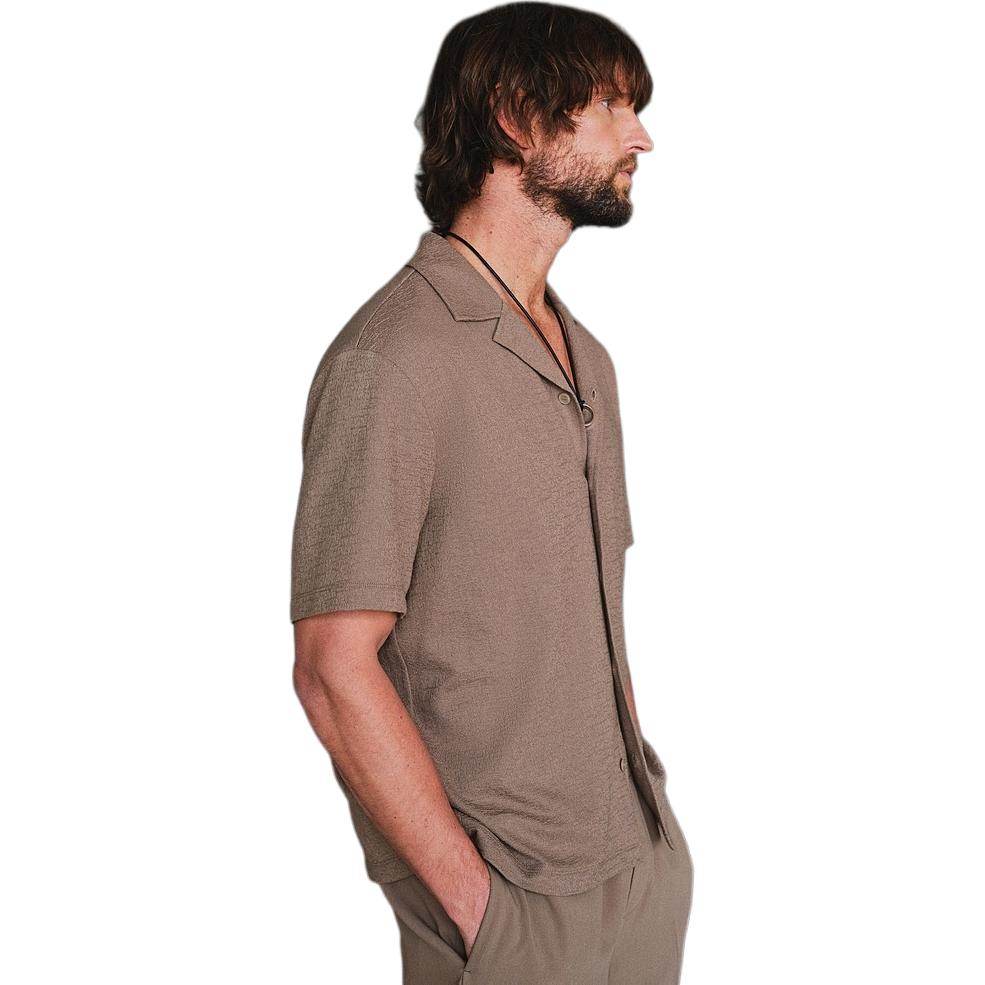 Эта темно-бежевая однотонная рубашка с воротником-кубанкой и коротким рукавом предлагает удобный и повседневный стиль, идеально подходящий для теплой погоды. Стильная и универсальная, она станет отличным выбором для различных случаев.