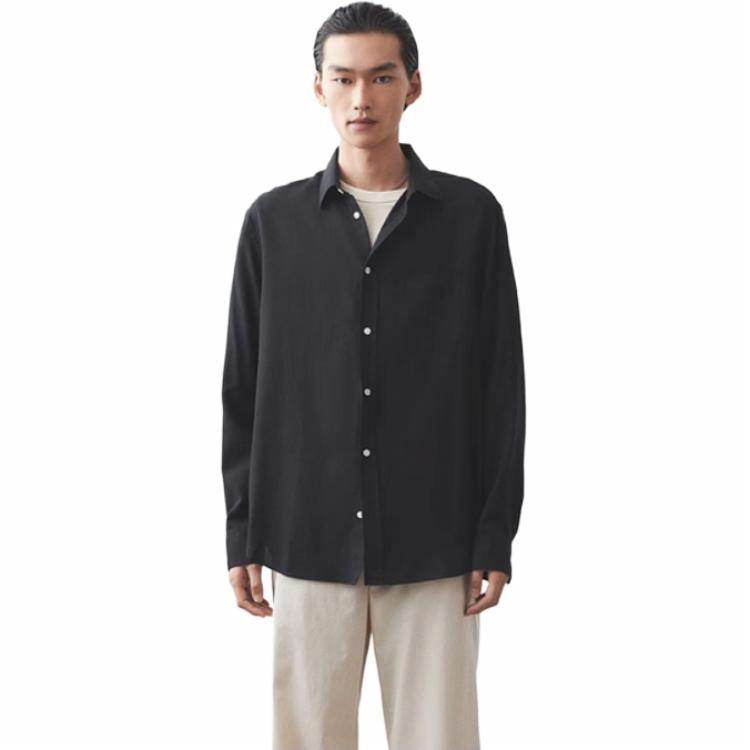 Эта рубашка с длинными рукавами и лацканами выполнена в классическом черном цвете. Простой и элегантный дизайн делает её идеальным выбором для как повседневного, так и более формального ношения. Удобный материал обеспечивает комфорт, а универсальный стиль позволяет легко сочетать рубашку с брюками или джинсами, добавляя стильный акцент в мужской гардероб.