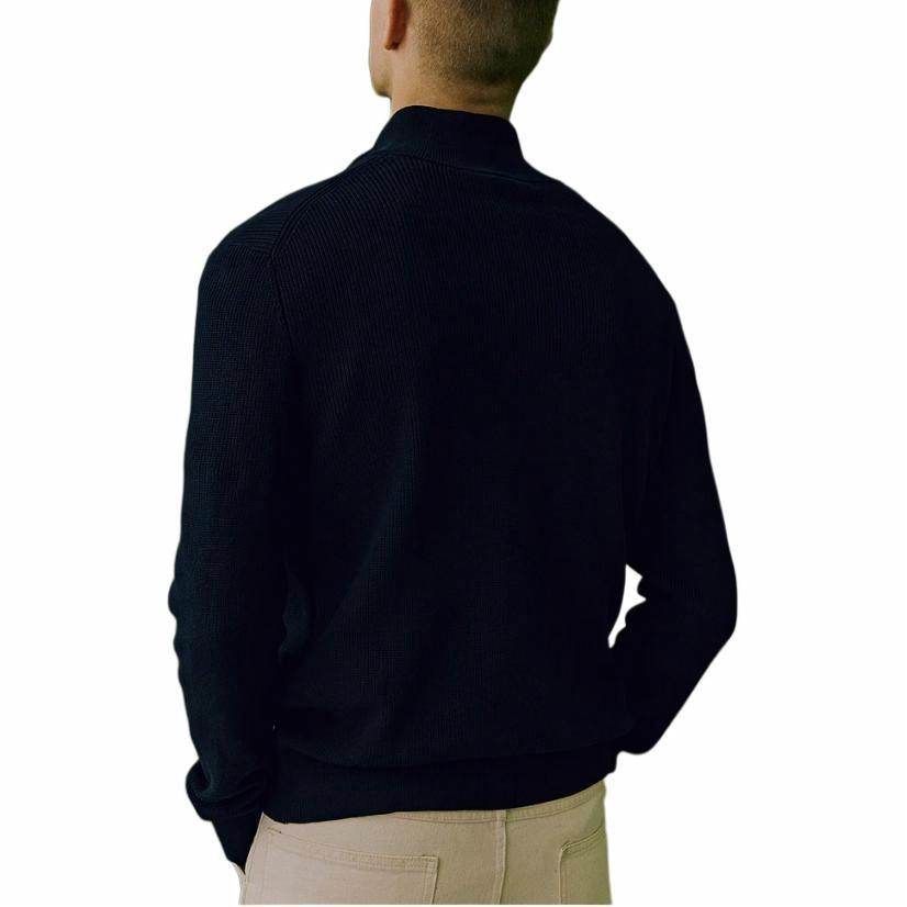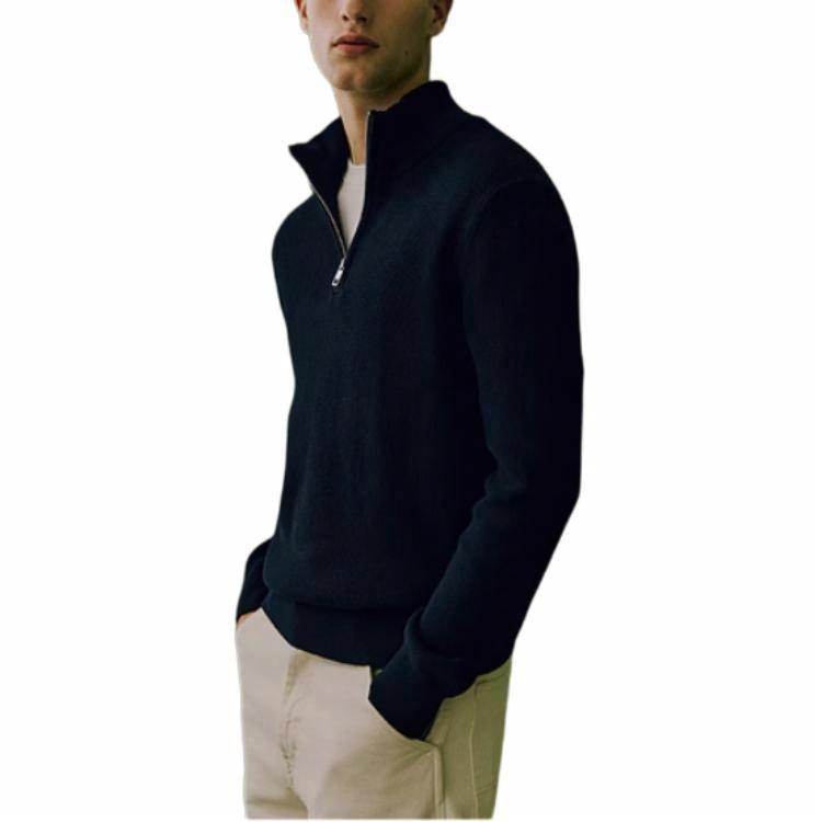 Этот удобный пуловер с полузастежкой на молнии выполнен в темно-синем цвете и оснащён тонким стоячим воротником. Он изготовлен из вязаного материала, что придает ему стильный и уютный вид. Пуловер идеально подходит для холодного времени года и отлично сочетается как с джинсами, так и с брюками, добавляя элегантность и комфорт в мужской гардероб.