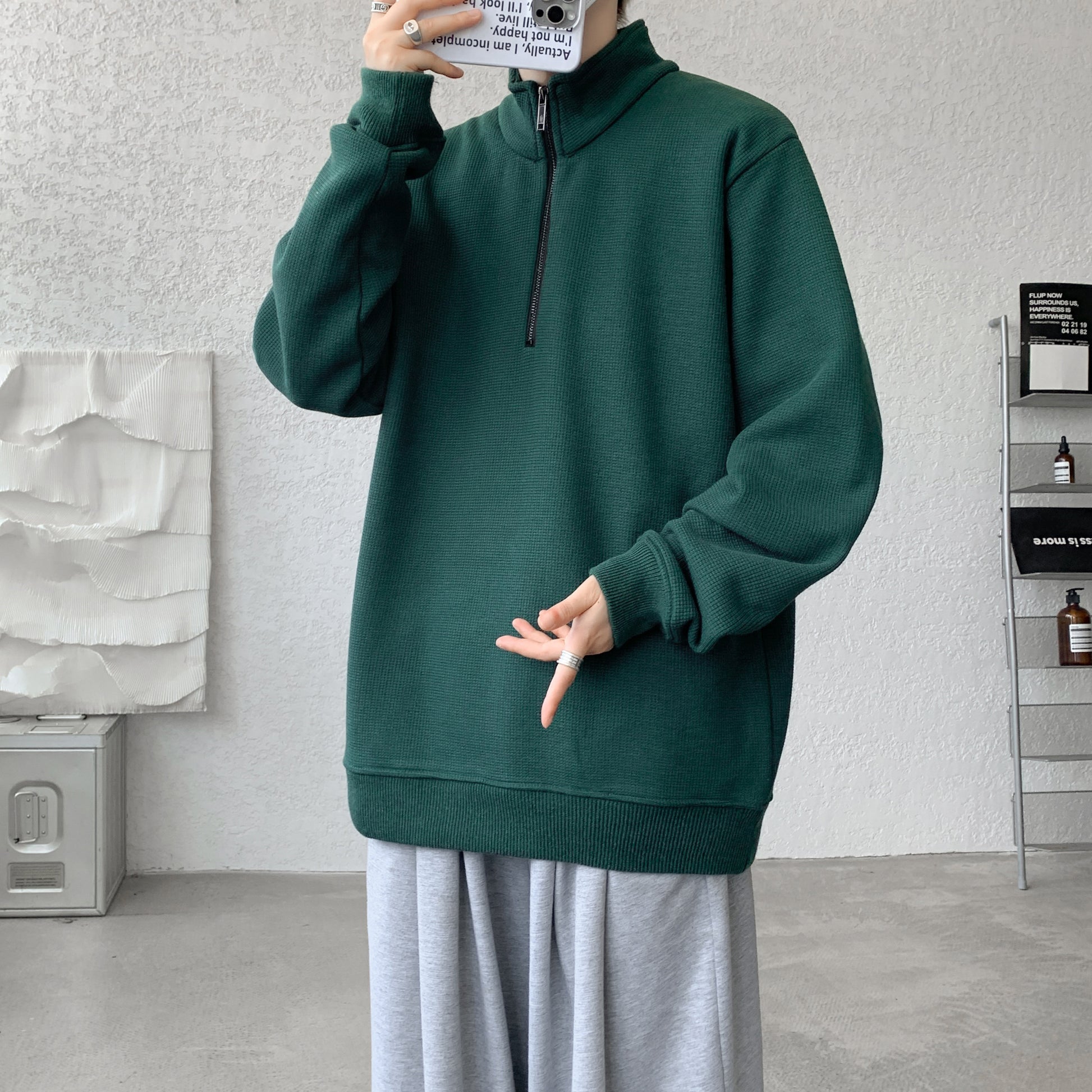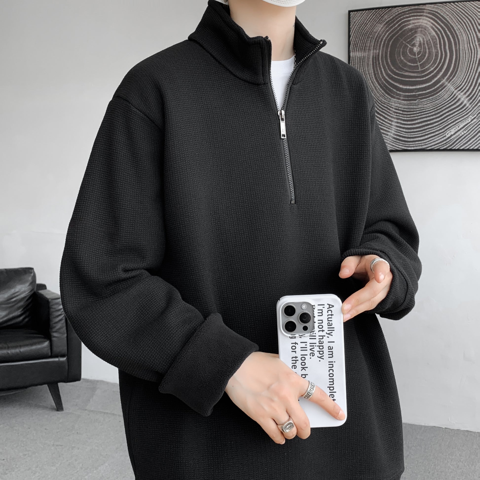 Мужской свитшот H.V.G.A в стиле high street с полузастёжкой и высоким воротником. Свободный крой и плотная ткань делают модель удобной для весенне-осеннего сезона.