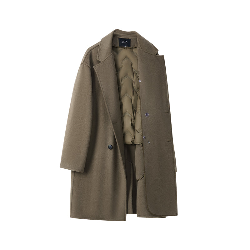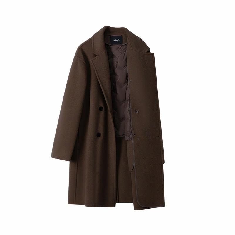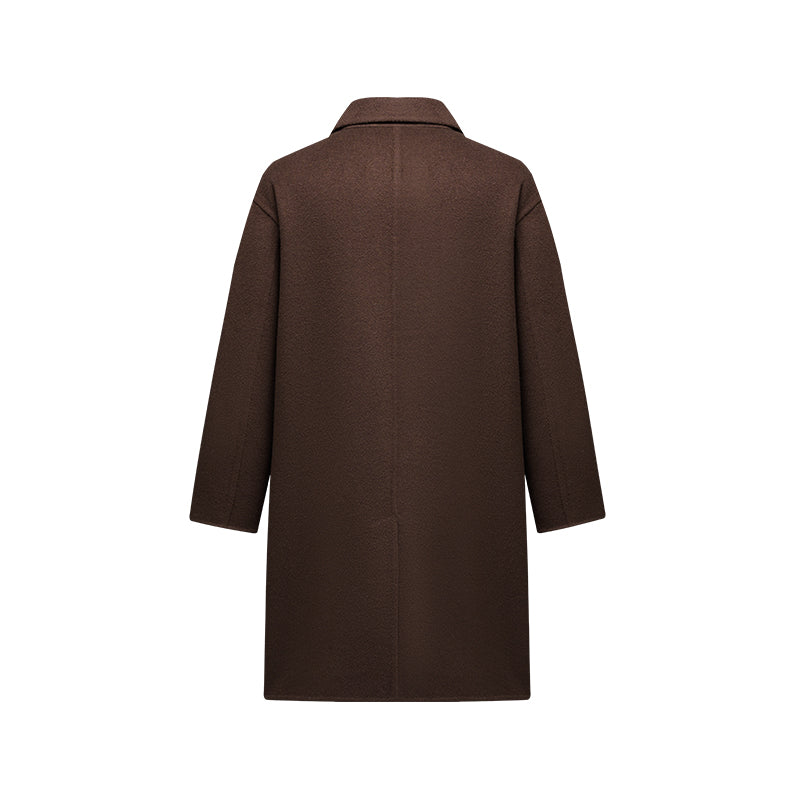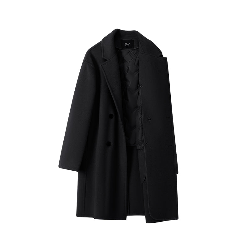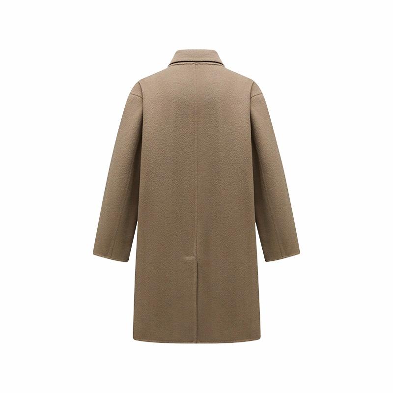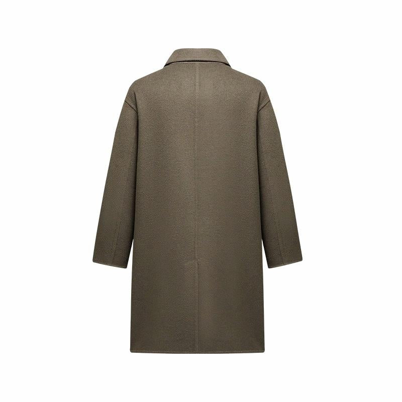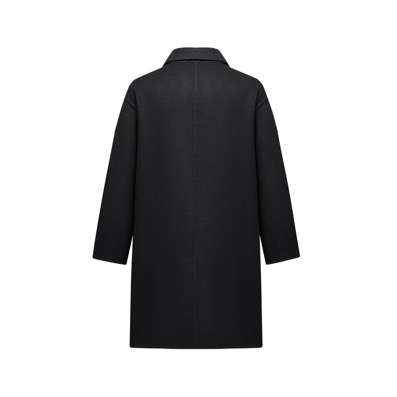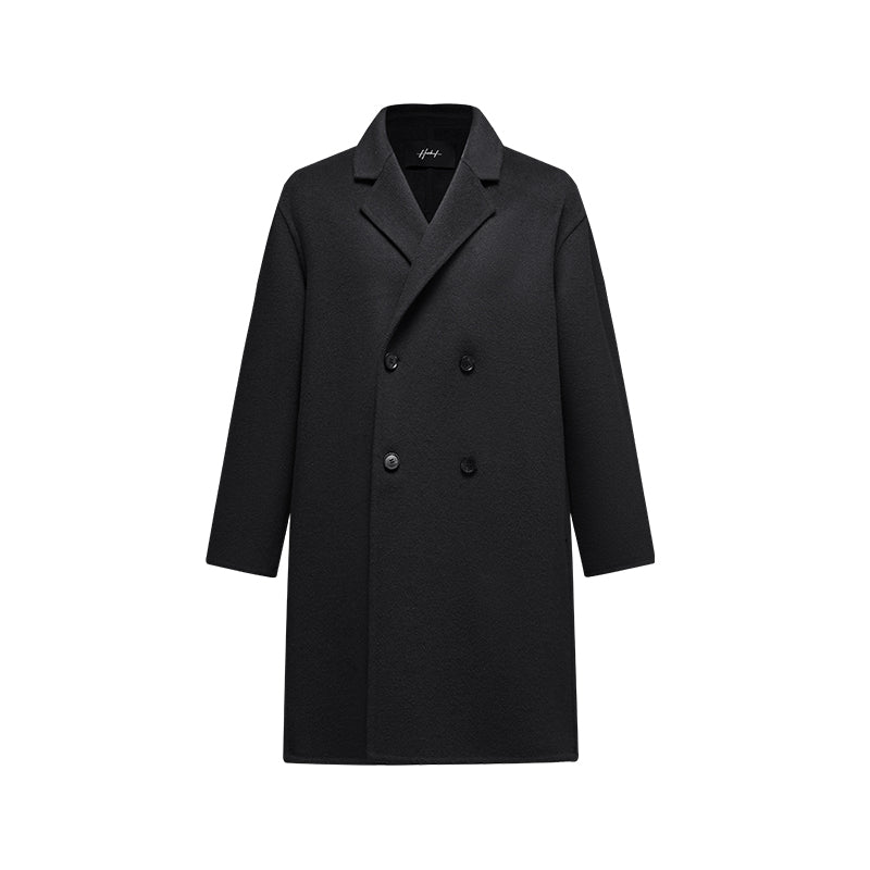 Мужская средняя длины модель с длинными рукавами и двубортной застёжкой на пуговицы, выполнена из шерсти с полиэстеровой подкладкой. Прямой крой и минималистичный дизайн делают пальто универсальным для работы и повседневного использования.