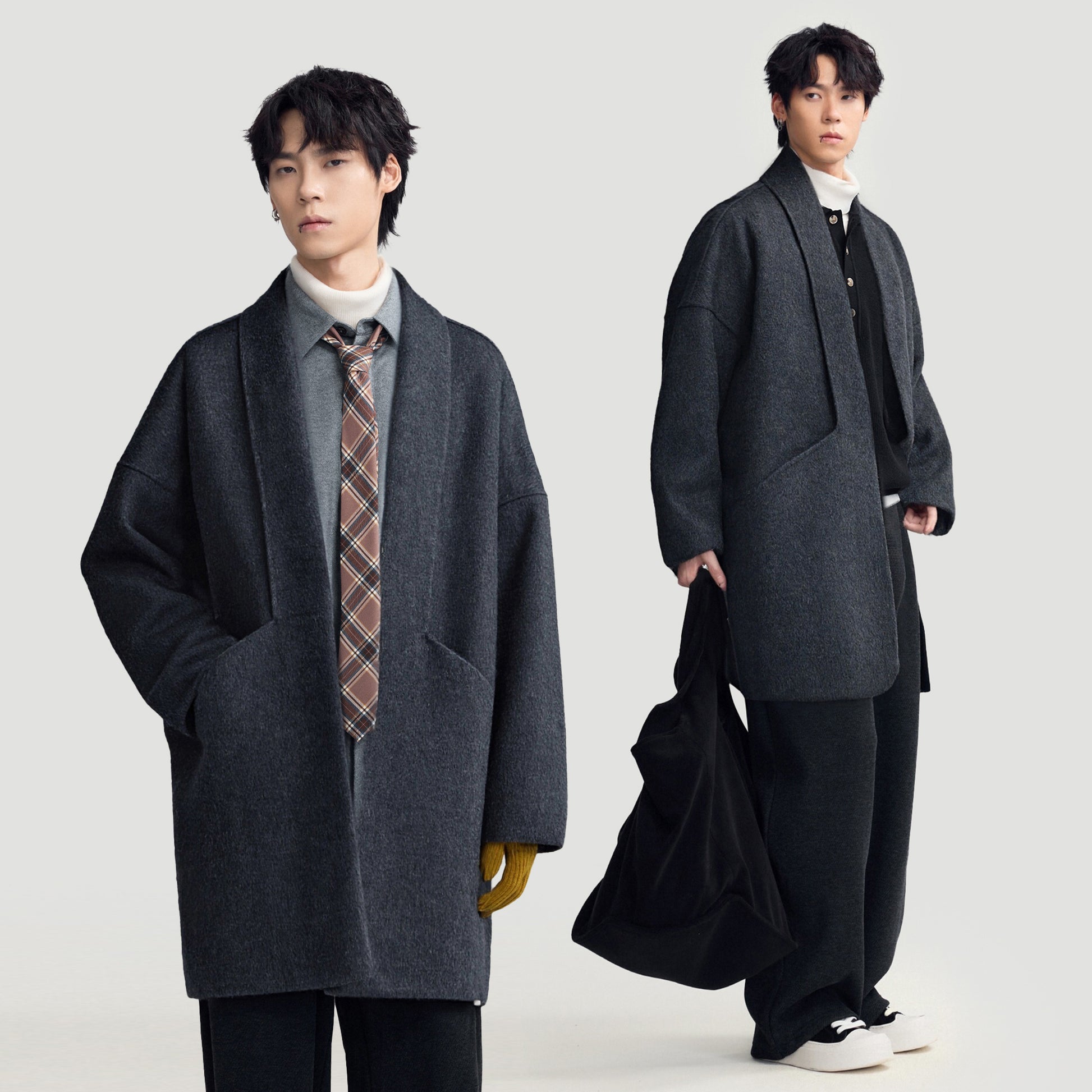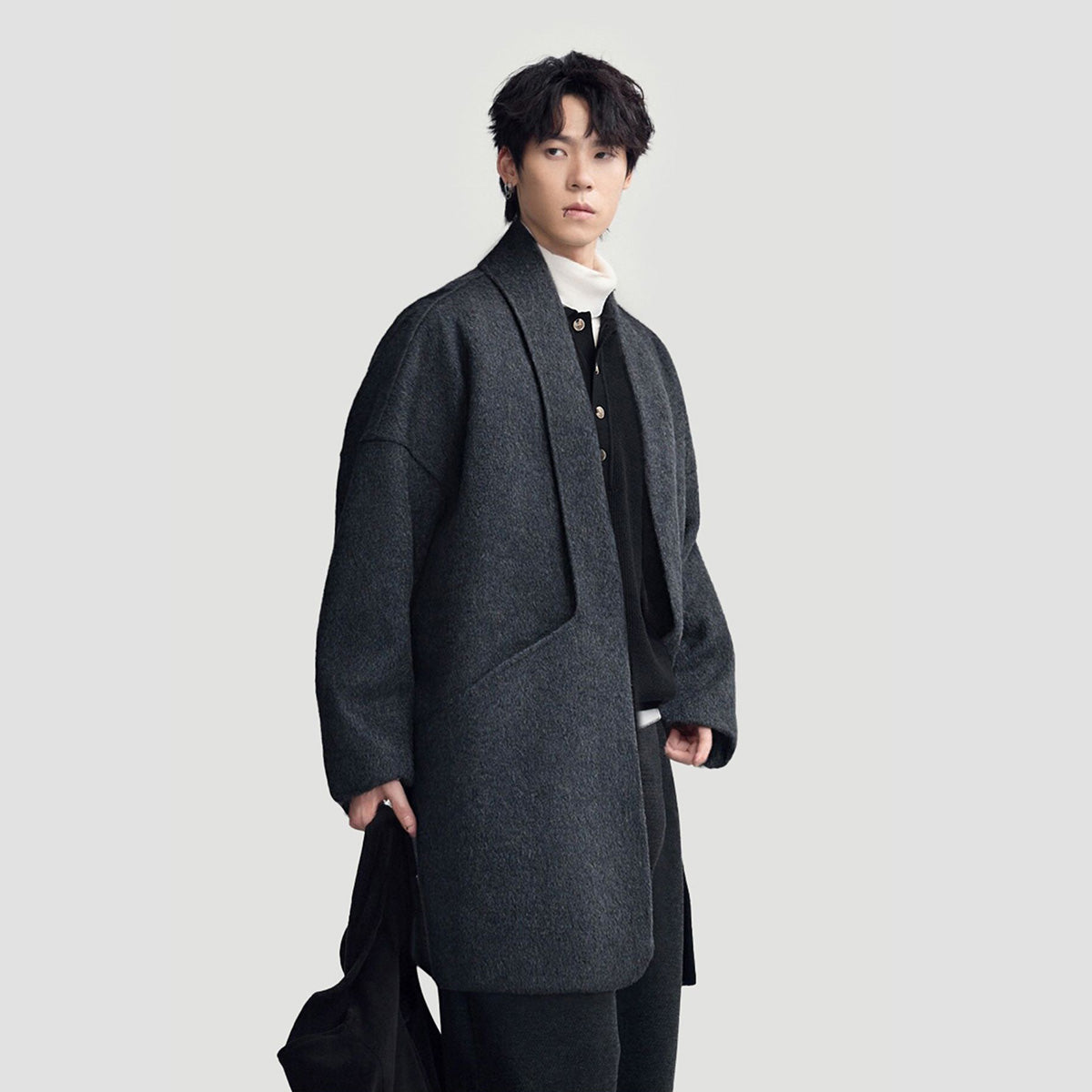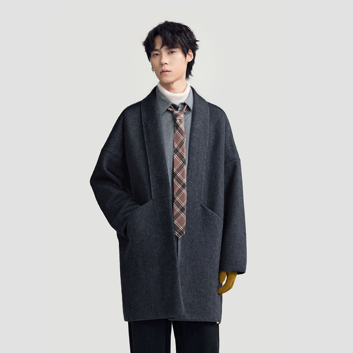 Мужское пальто средней длины с воротником-шарфом и длинными свободными рукавами, выполнено в стильном и комфортном дизайне для повседневной и деловой носки.