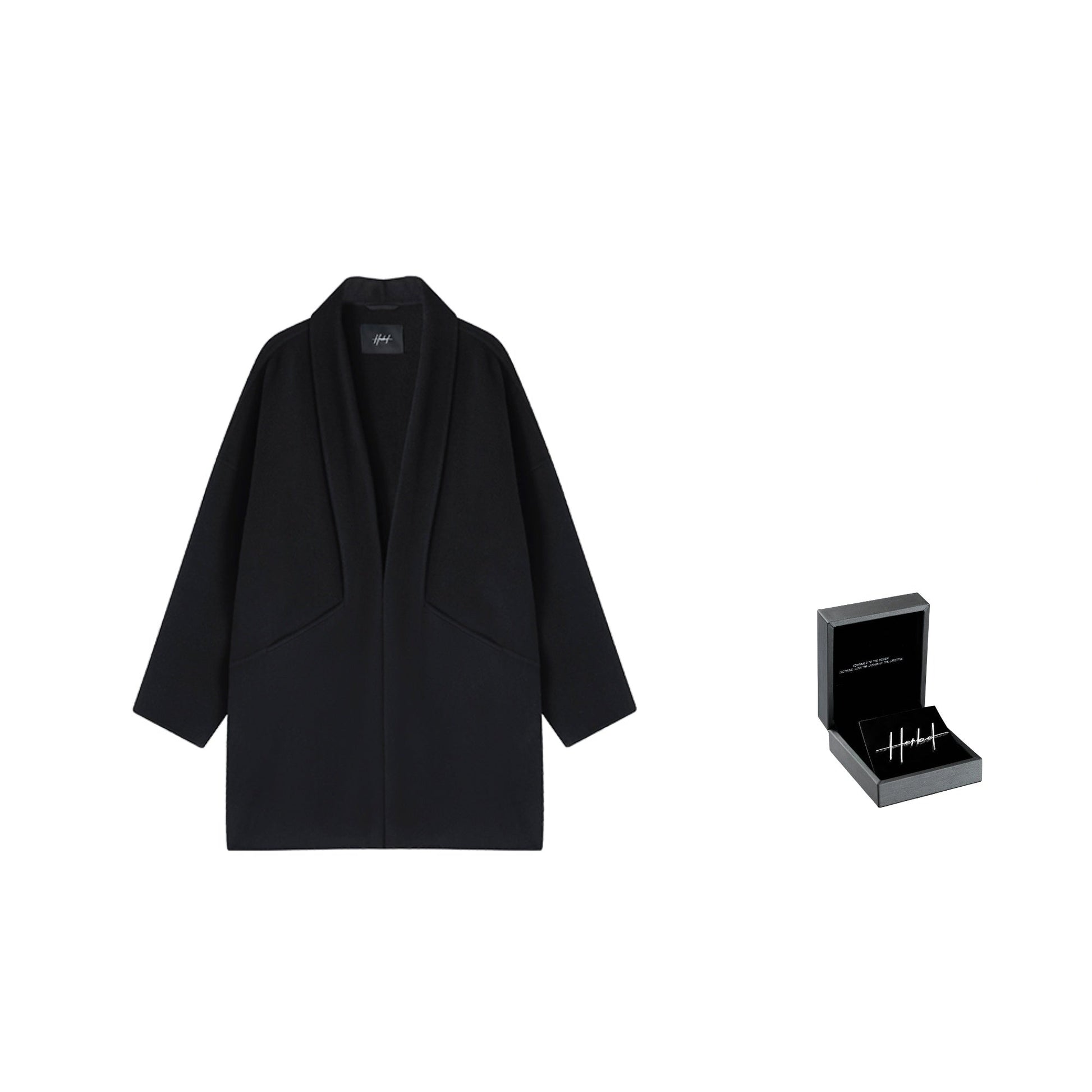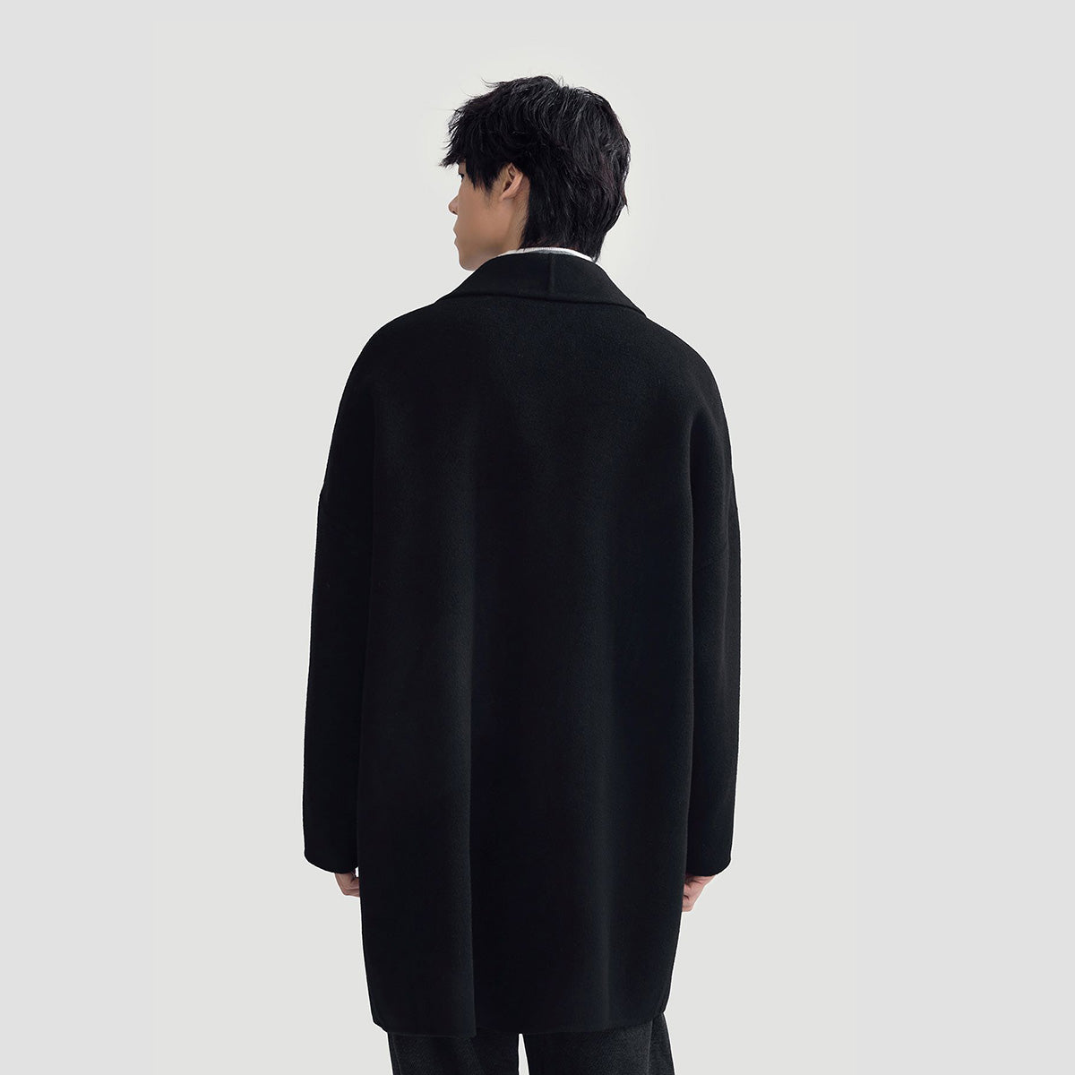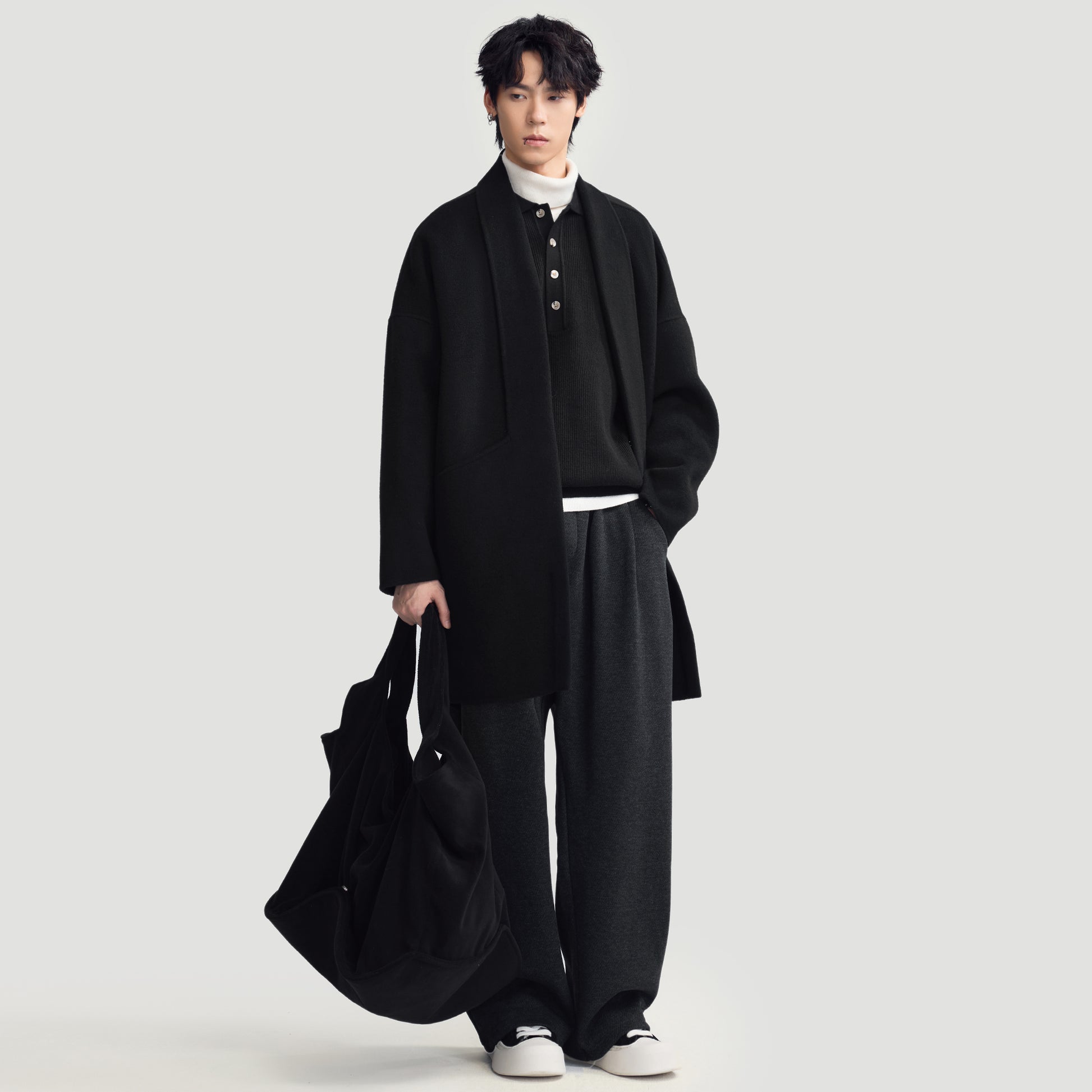 Мужское пальто средней длины с воротником-шарфом и длинными свободными рукавами, выполнено в стильном и комфортном дизайне для повседневной и деловой носки.