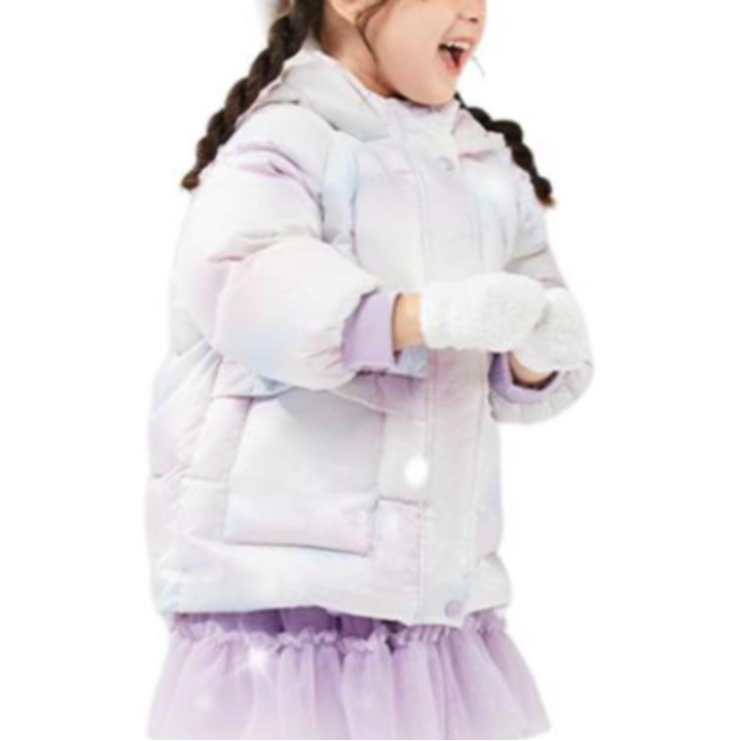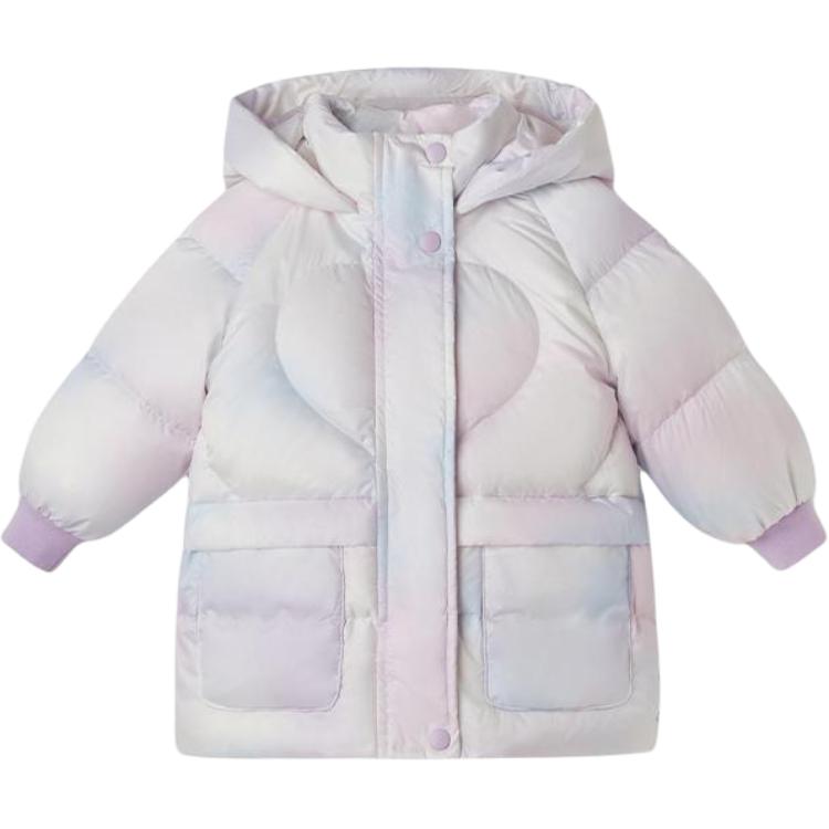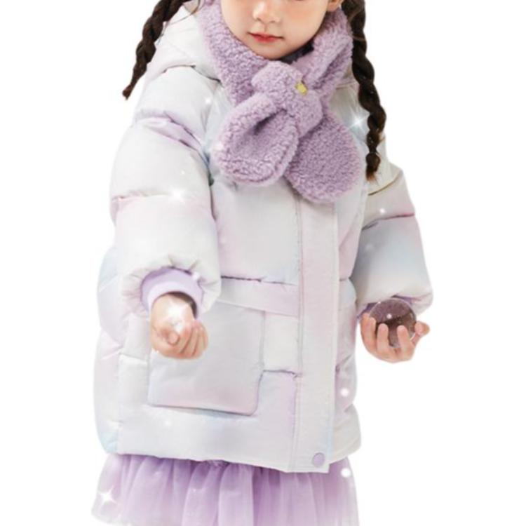 Лоскутный пуховик с капюшоном для детей, свободного кроя и фиолетового цвета. Тёплая и удобная модель для повседневного ношения в холодное время года.