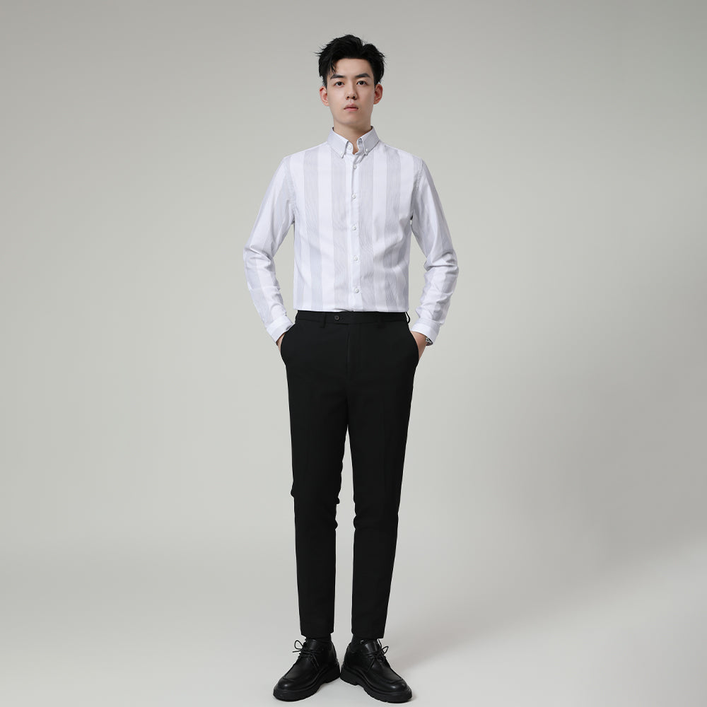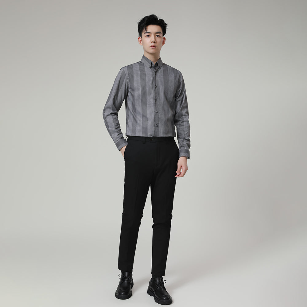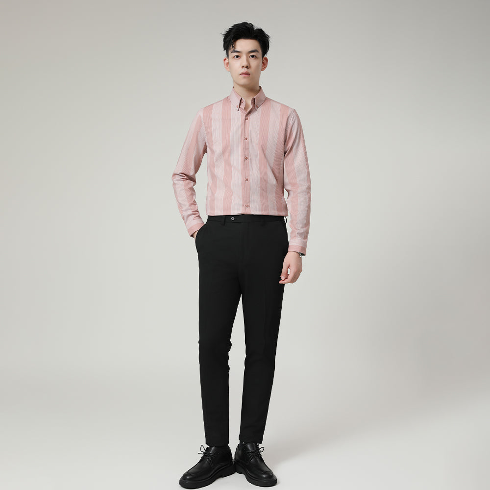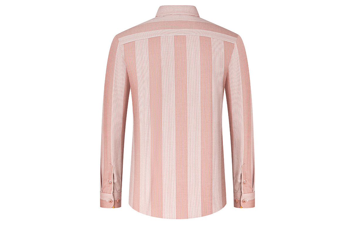 Облегающая элегантная рубашка в деловом стиле с контрастными вертикальными полосами и отложным воротником. Модель из смесовой ткани с вискозой создаёт стильный и утончённый образ для межсезонья.