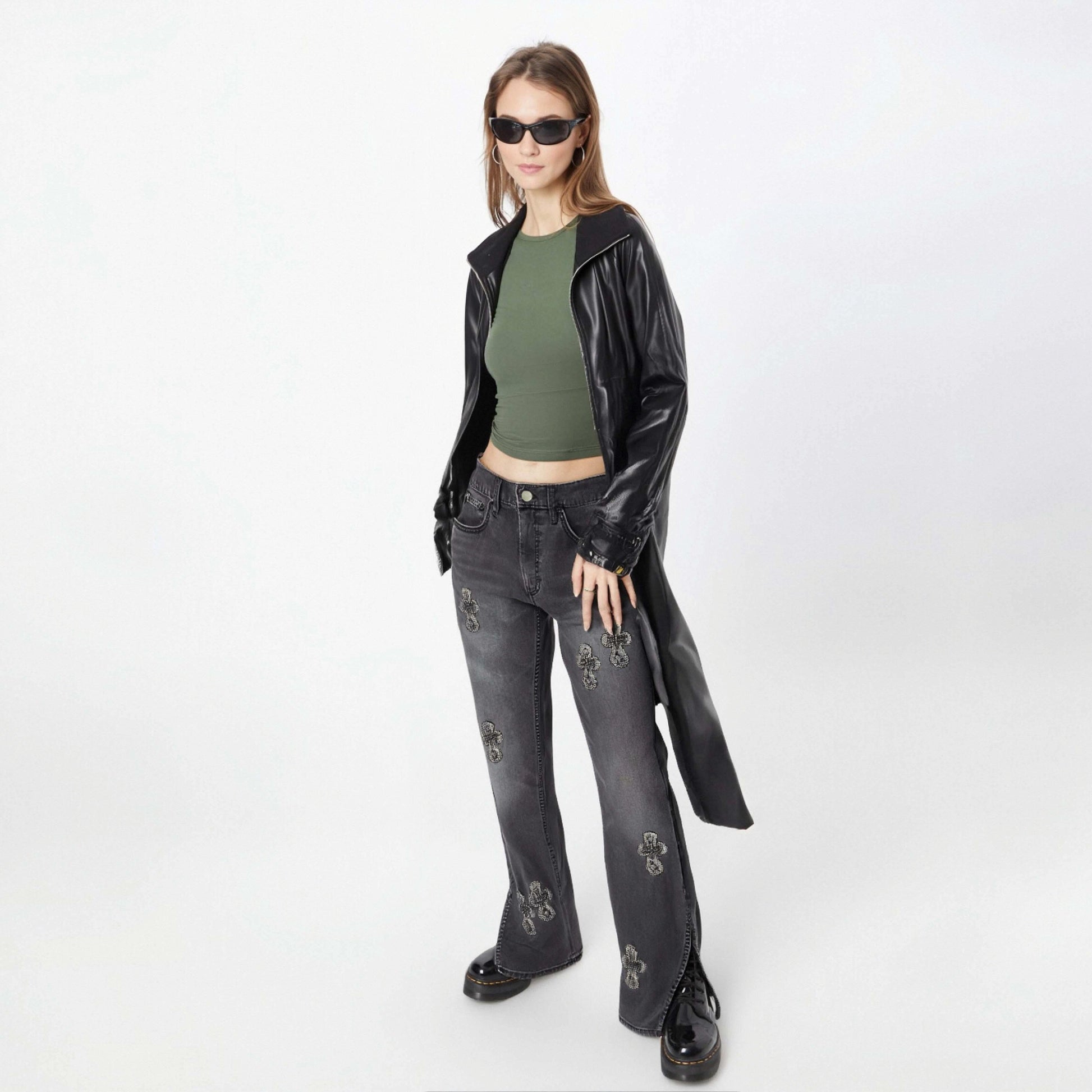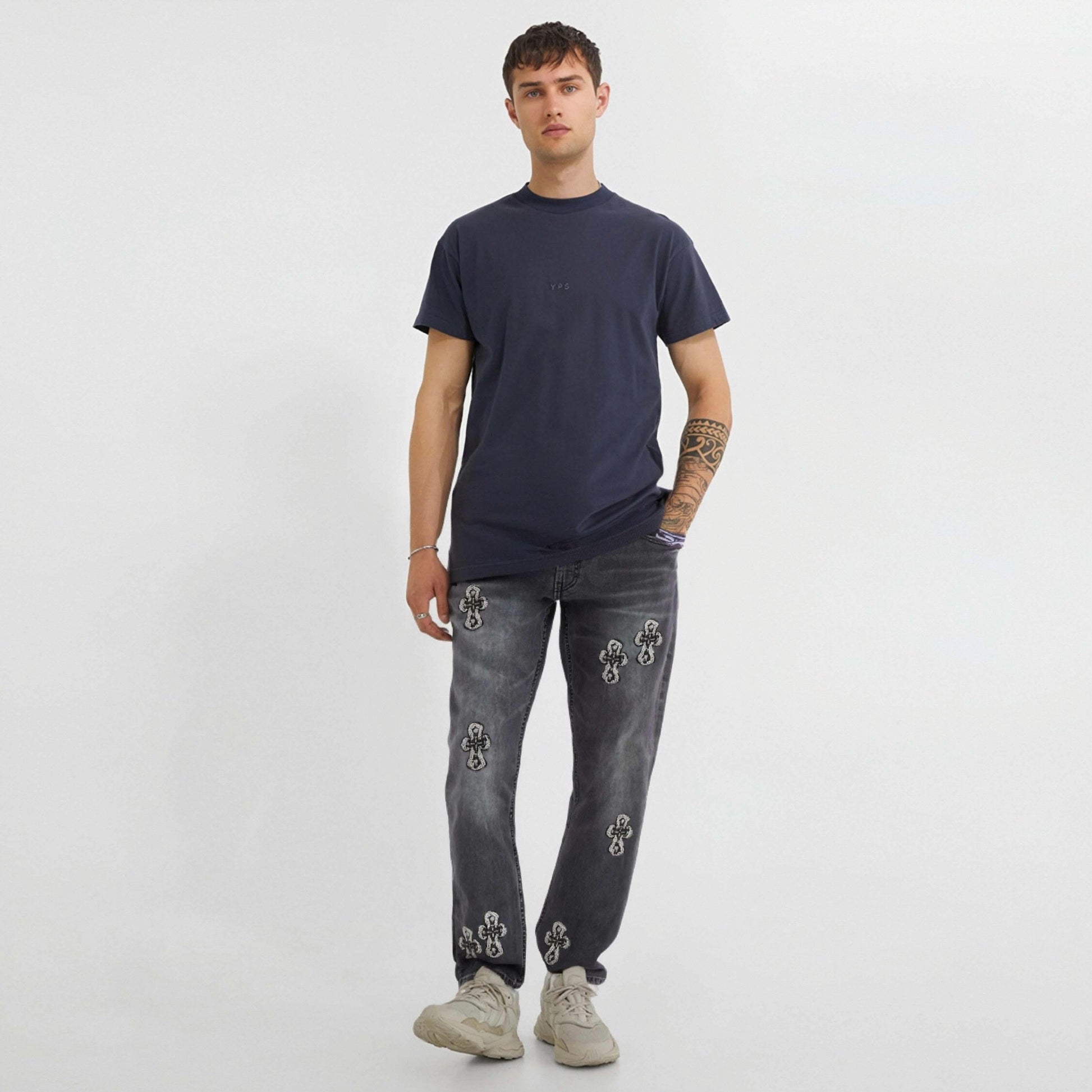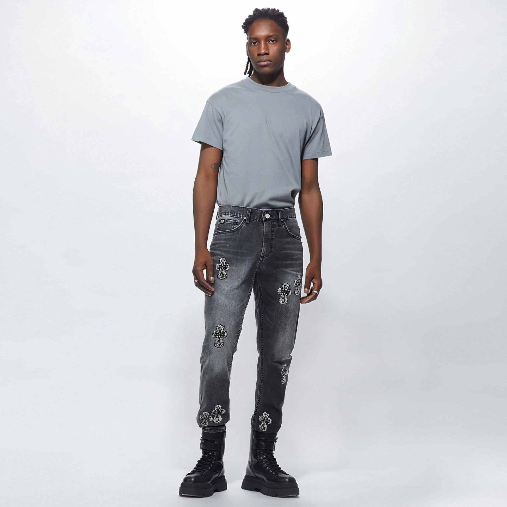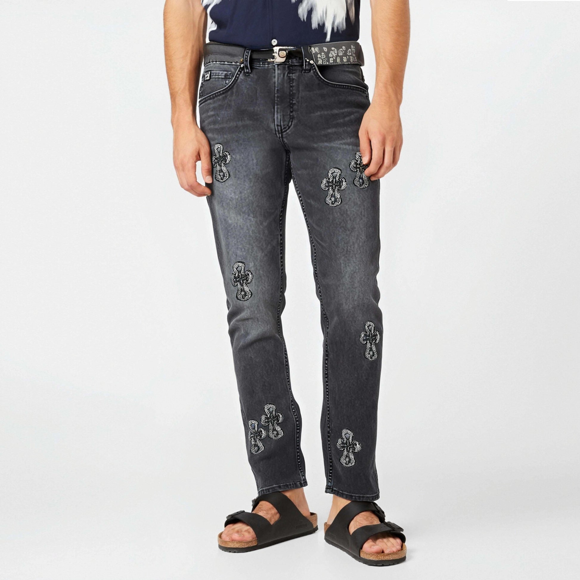 Индивидуальные облегающие джинсы в уличном стиле с вышитым «злым» крестом, бахромой, охлаждающим эффектом и смелой эстетикой. Уникальная модель средней посадки из эластичного смесового хлопка создаёт дерзкий и модный образ для носки в любое время года.