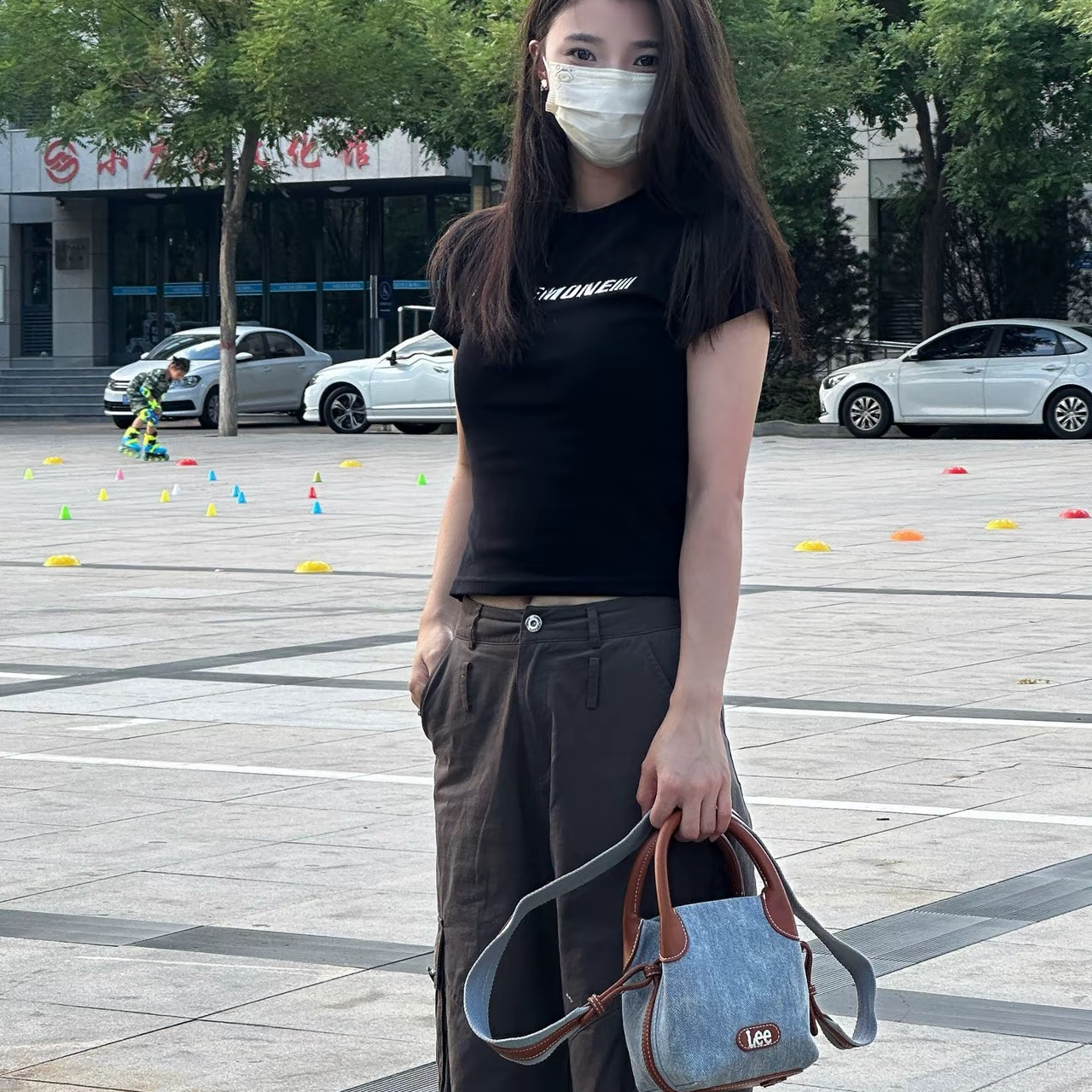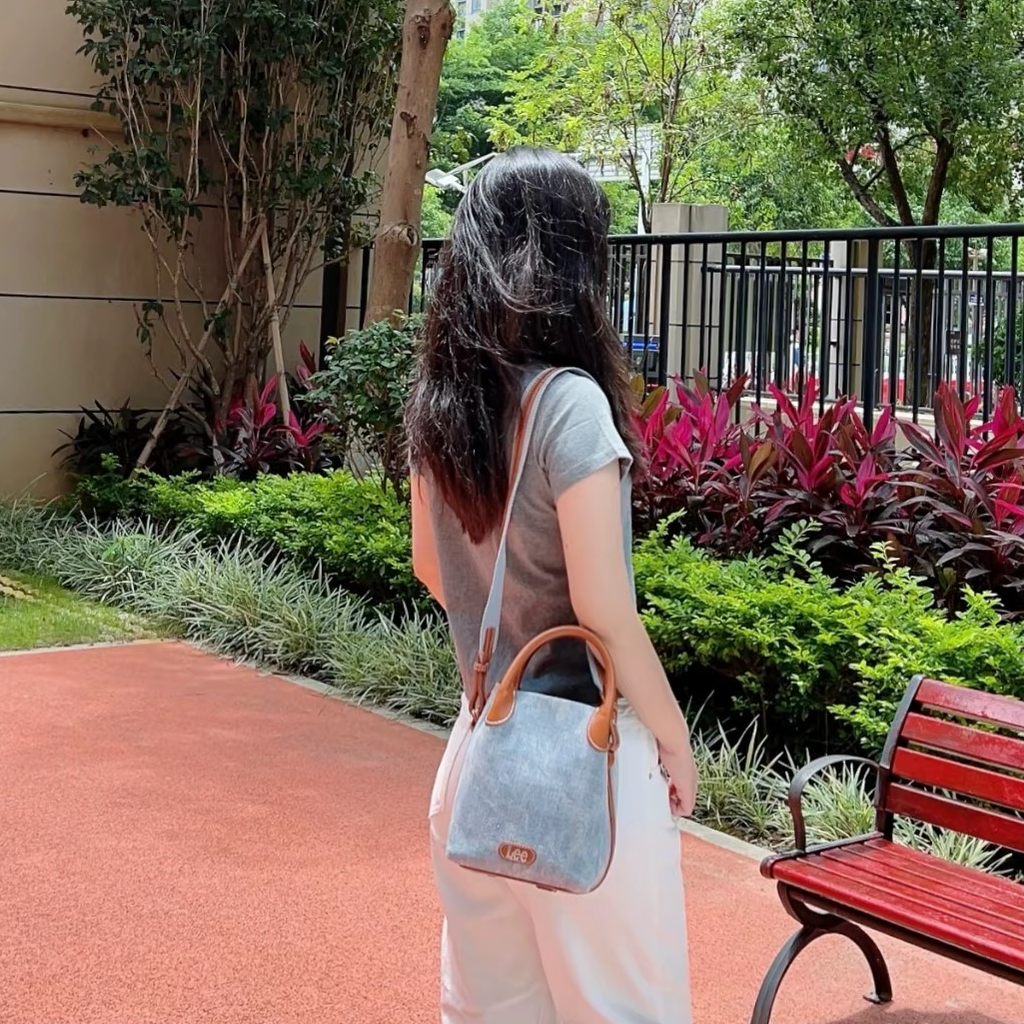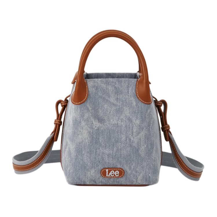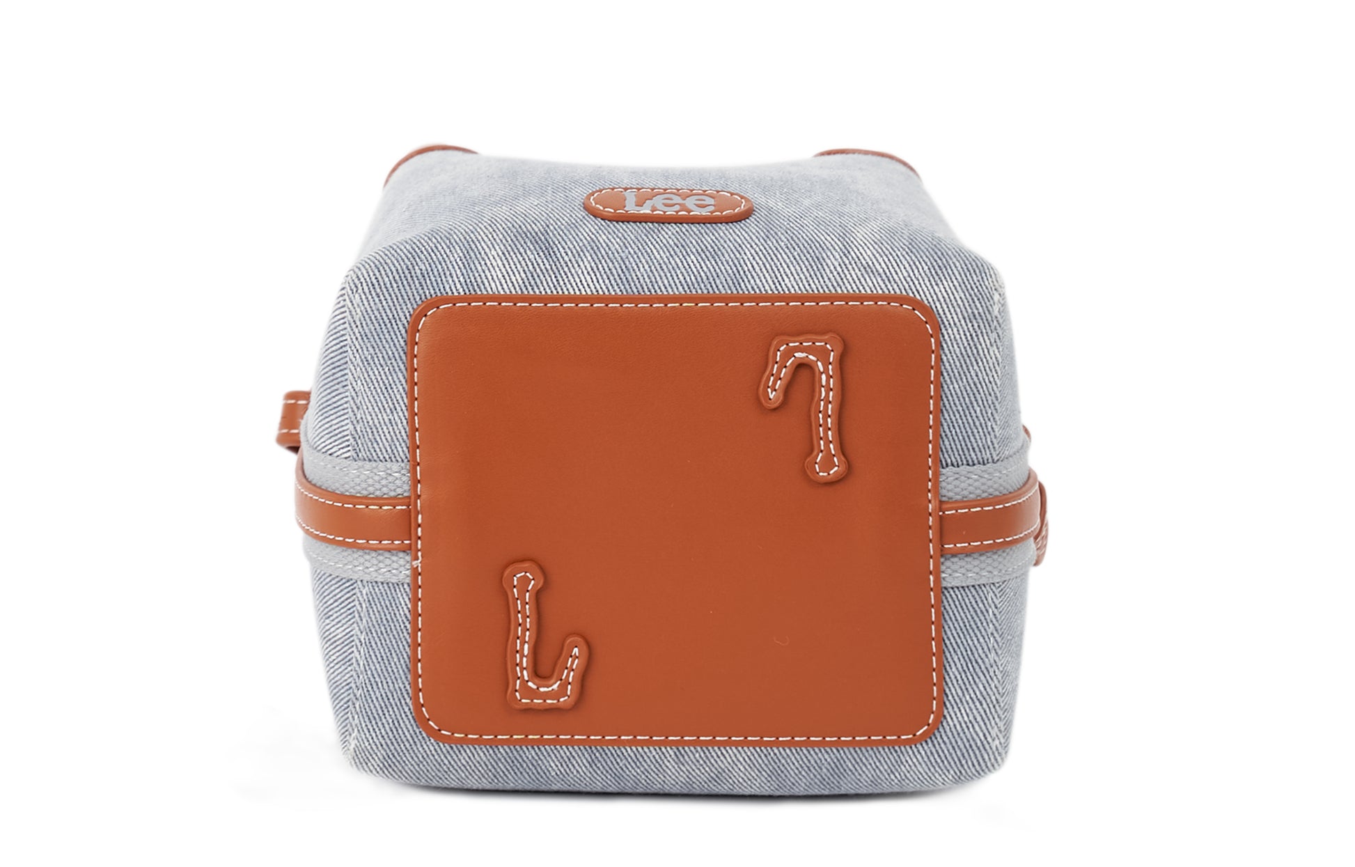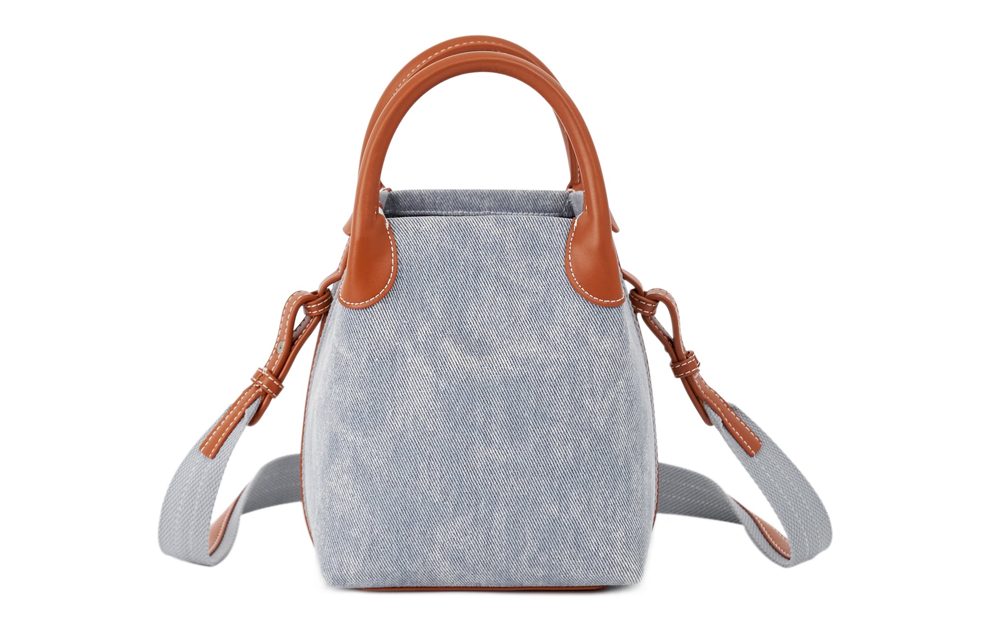 Модная сумка-ведро в стиле «канноли» из жёсткой джинсовой ткани с контрастными элементами. Функциональная модель среднего размера со съёмным ремнём подходит для повседневного использования и офиса.