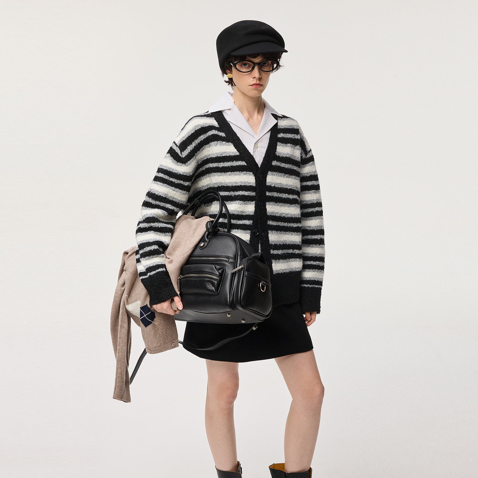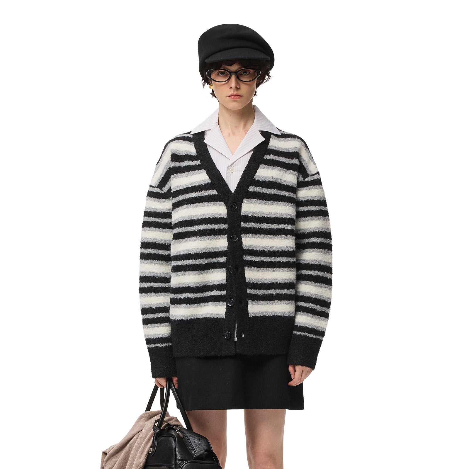 Свободный кардиган в американском уличном стиле с комбинированными полосами, V-образным вырезом и спущенным плечом. Уютная модель из смесовой пряжи с шерстью на пуговицах подходит для осеннего сезона.
