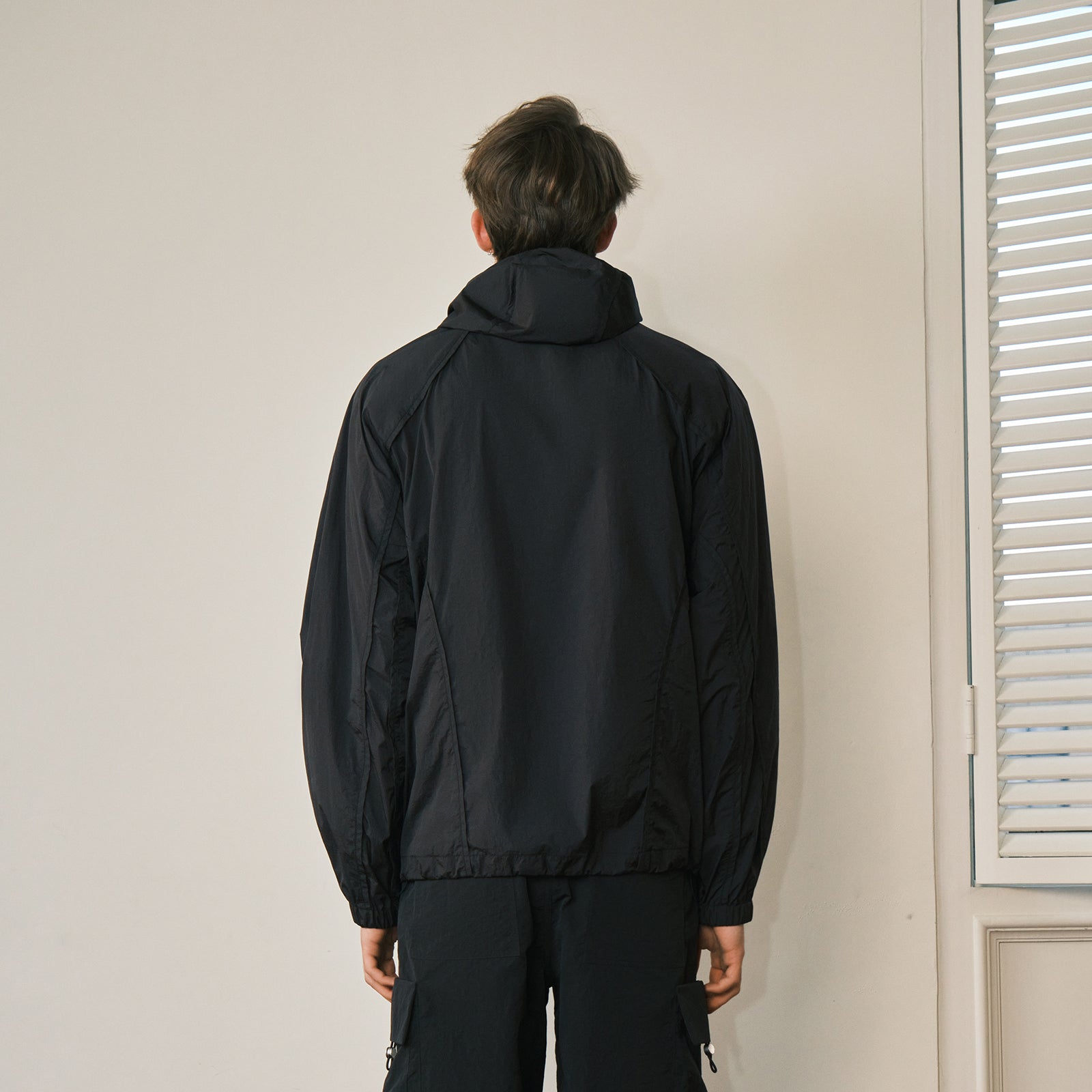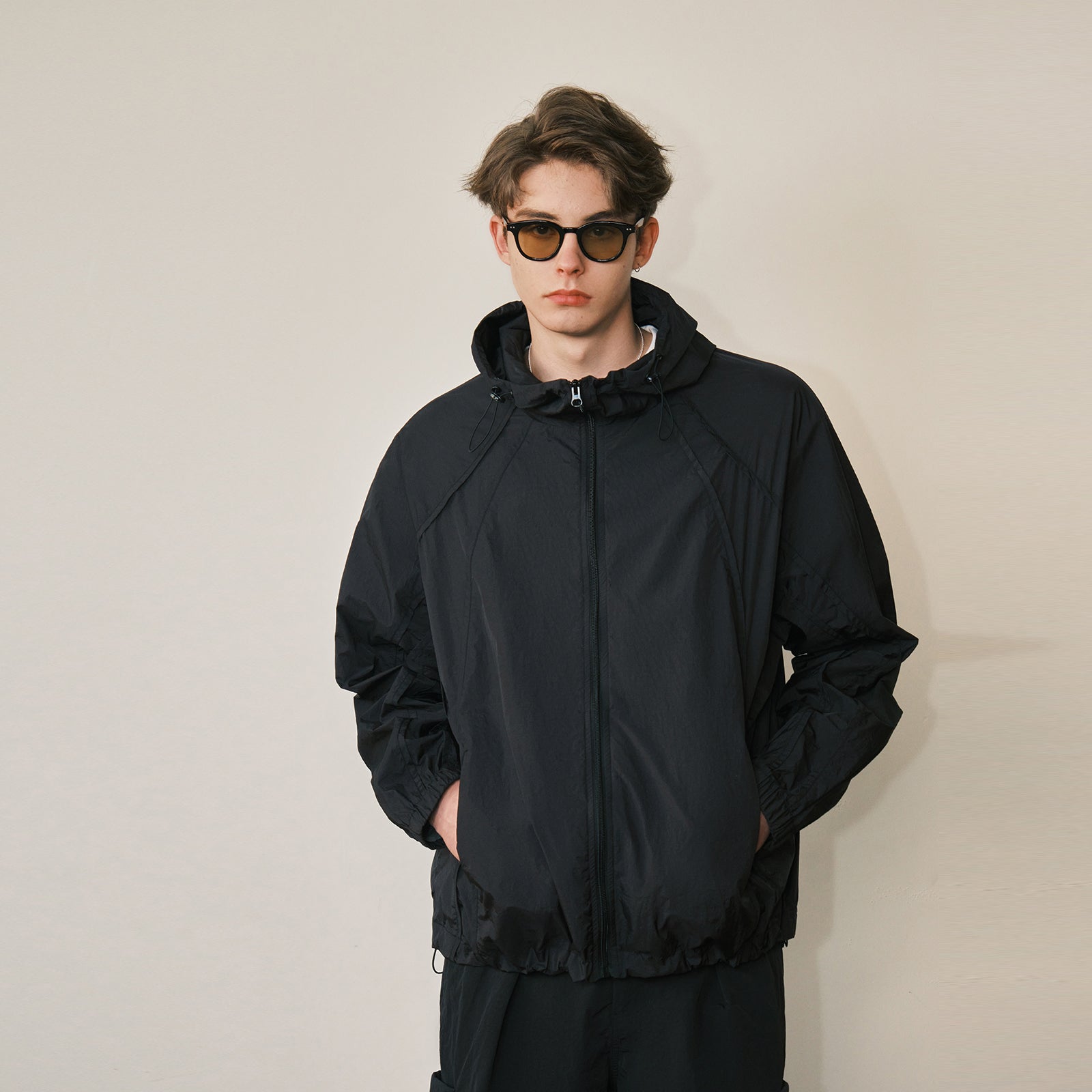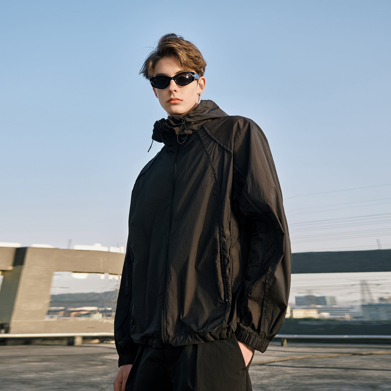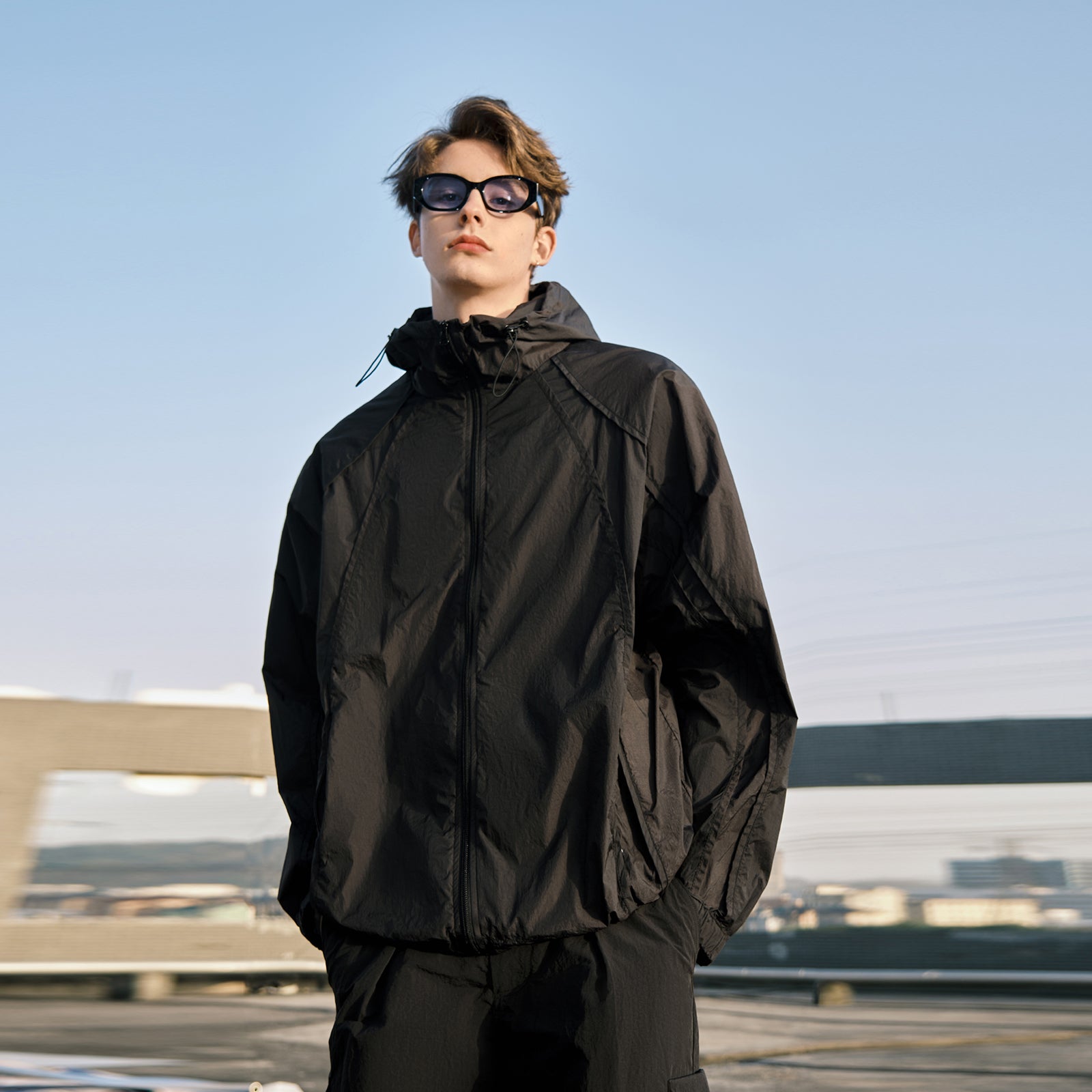 Мужская легкая ветровка свободного кроя с капюшоном, молнией и кроем реглан из смесовой ткани. Модель с защитой от ультрафиолета UPF 50+ и структурным силуэтом в стиле Cleanfit для летней носки.