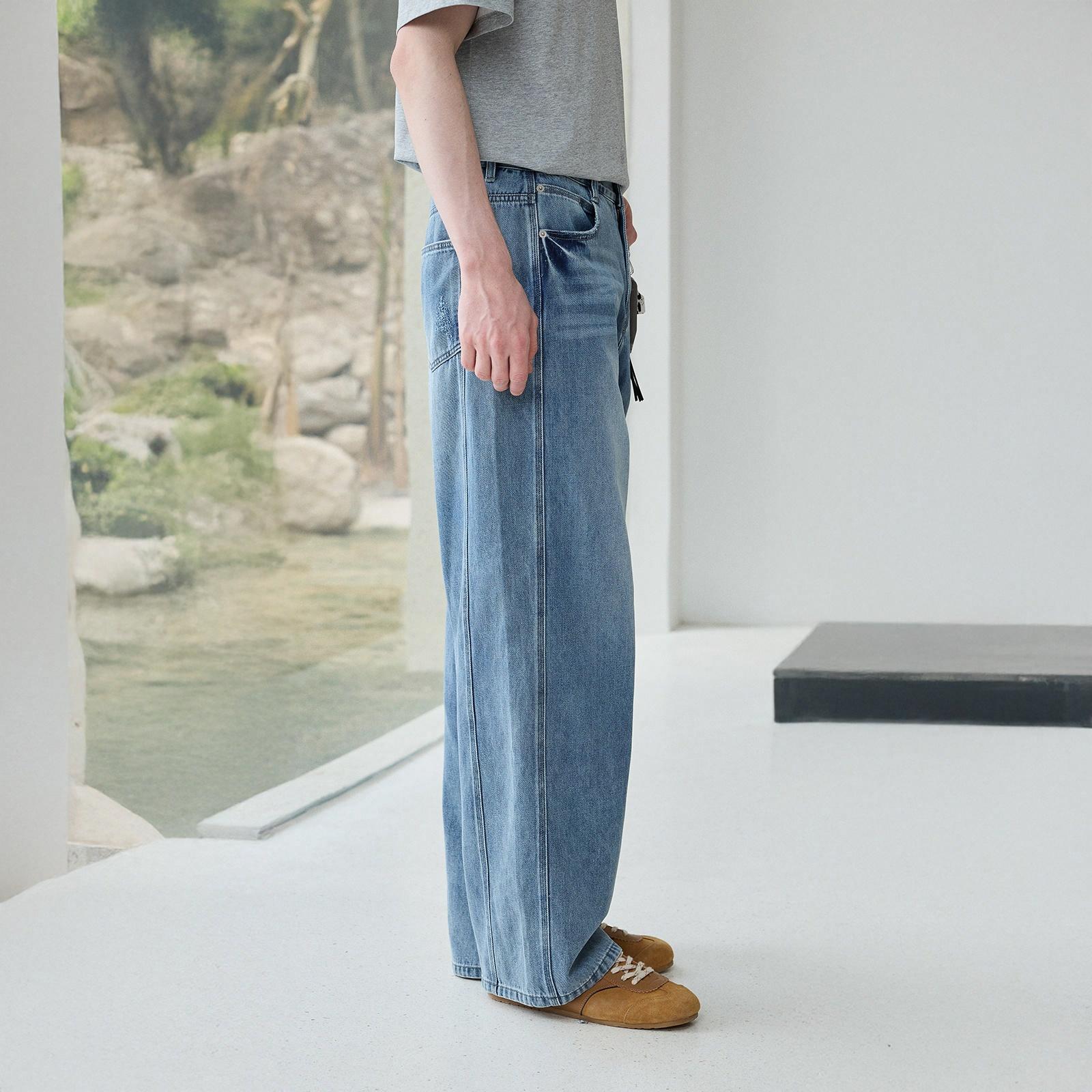 Свободные джинсы прямого кроя в корейском стиле с декоративной строчкой и лёгкой тканью. Универсальная модель средней посадки из смесового хлопка обеспечивает комфорт и создаёт расслабленный образ для летнего сезона.
