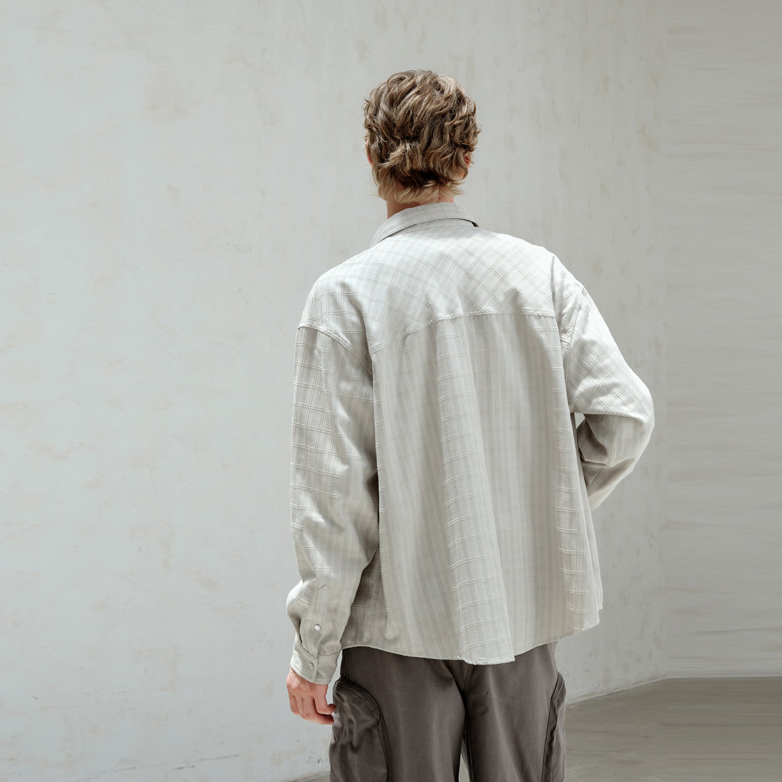 Рубашка свободного кроя с клетчатым узором и деконструированными деталями, выполненная в винтажном стиле. Модель с воротником-стойкой, заниженной линией плеча и застежкой на пуговицах подходит для умных кэжуал-образов.