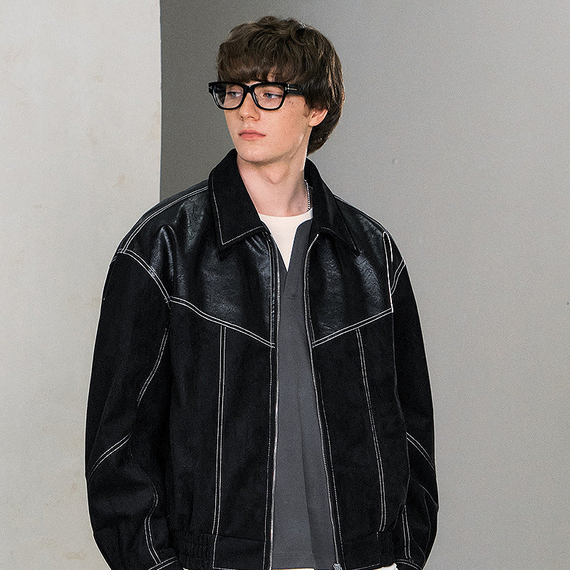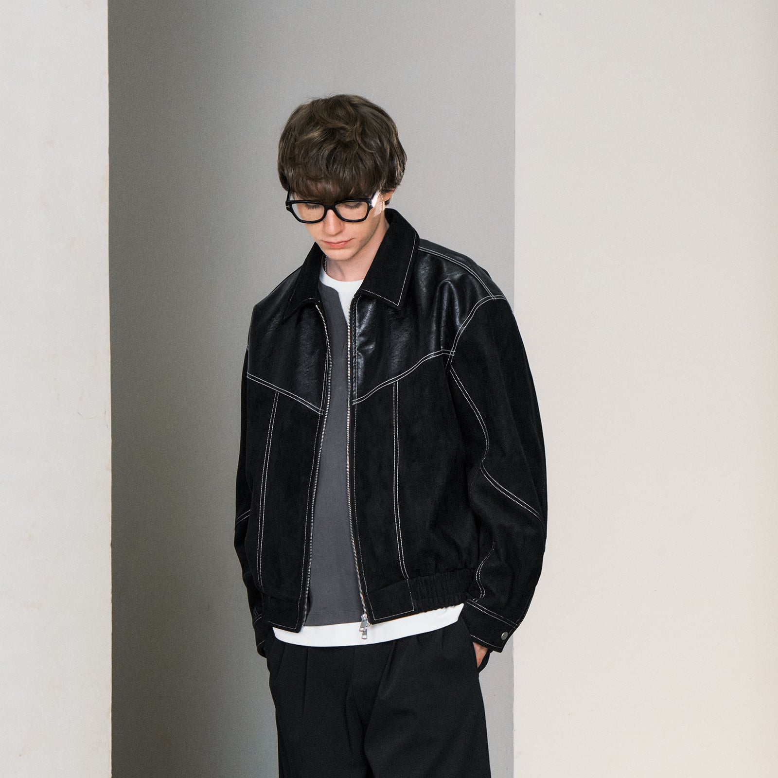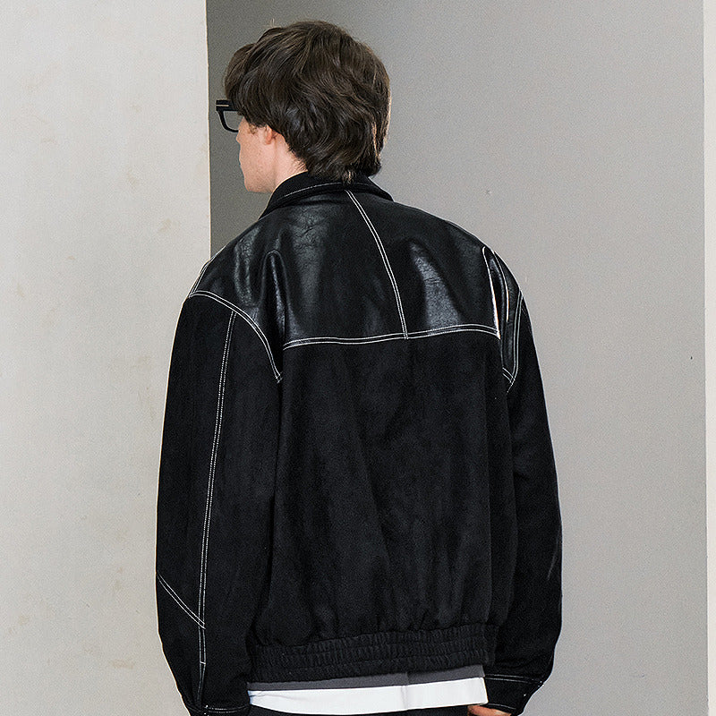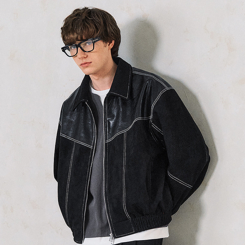 Уличная куртка в свободном крое с эффектом искусственной замши и контрастными вставками. Модель с отложным воротником и застежкой-молнией украшена декоративной стежкой. Выразительный дизайн для создания стильного образа.