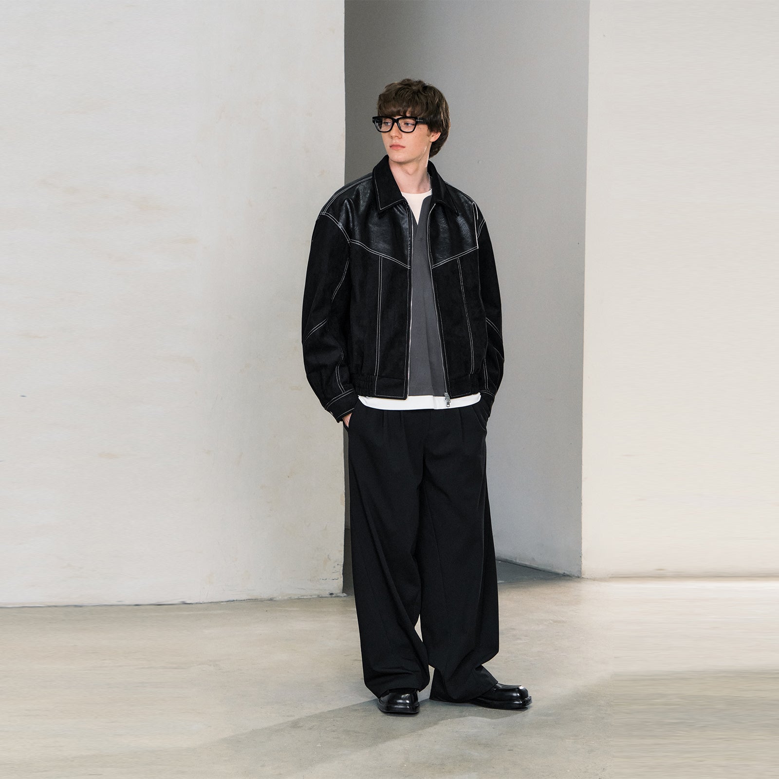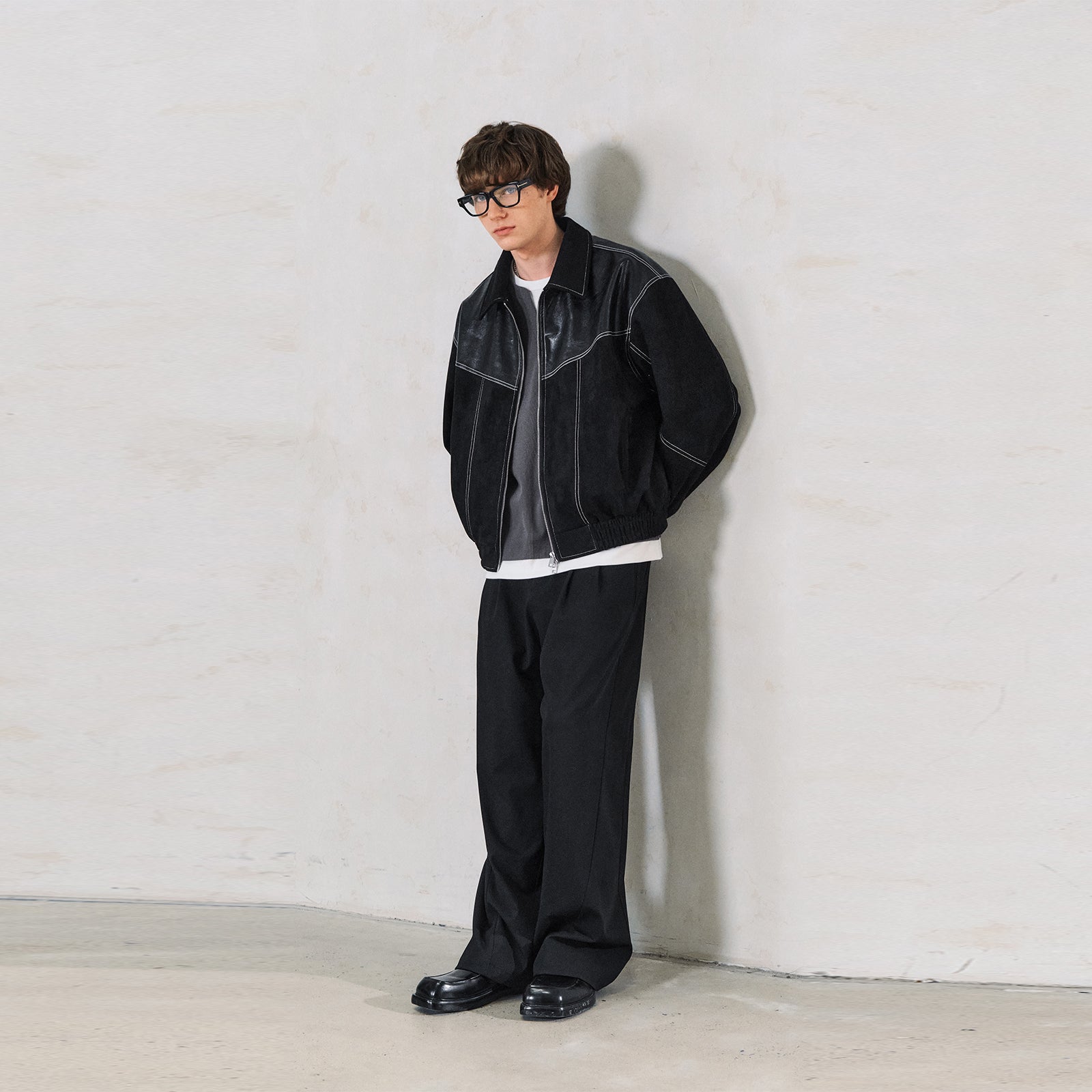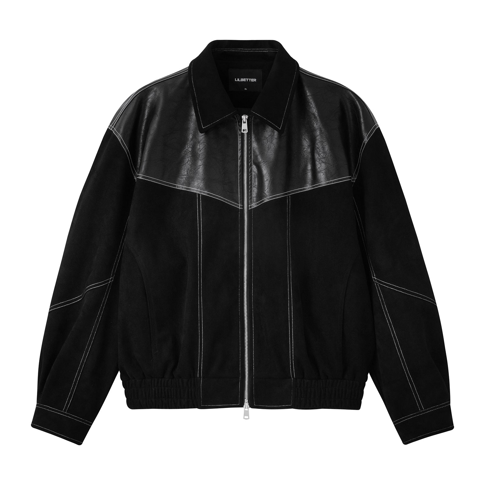 Уличная куртка в свободном крое с эффектом искусственной замши и контрастными вставками. Модель с отложным воротником и застежкой-молнией украшена декоративной стежкой. Выразительный дизайн для создания стильного образа.