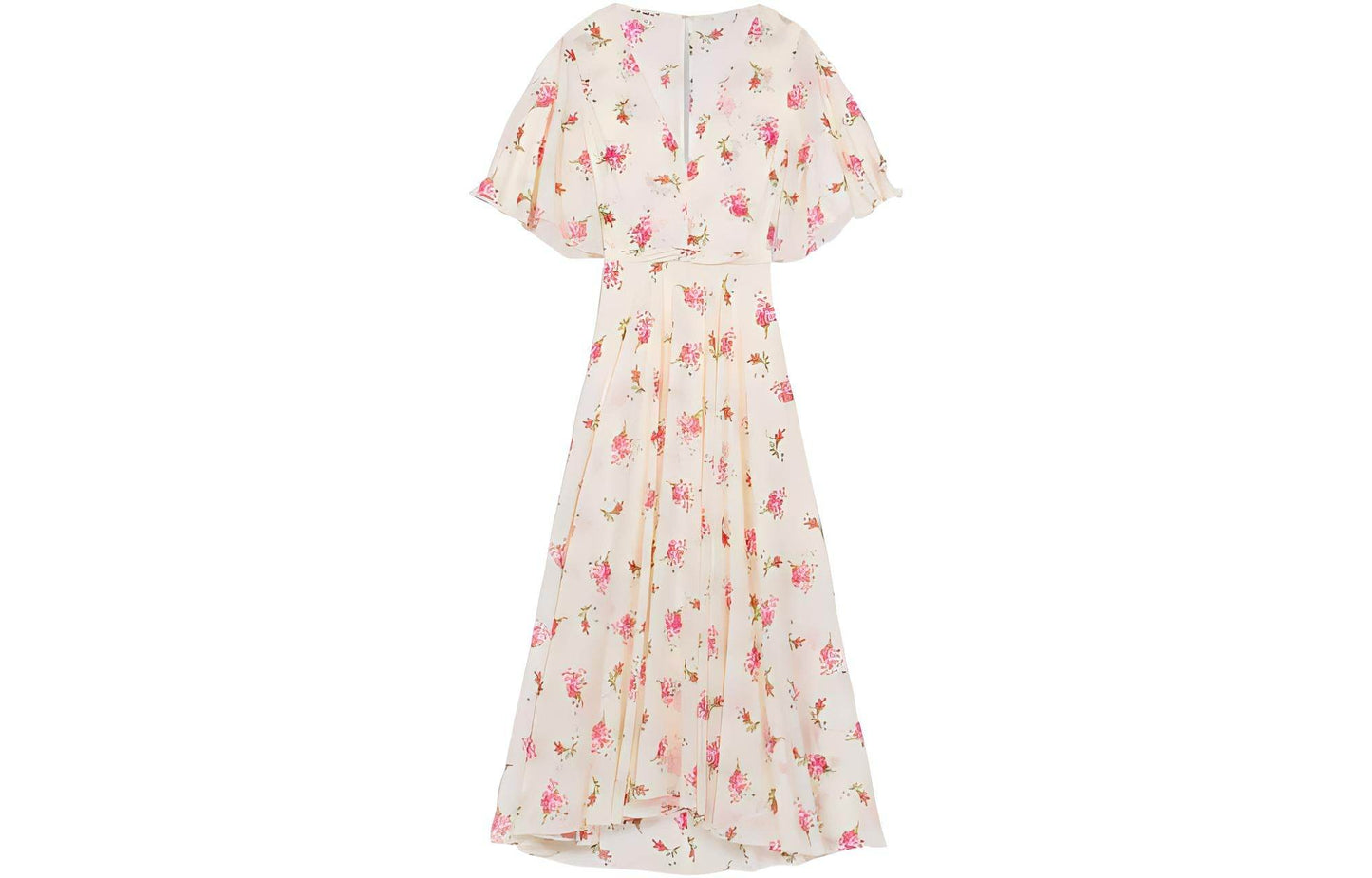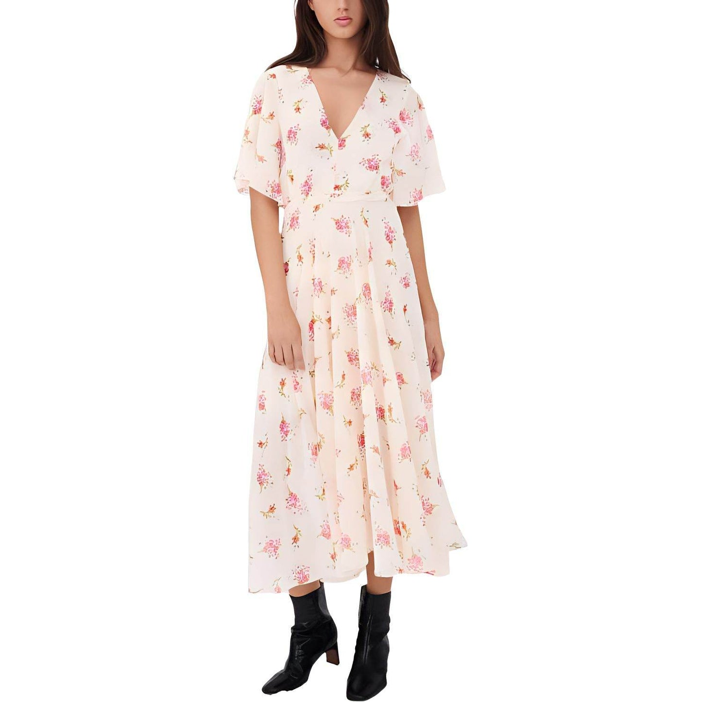 Платье Maje FW22 с цветочным принтом, выполненное в бежевом цвете. С V-образным вырезом и оборками на коротких рукавах, это элегантное платье сочетает в себе романтичный стиль и комфорт, идеально подходит для весенне-летнего сезона.