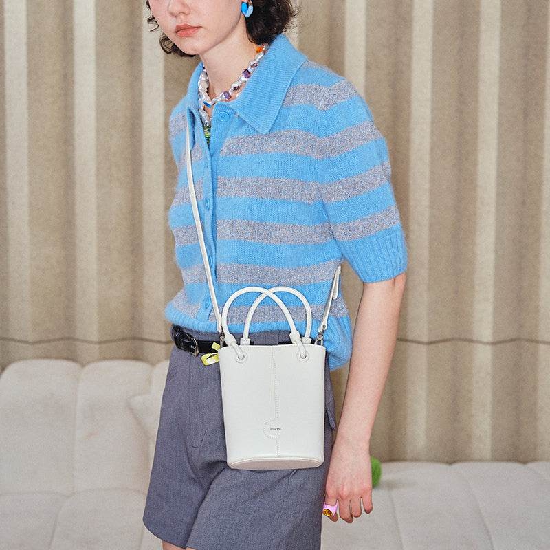 Сумка Muva "Ведро" с нишевым дизайном, выполненная из воловьей кожи в простом чистом цвете. Эта стильная сумка через плечо и тоут небольшого размера доступна в вариантах молочный коктейль белый, кремовый желтый, сумеречно черный и вечерний красный, что делает её идеальным аксессуаром для любого случая.
