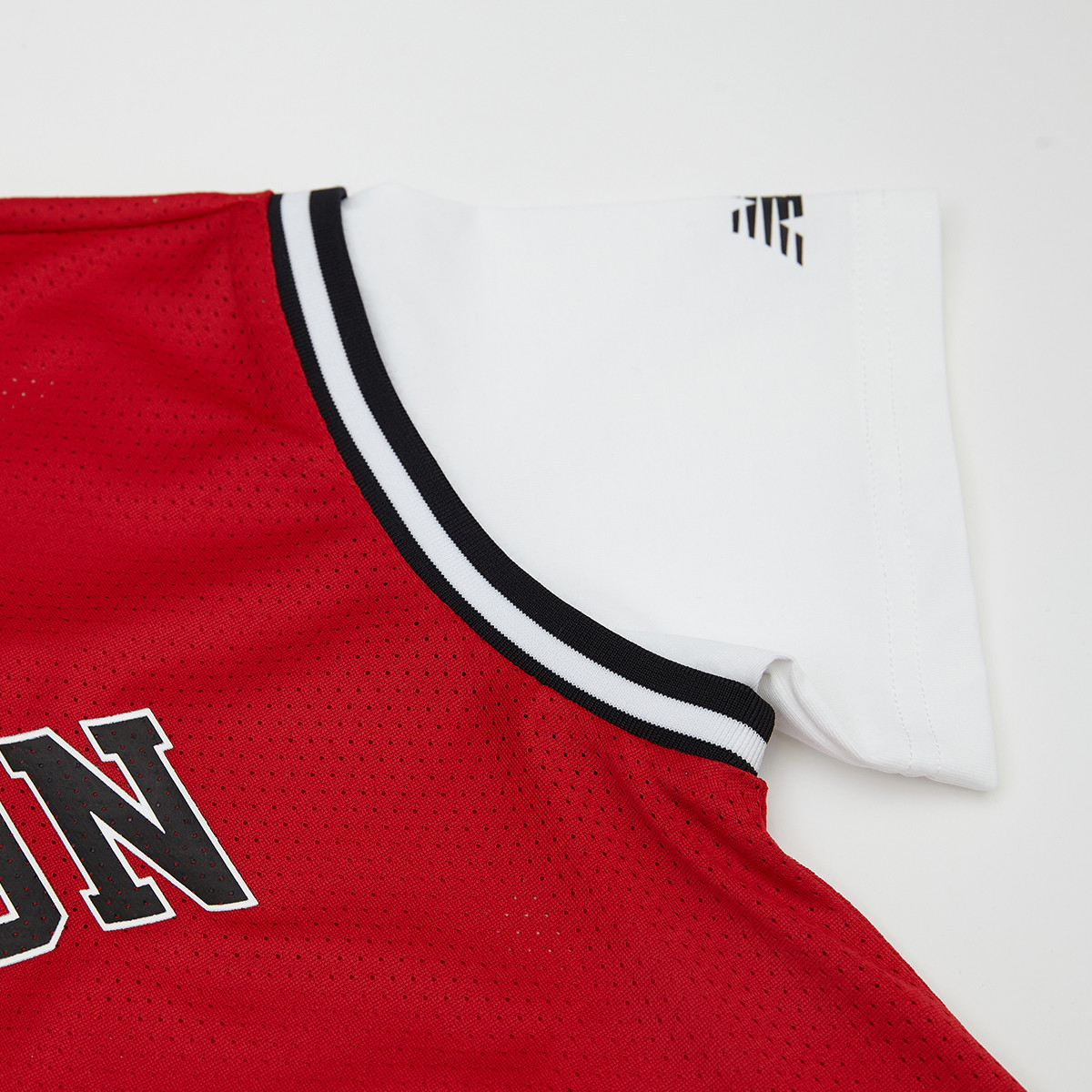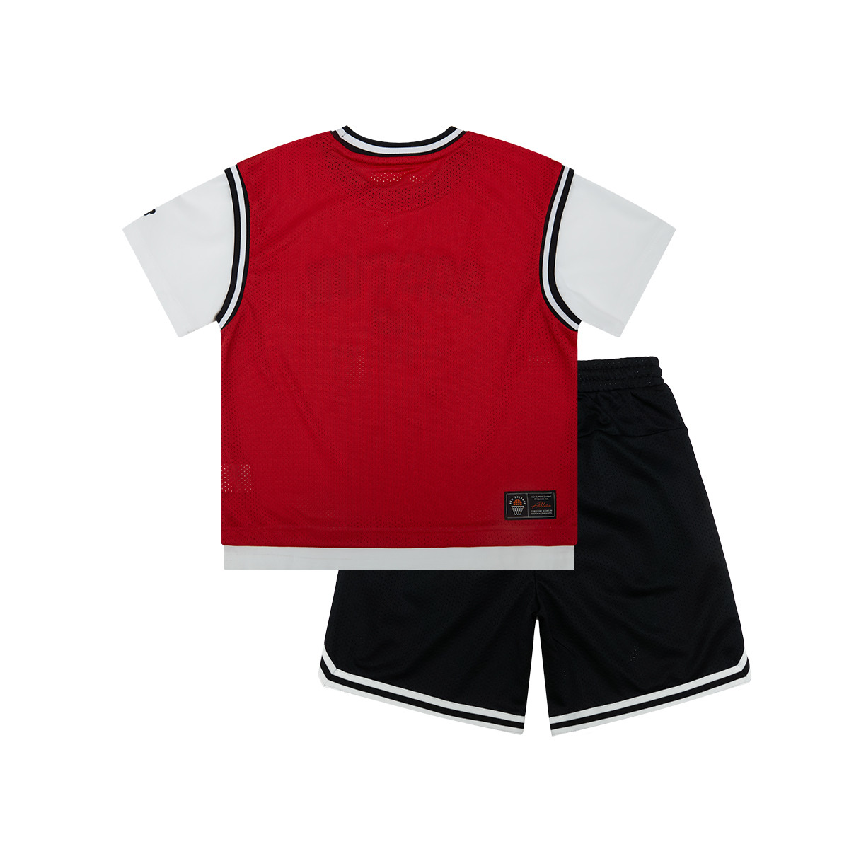 Детский спортивный костюм, состоящий из футболки с логотипом и шорт, выполненных из легких материалов. Модель с заниженной линией плеча обеспечивает комфорт и яркий стиль для активного отдыха.
