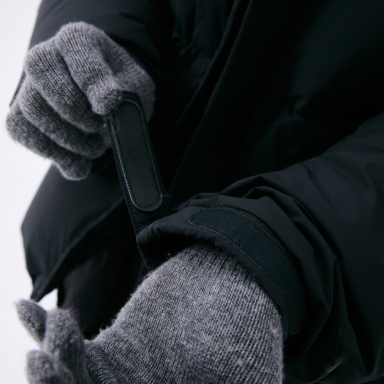 Состав: верхняя ткань — 82% нейлон, 18% эластан; подкладка — 100% нейлон; утеплитель — утиный пух (содержание пушинок 80%).