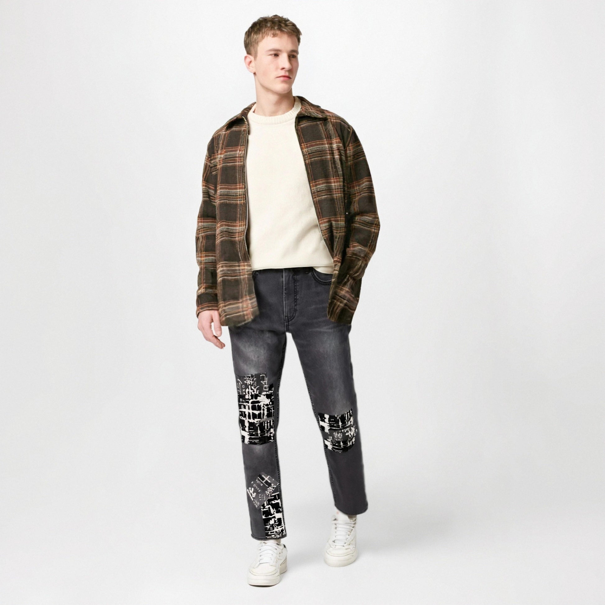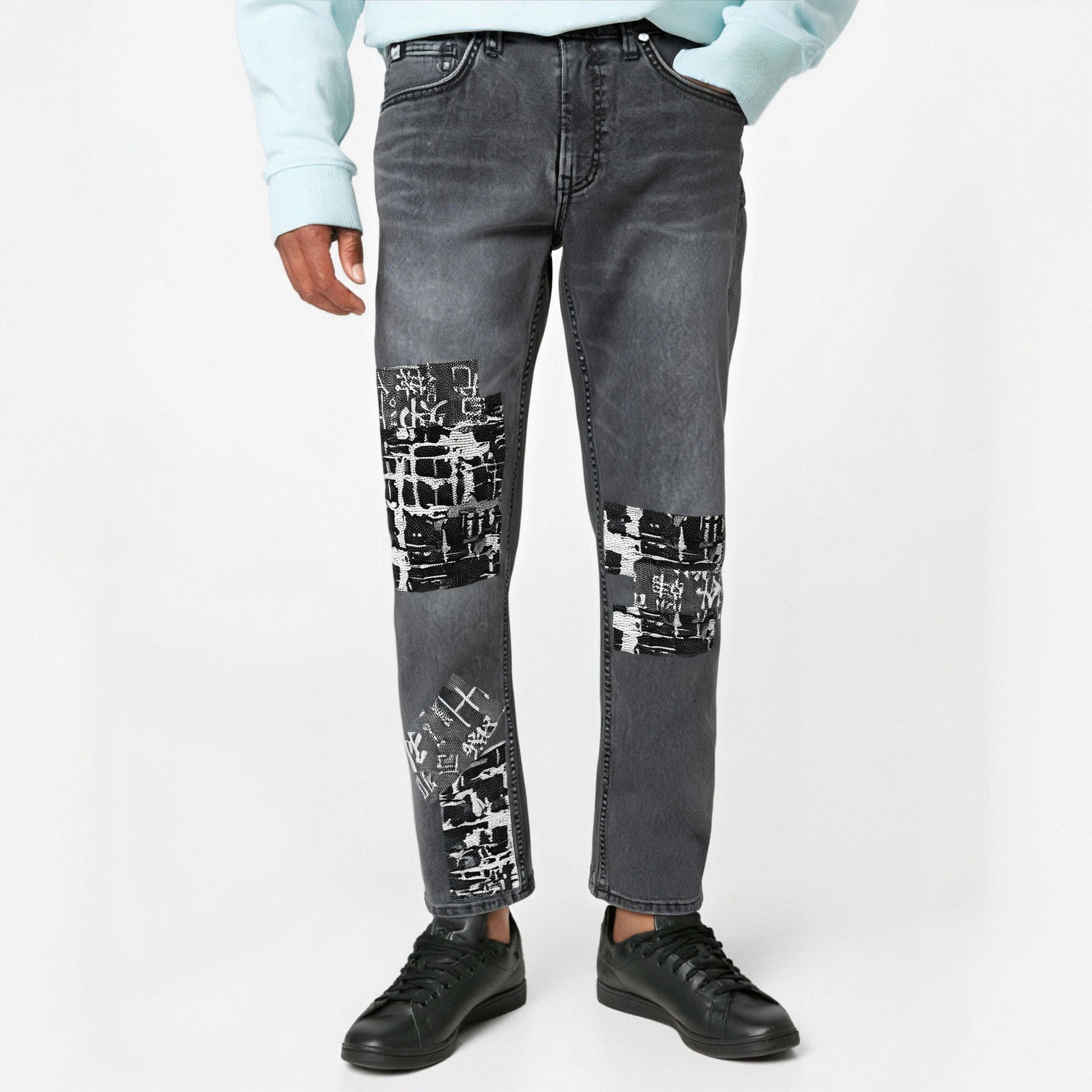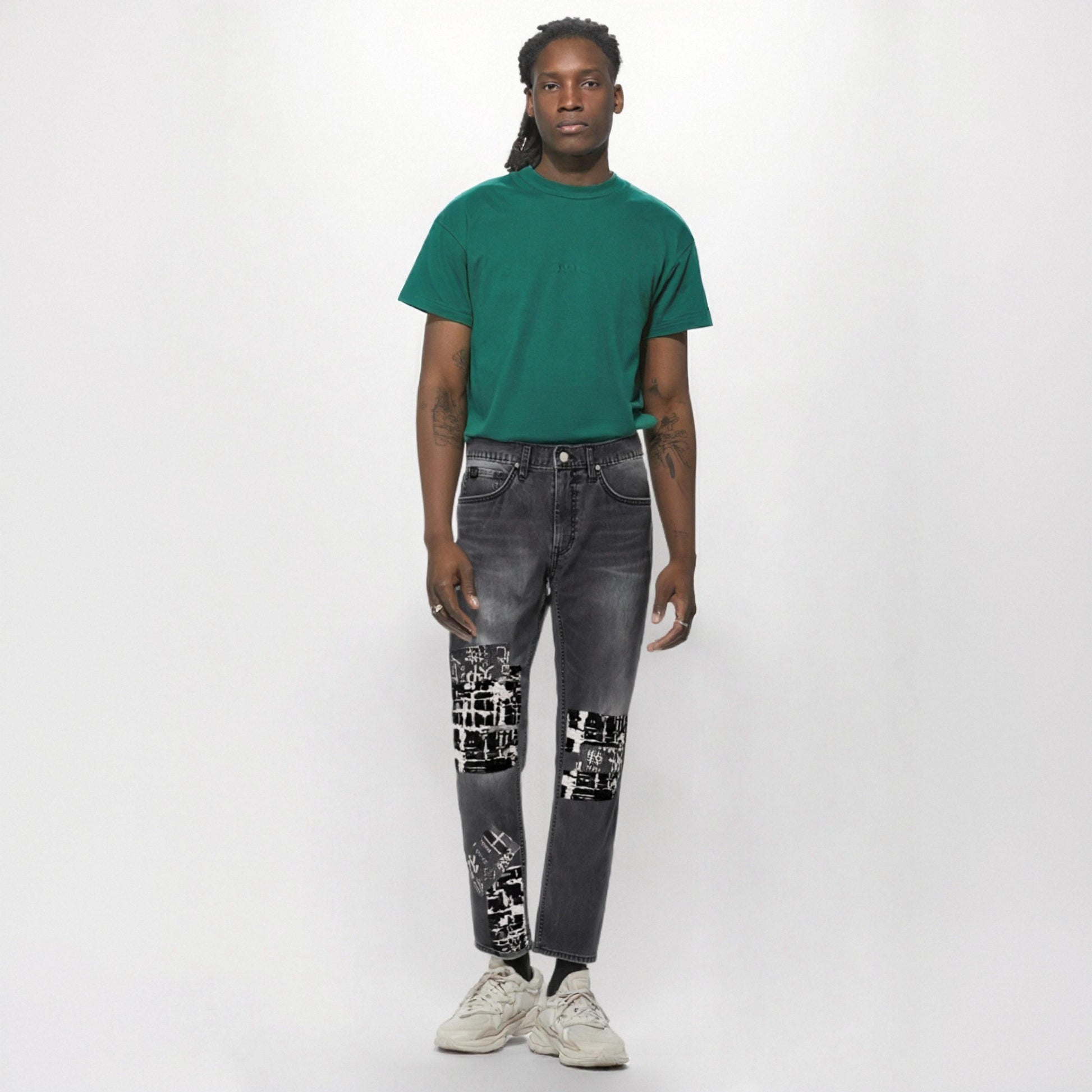 Облегающие джинсы с индивидуальной вышивкой в виде иероглифов, декоративной бахромой и охлаждающим эффектом ткани. Кастомная модель в уличном стиле сочетает элементы хип-хопа и оригинальный дизайн.