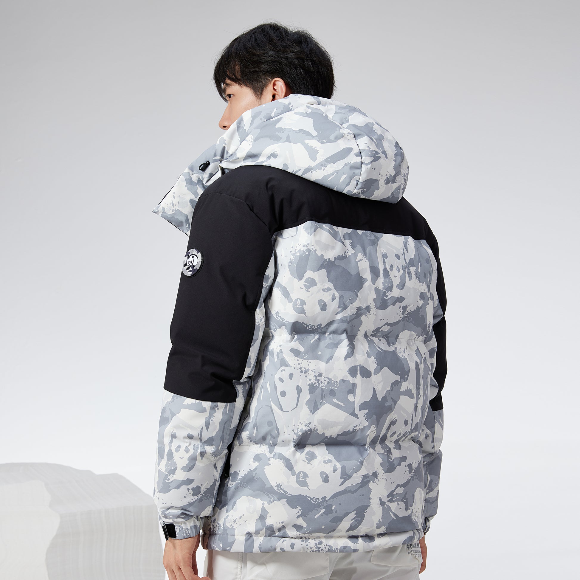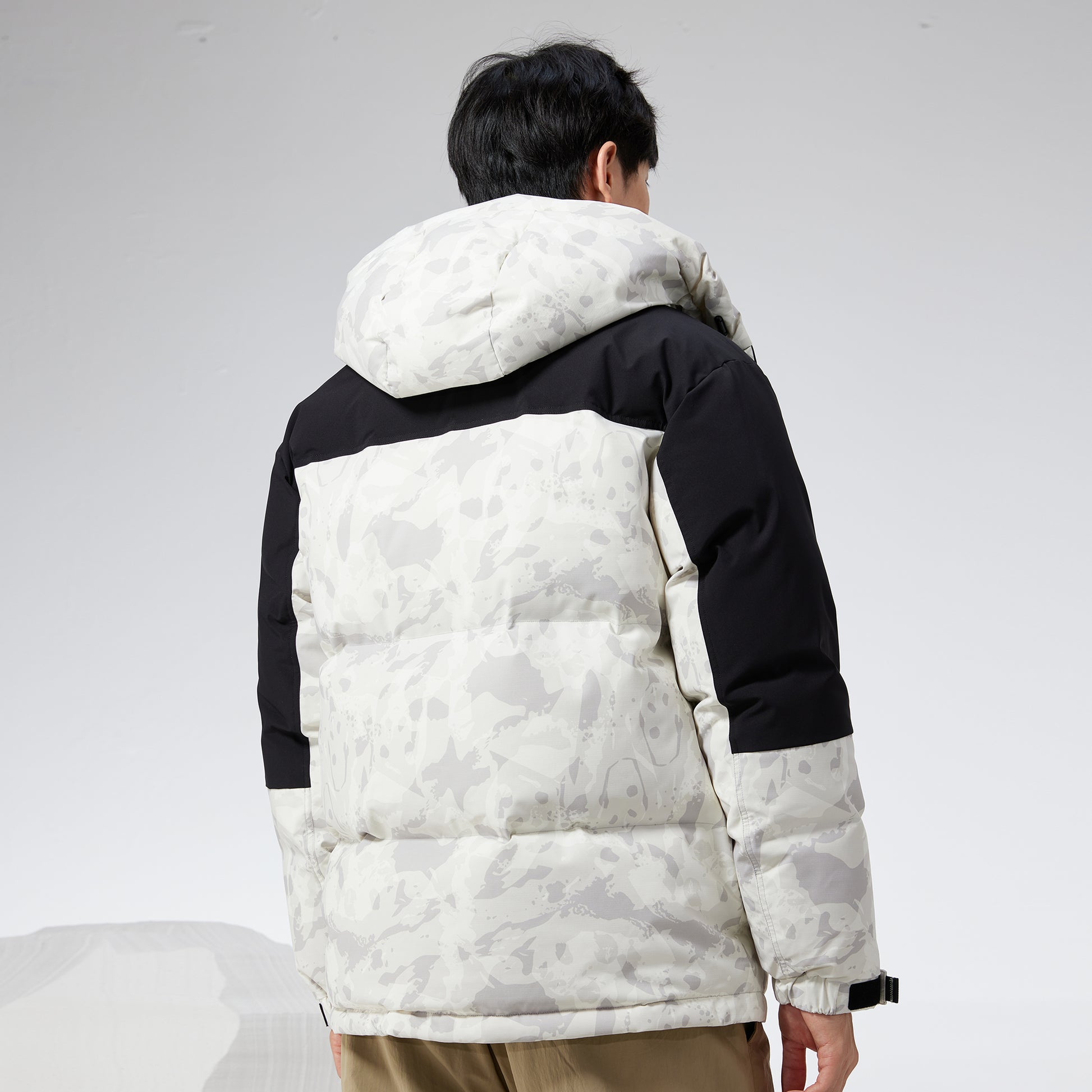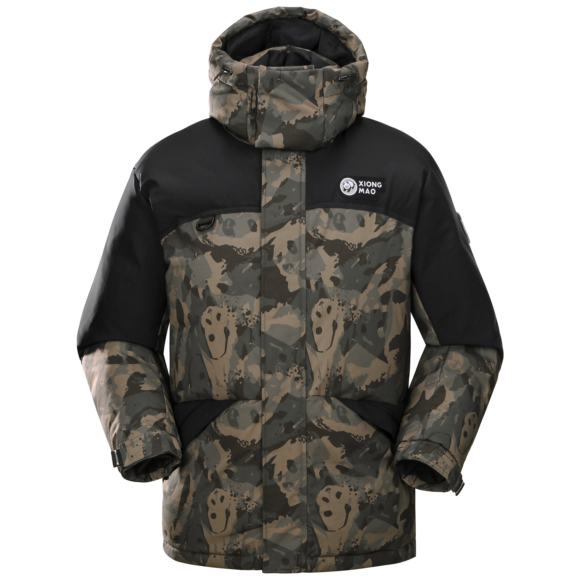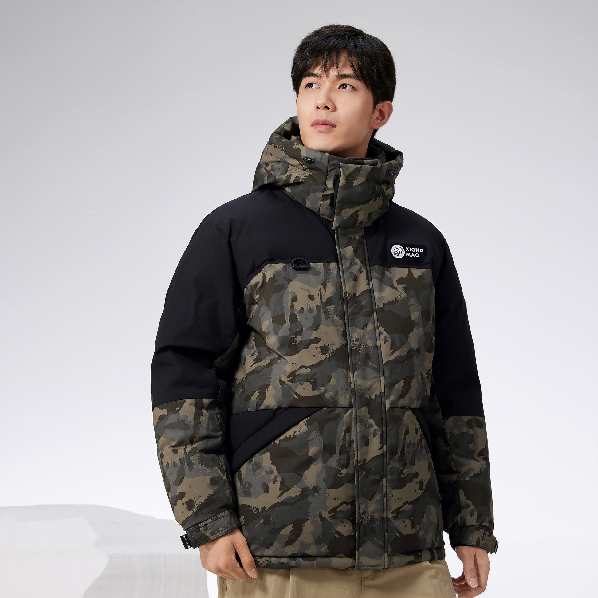 Пуховик в стиле «пуховик» с капюшоном для зимних видов спорта, украшенный камуфляжным принтом и выполненный из водоотталкивающей ткани. Модель с утепленными элементами наполнена утиным пухом, обеспечивая надежную защиту от холода и ветра.