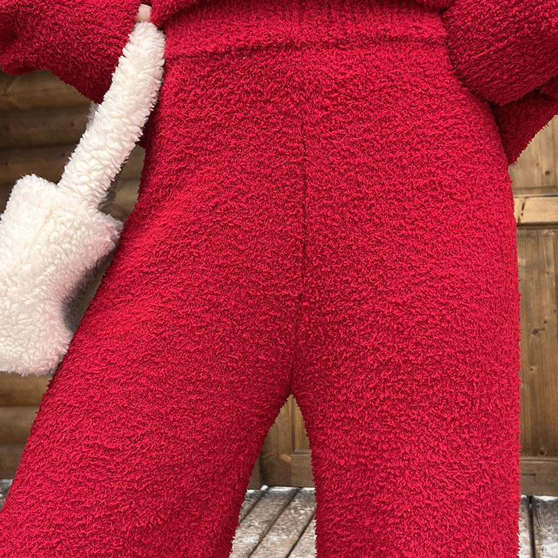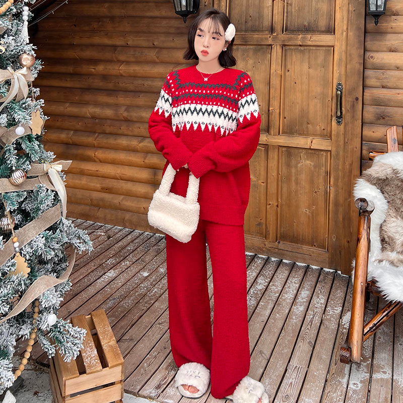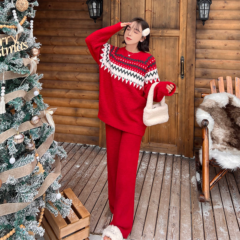 Стильная пижама с длинными рукавами и штанами, выполненная из мягкого и теплого полиэстера. Подходит для носки дома и на улице в осенне-зимний сезон, с праздничным дизайном.