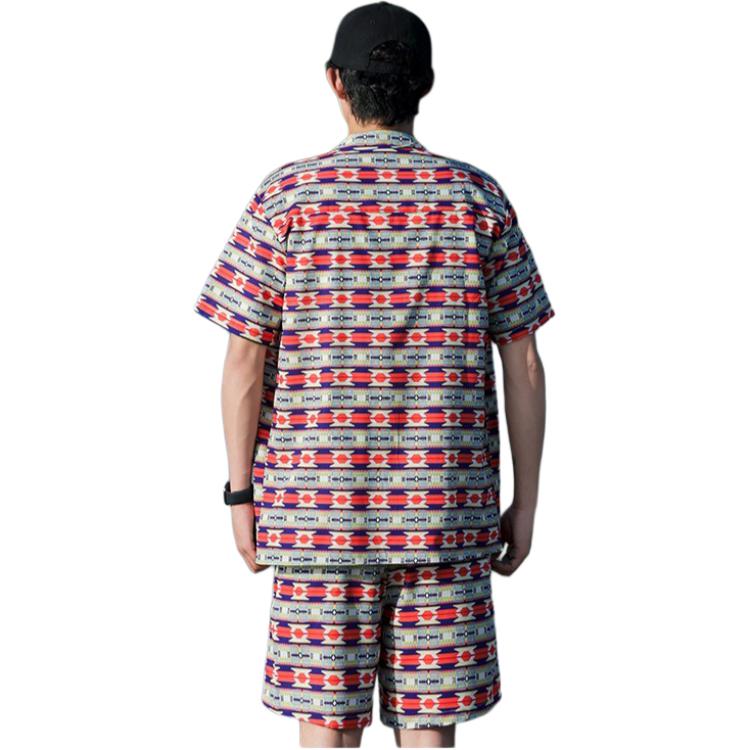 Мужской спортивный костюм с принтом, состоящий из рубашки с отложным воротником и шорт с завязками на талии. Идеален для летнего отдыха и активного времяпрепровождения.