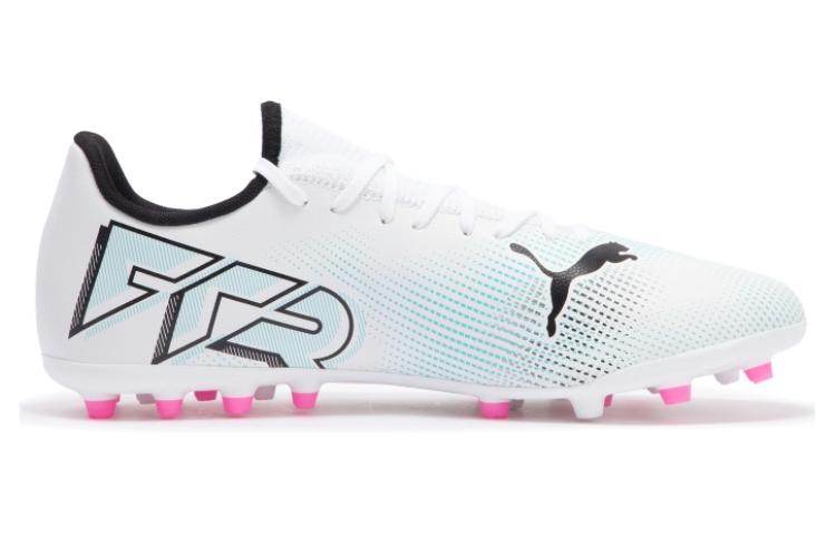 Футбольные бутсы Puma Future 7 Play, выполненные из искусственной кожи в белом и синем цветах. Эти легкие и удобные бутсы с короткими шипами (mg) обеспечивают комфорт и простоту в игре, идеально подходят для мужчин во время тренировок и матчей на искусственном газоне.