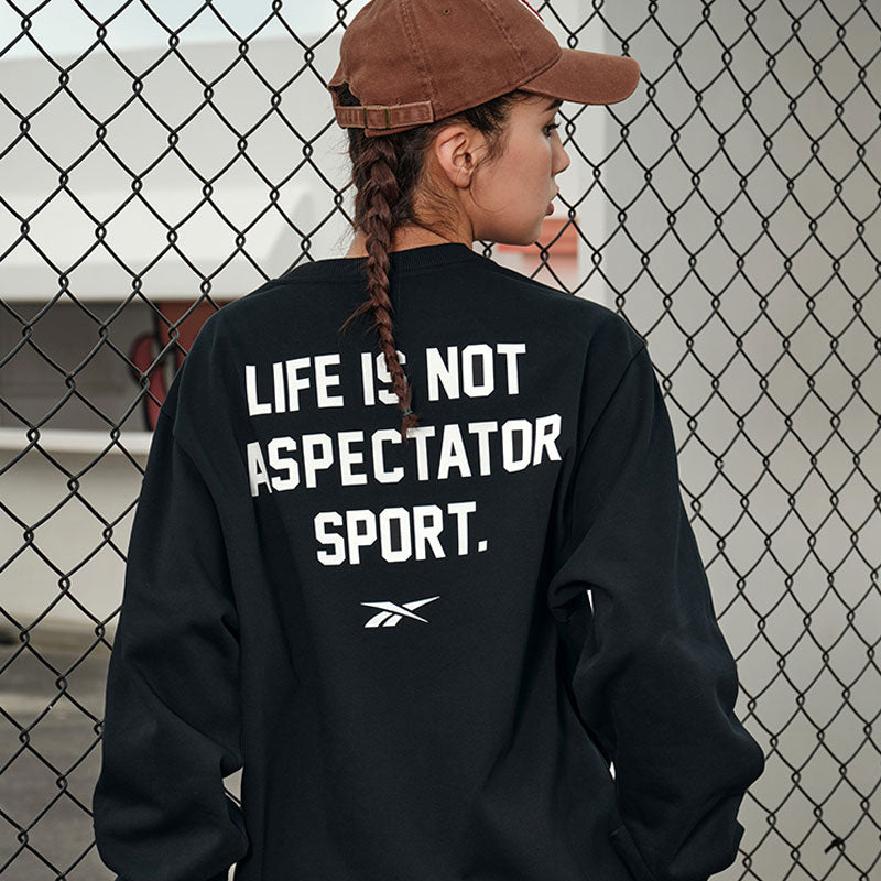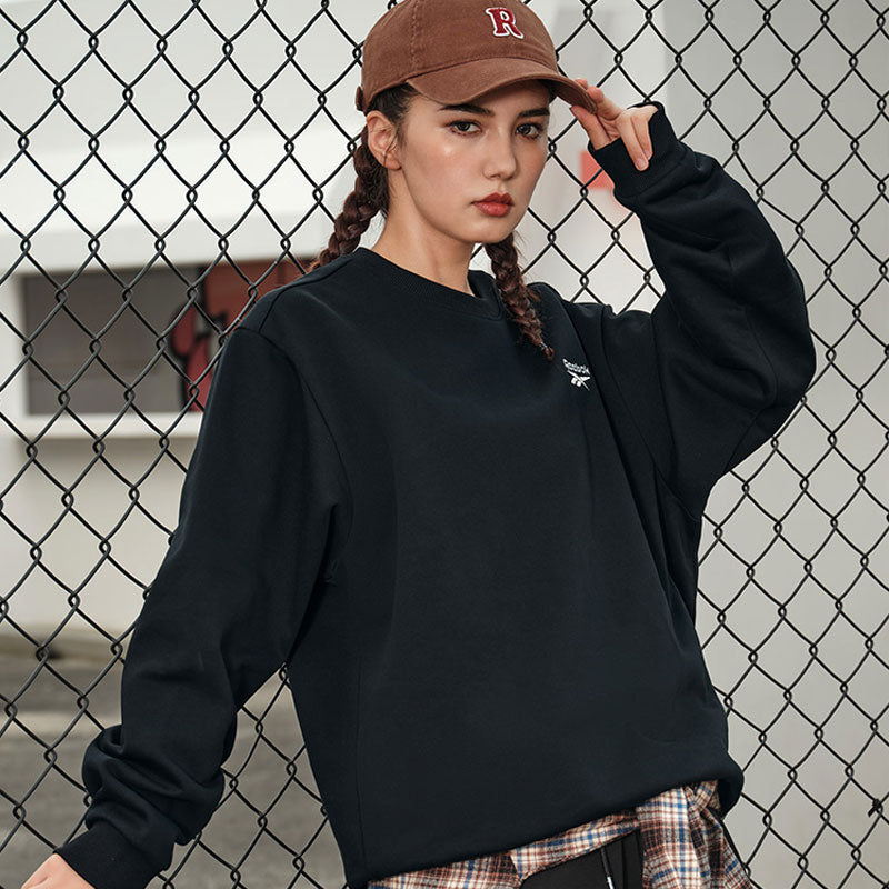 Женская спортивная толстовка Reebok с круглым вырезом и длинными рукавами. Модель свободного кроя с принтом букв обеспечивает комфорт и подходит для тренировок и повседневной носки весной и осенью.