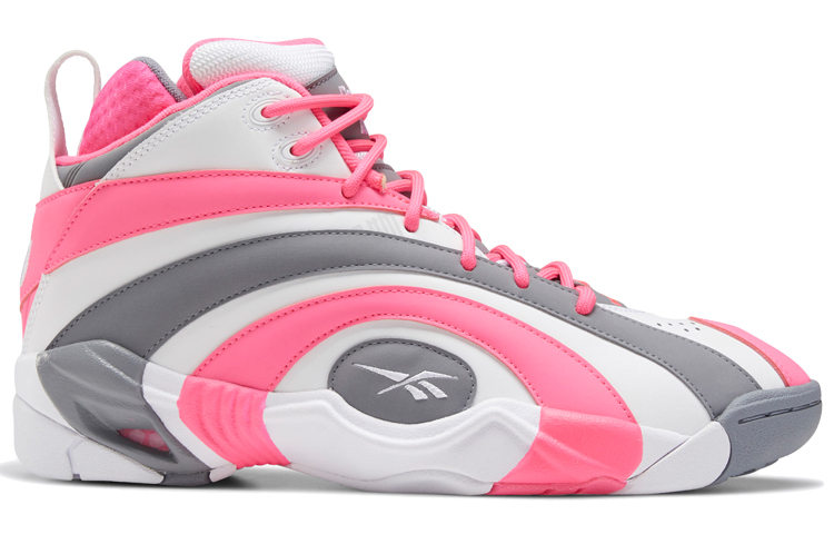 Высокие ретро-кроссовки с контрастным графическим узором в розово-серо-белой гамме и массивной подошвой. Модель на шнуровке обеспечивает амортизацию, износостойкость и смелый уличный образ.