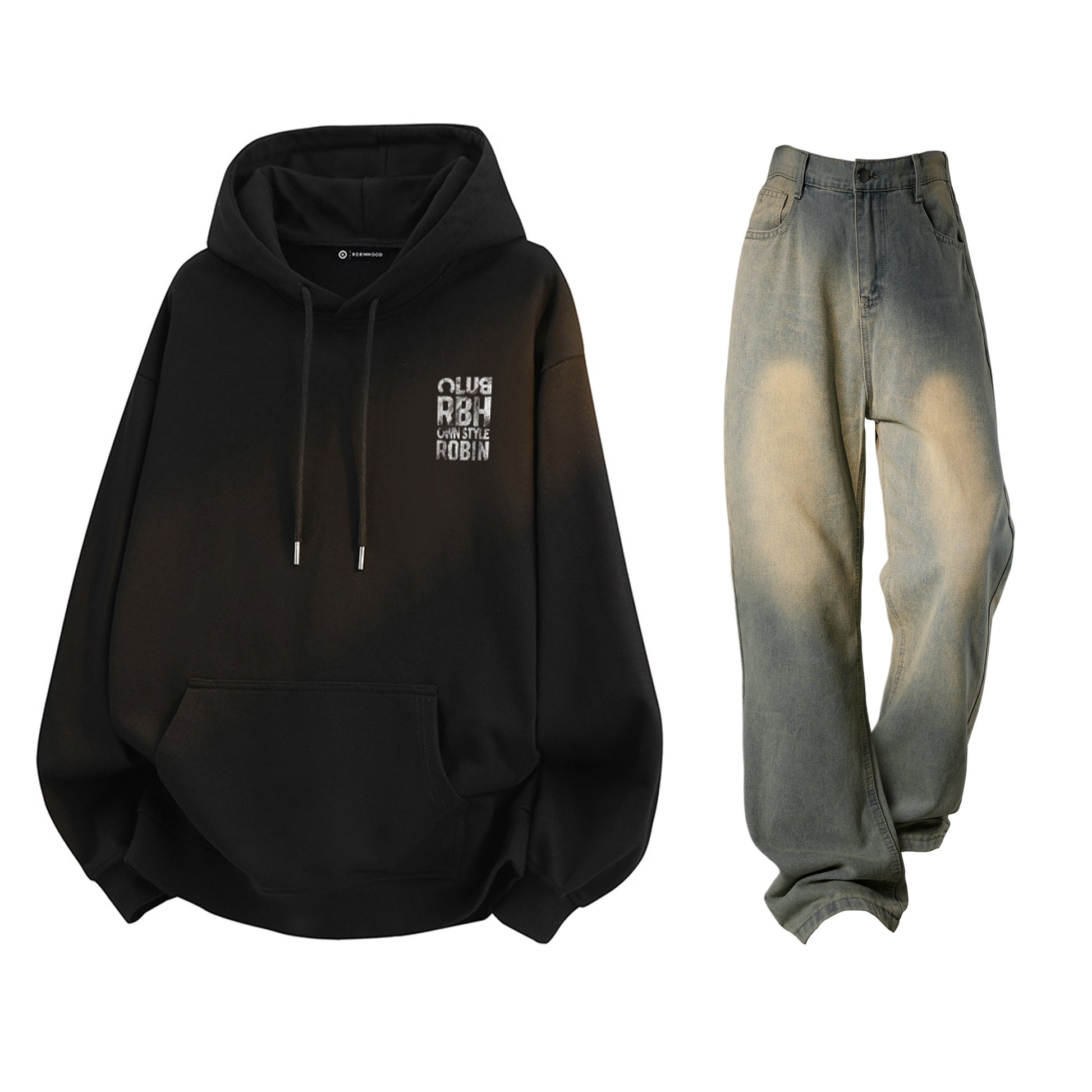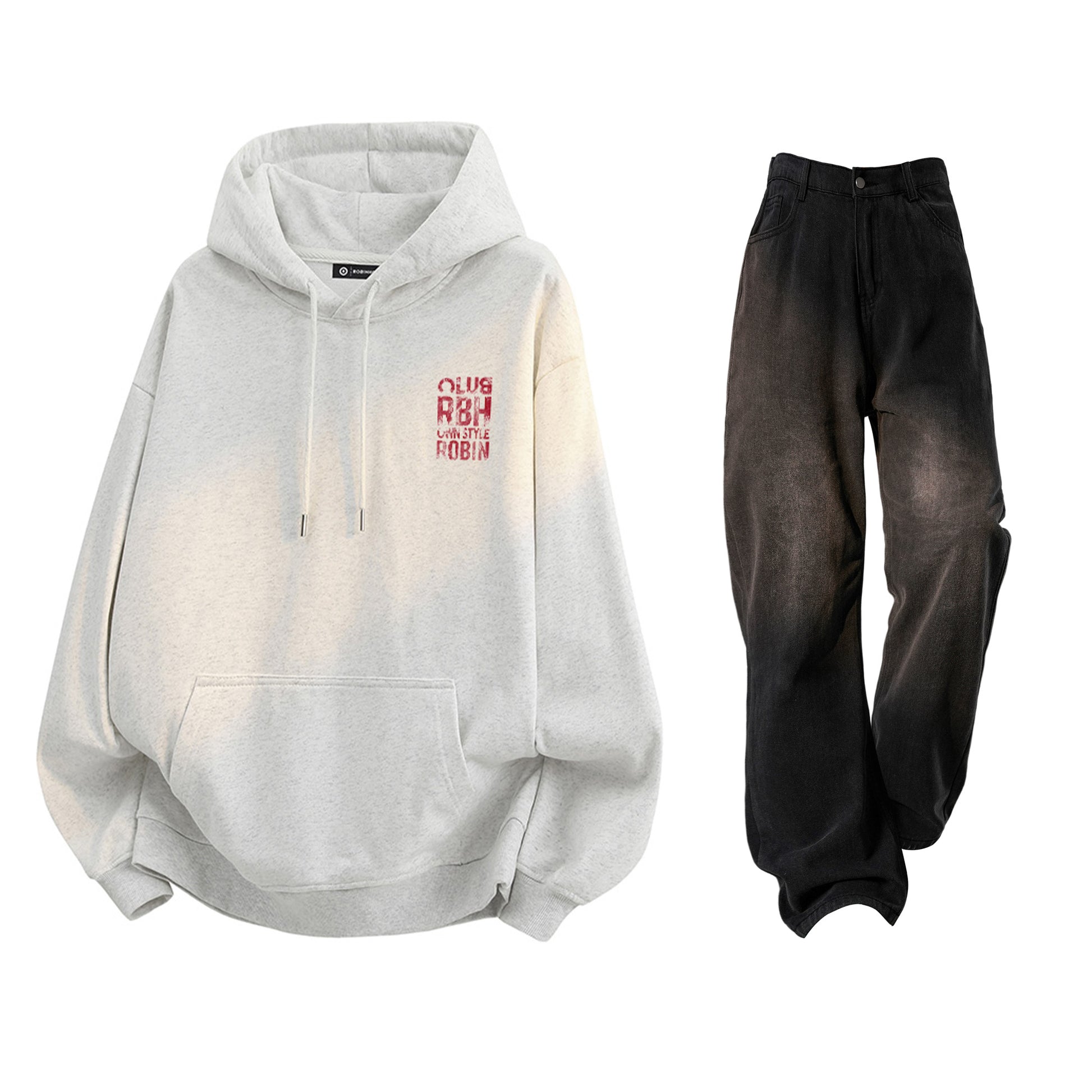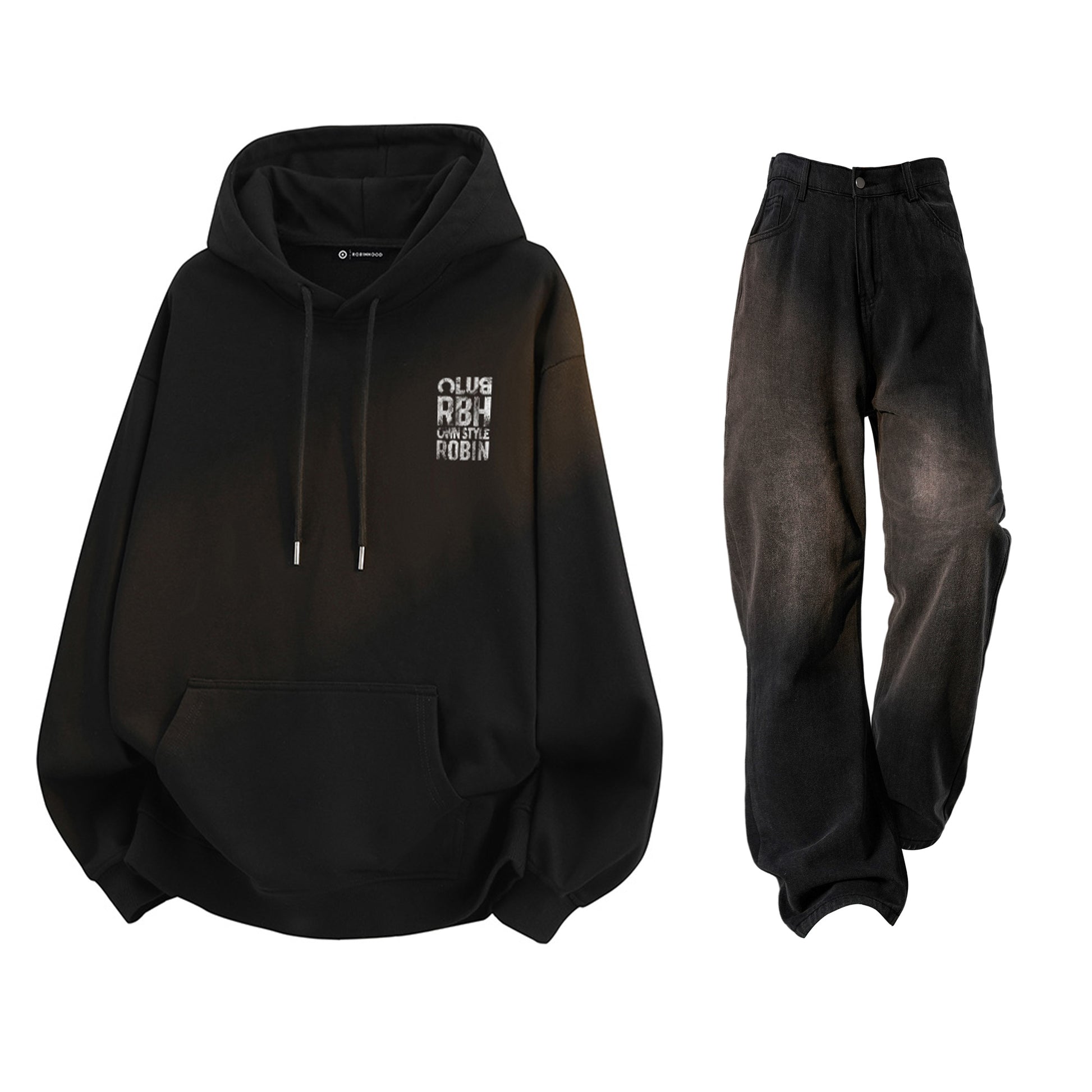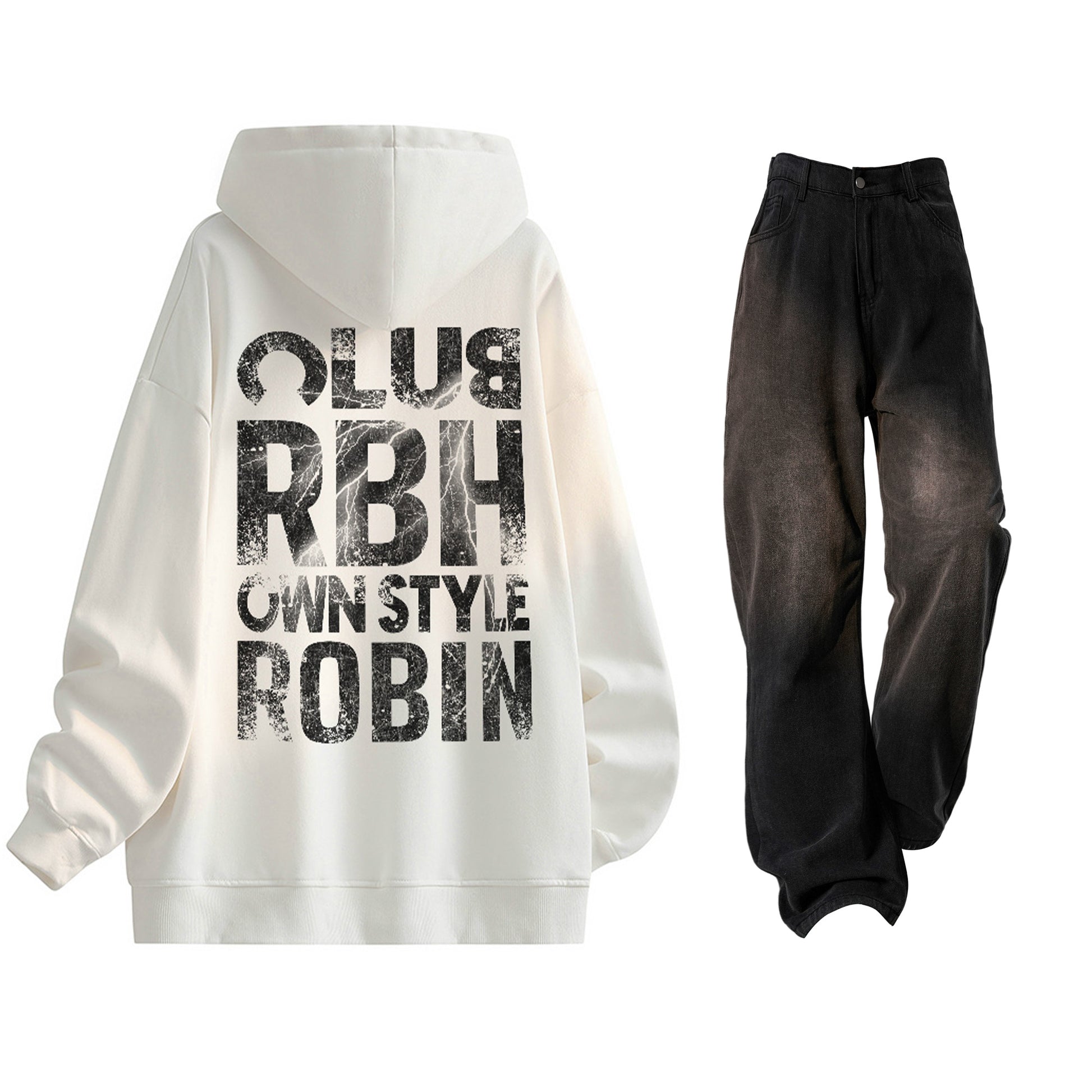 Стильный спортивный костюм Robinhood в американском high street стиле. Комплект состоит из худи с капюшоном и длинными рукавами свободного кроя, украшенного креативным принтом с эффектом «молнии» и винтажного выцветания, а также джинсов с лёгким клёш‑силуэтом и эффектом «washed» для ретро‑образа. Модель удобна для повседневной носки и создаёт модный расслабленный стиль.