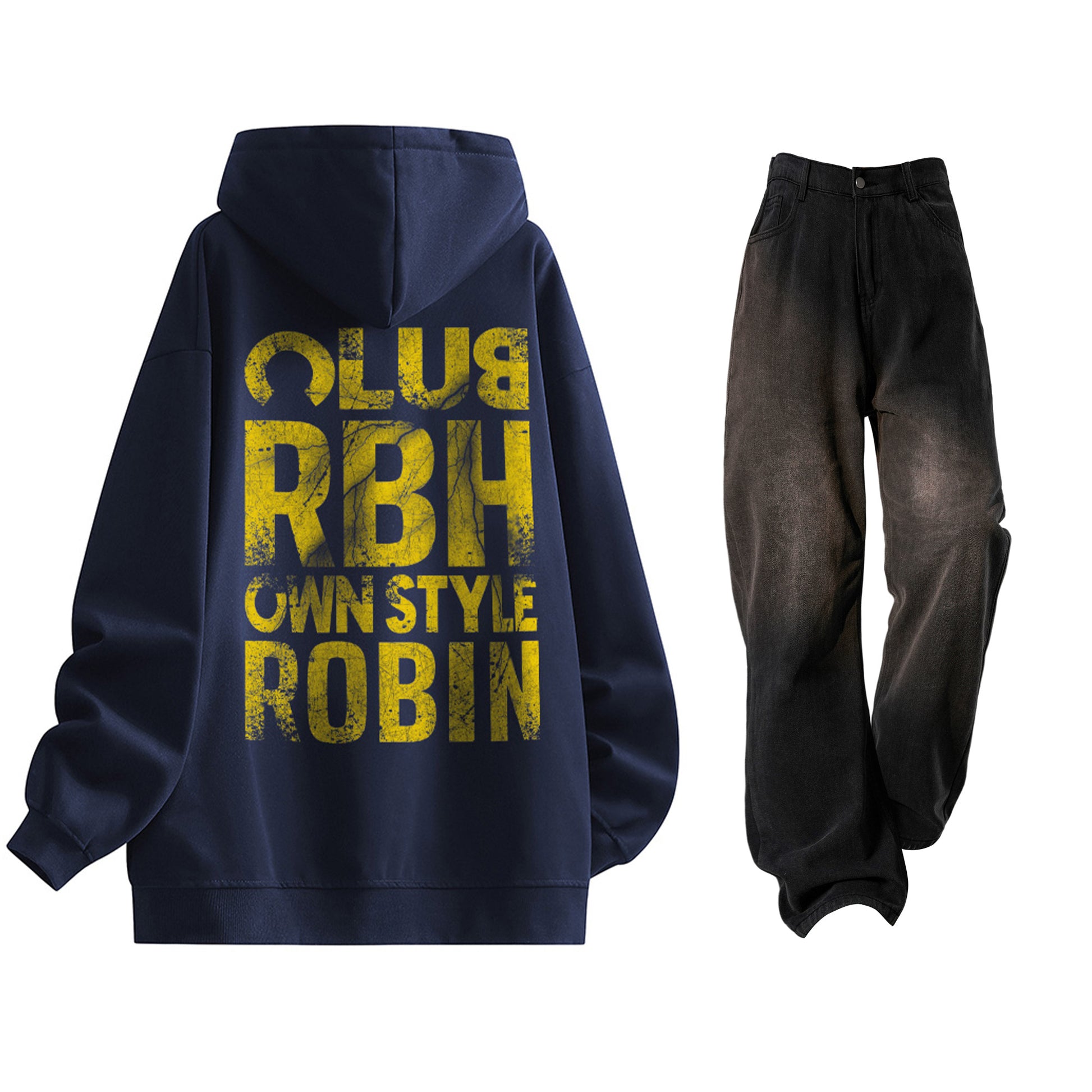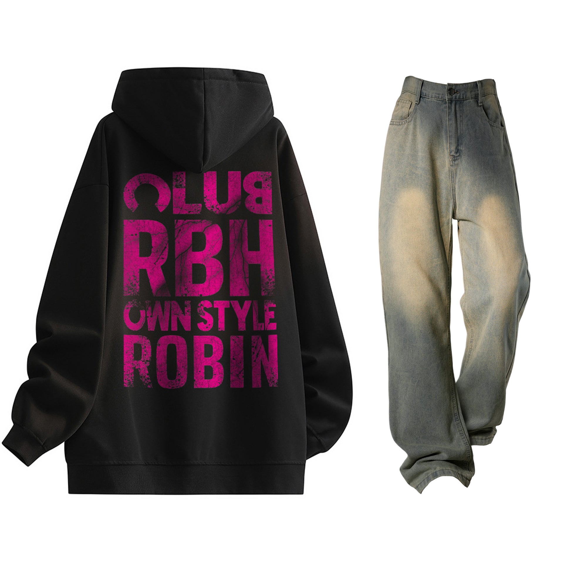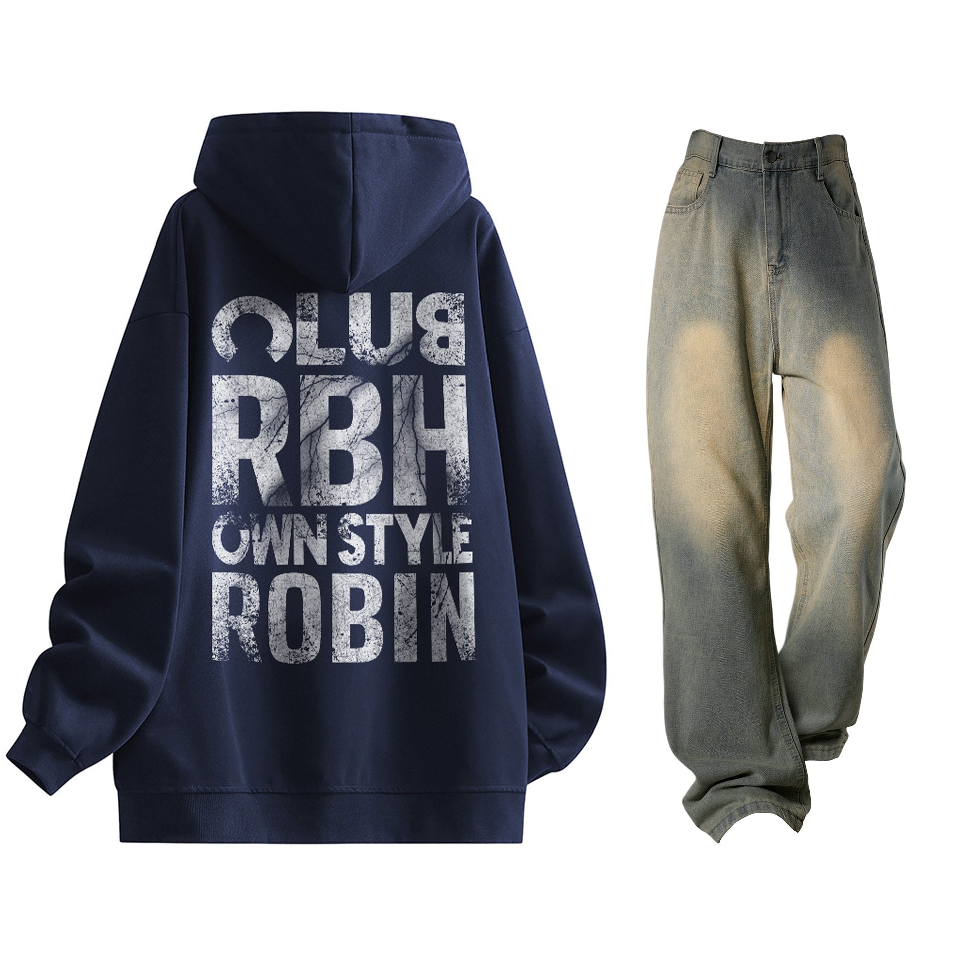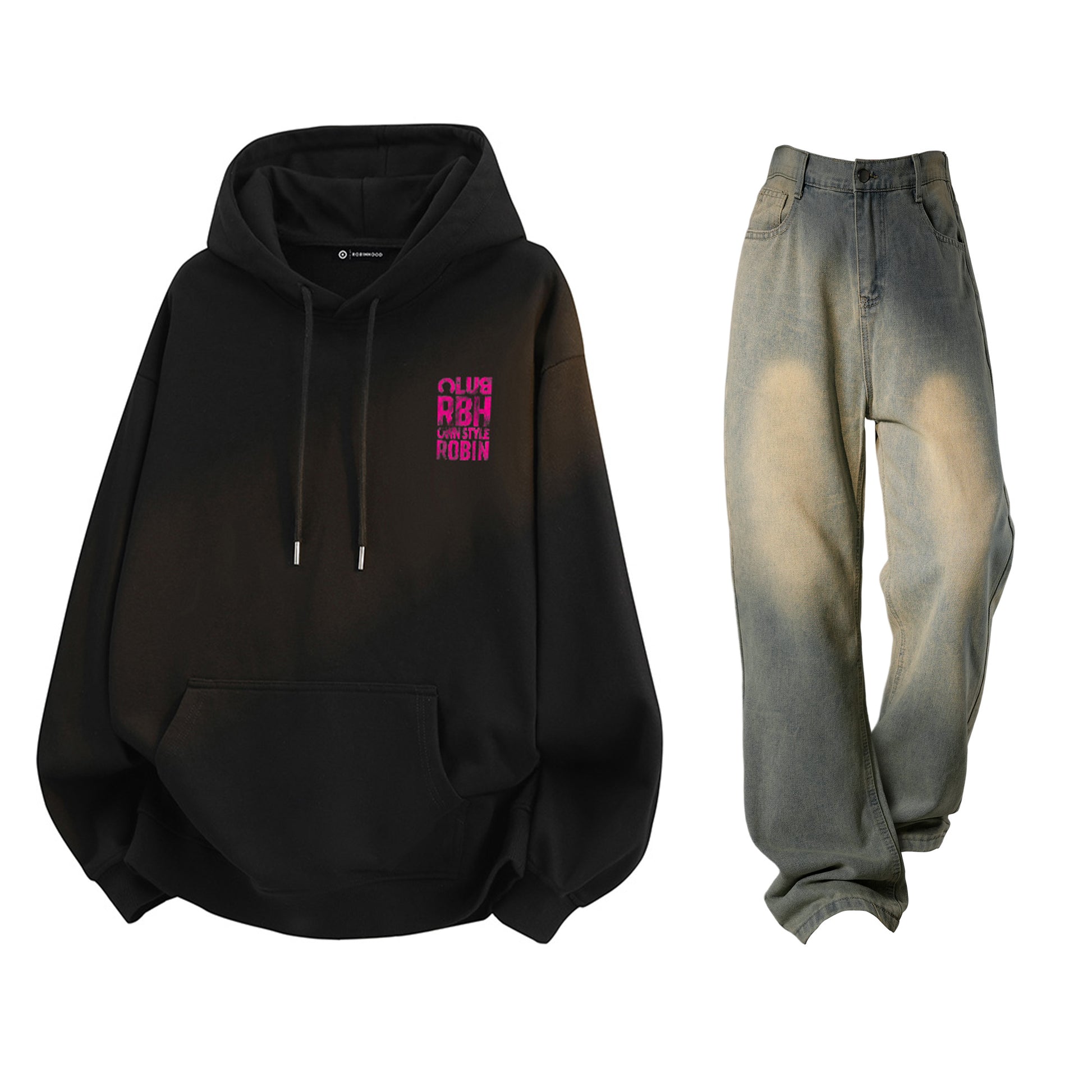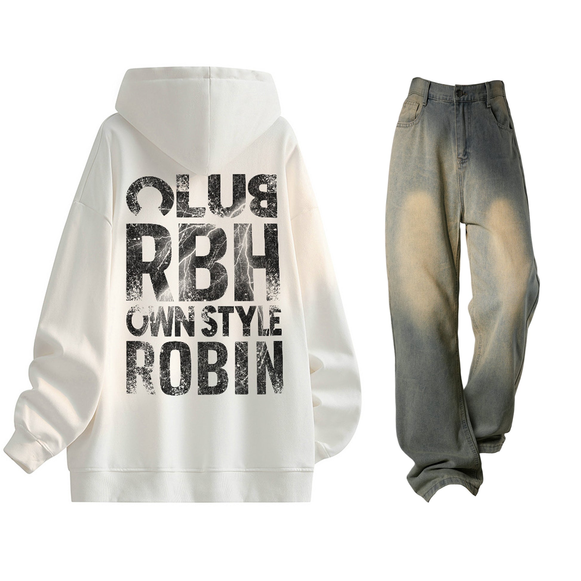 Стильный спортивный костюм Robinhood в американском high street стиле. Комплект состоит из худи с капюшоном и длинными рукавами свободного кроя, украшенного креативным принтом с эффектом «молнии» и винтажного выцветания, а также джинсов с лёгким клёш‑силуэтом и эффектом «washed» для ретро‑образа. Модель удобна для повседневной носки и создаёт модный расслабленный стиль.