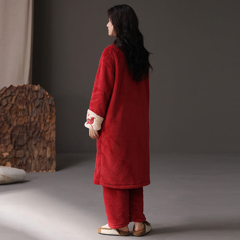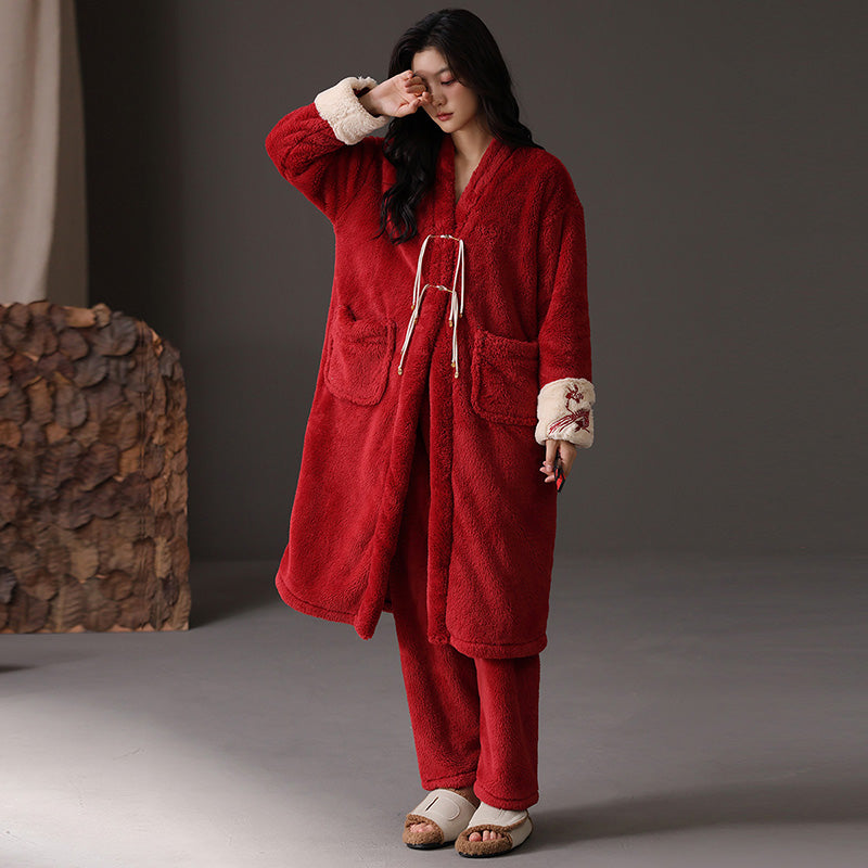 Уютный халат из мягкого материала, выполненный в простом и удобном дизайне. Идеально подходит для домашнего ношения, сочетает комфорт и стиль для праздничного сезона.