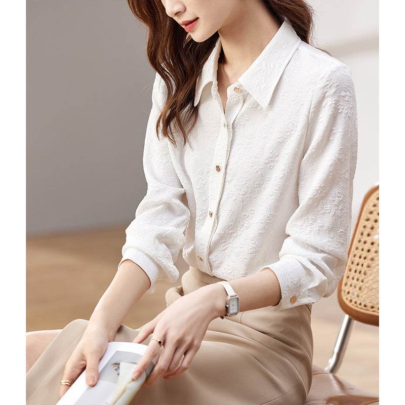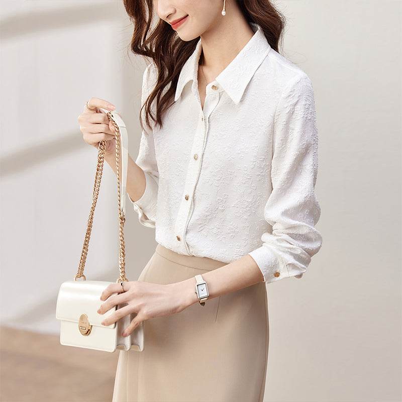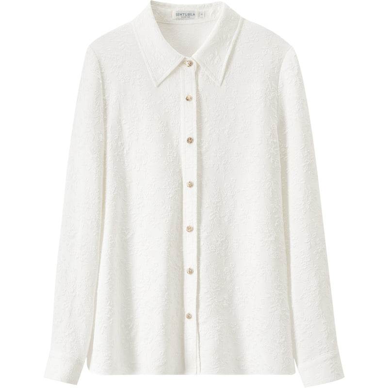 Прямая рубашка с длинными рукавами, выполненная в белом цвете с жаккардовым узором и металлической пуговицей. Стильная и элегантная, идеально подходит для повседневной носки и офисных образов.