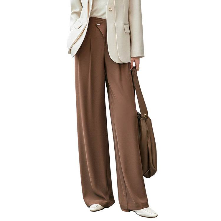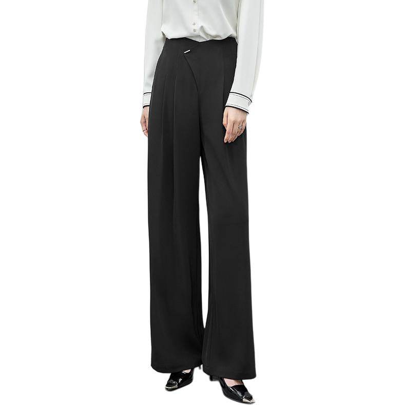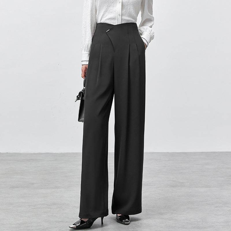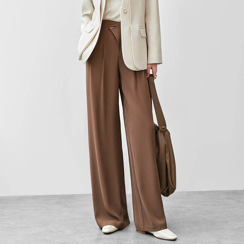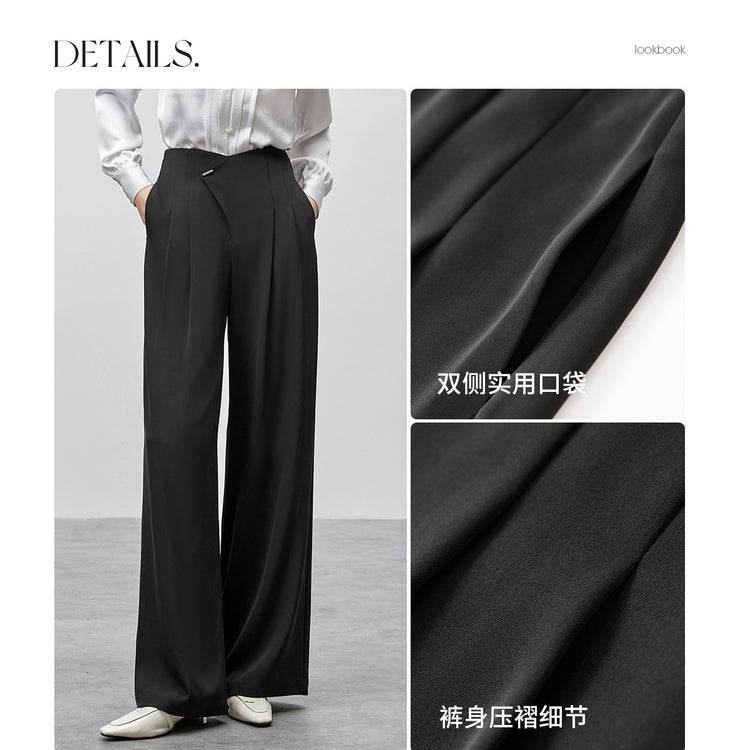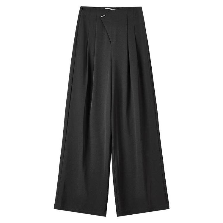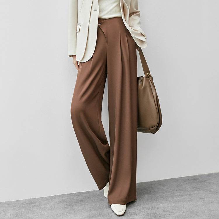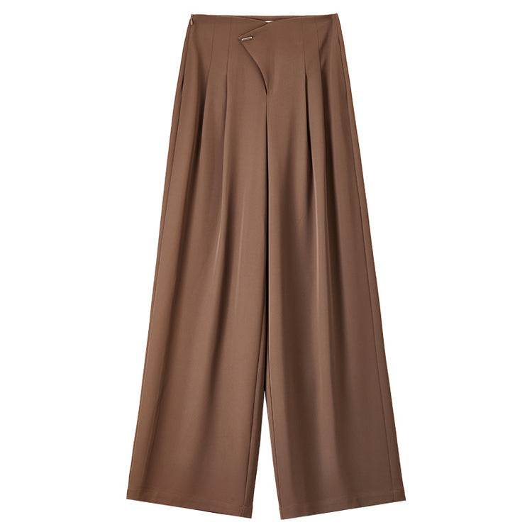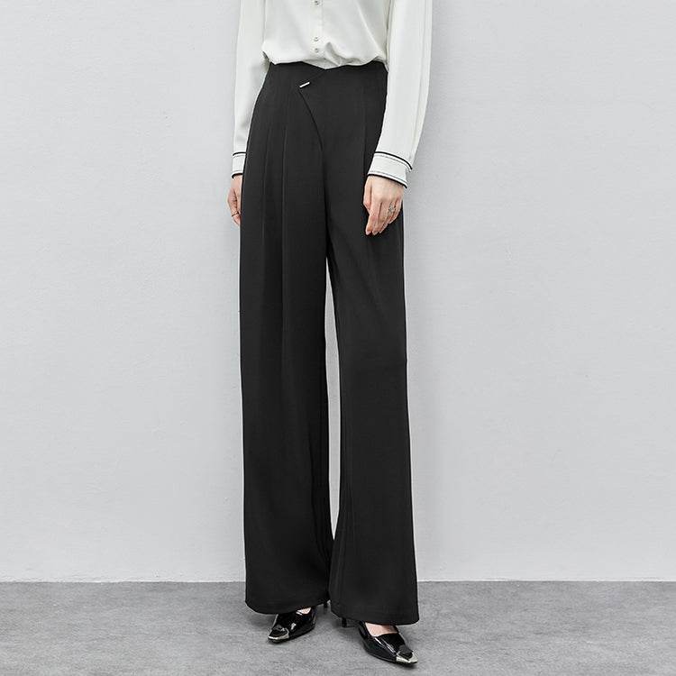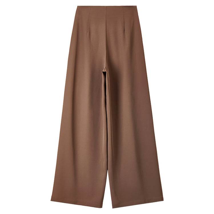 Удобные и стильные брюки с высокой талией, выполненные с гладкими драпировками на коленях. Прямой крой и модный дизайн делают их идеальными для повседневной носки и создания элегантных образов.
