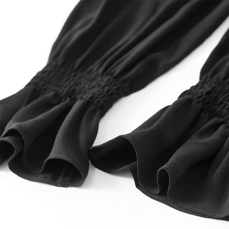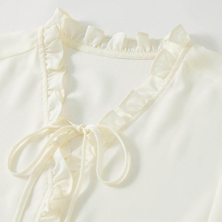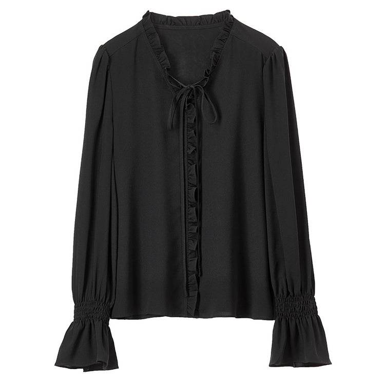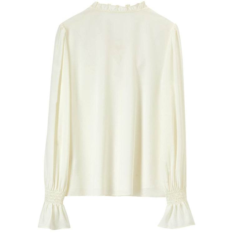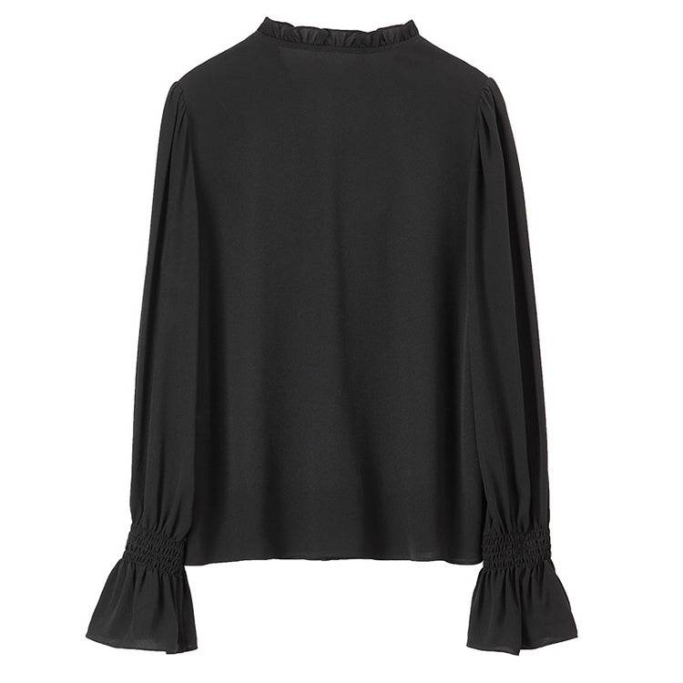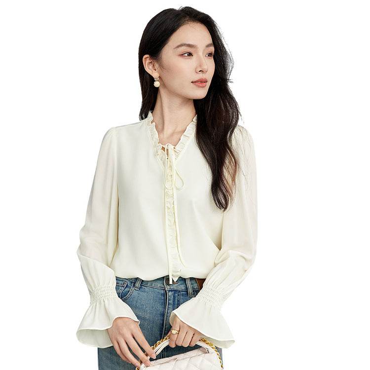Элегантная блузка с V-образным вырезом и длинными рукавами, выполненная из легкого шифона. Французский стиль с ушанкой придает изысканный вид. Идеальна для создания стильных и утонченных образов.