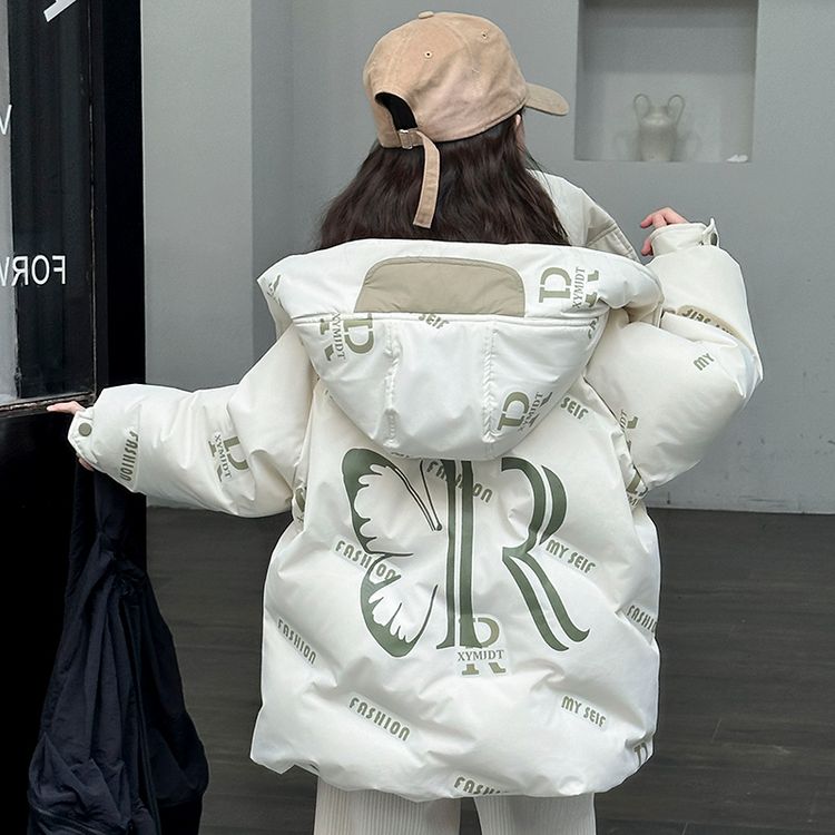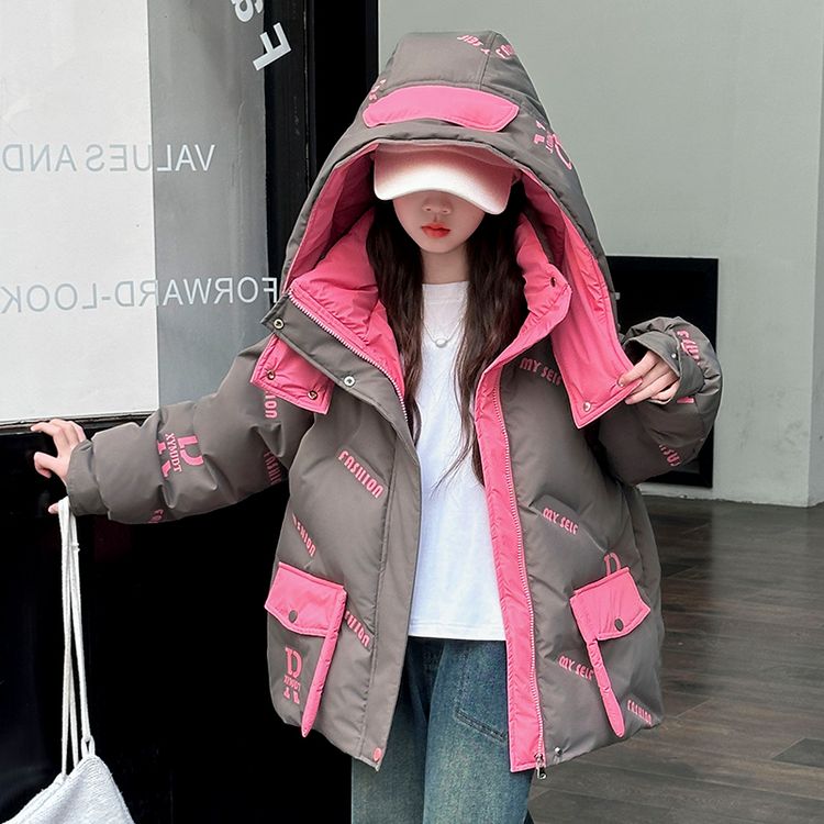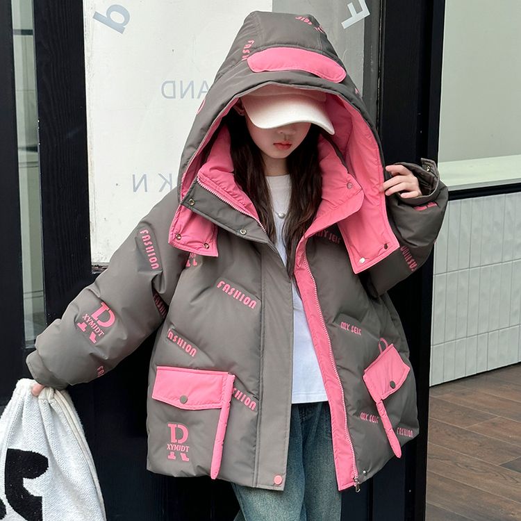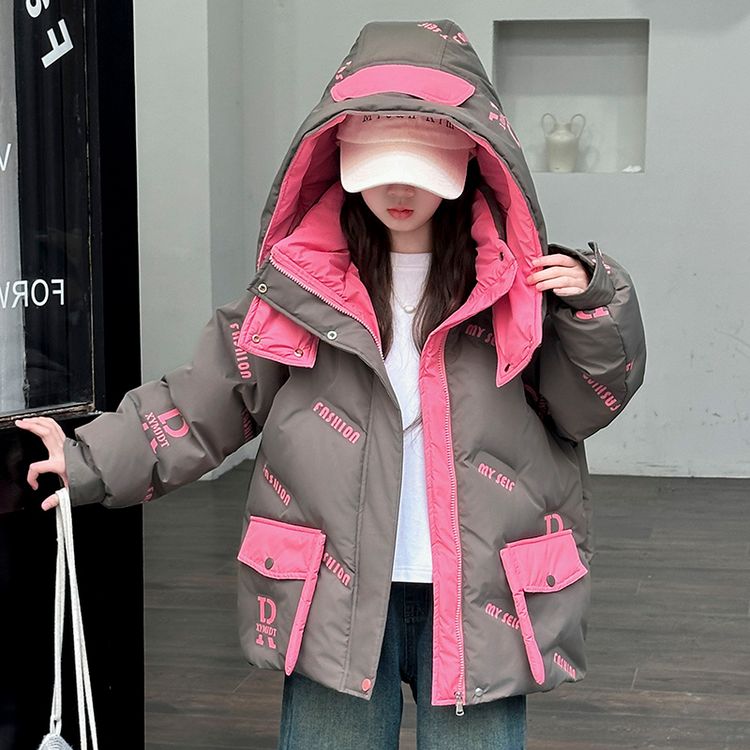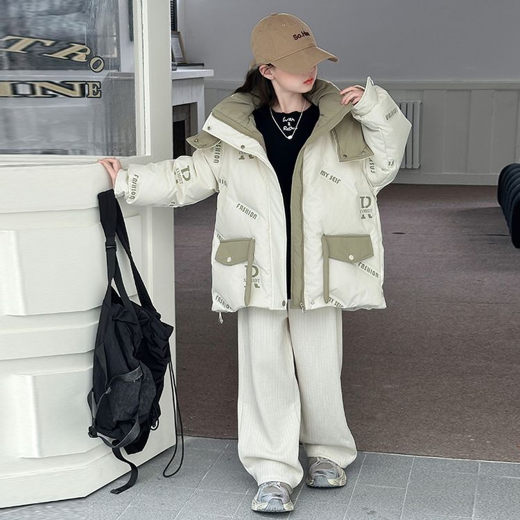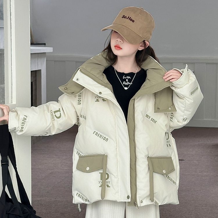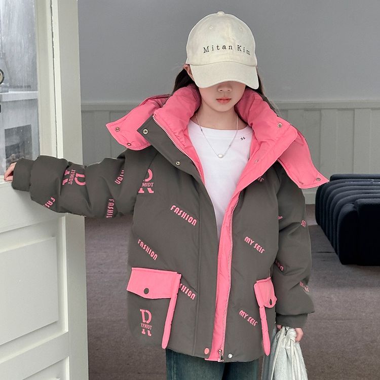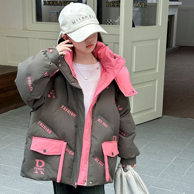 Пуховик для девочек с круглым вырезом и контрастными вставками, украшенный тематикой бабочек и букв. Модель свободного кроя с утепленной подкладкой обеспечивает легкость, тепло и модный внешний вид для холодного времени года.