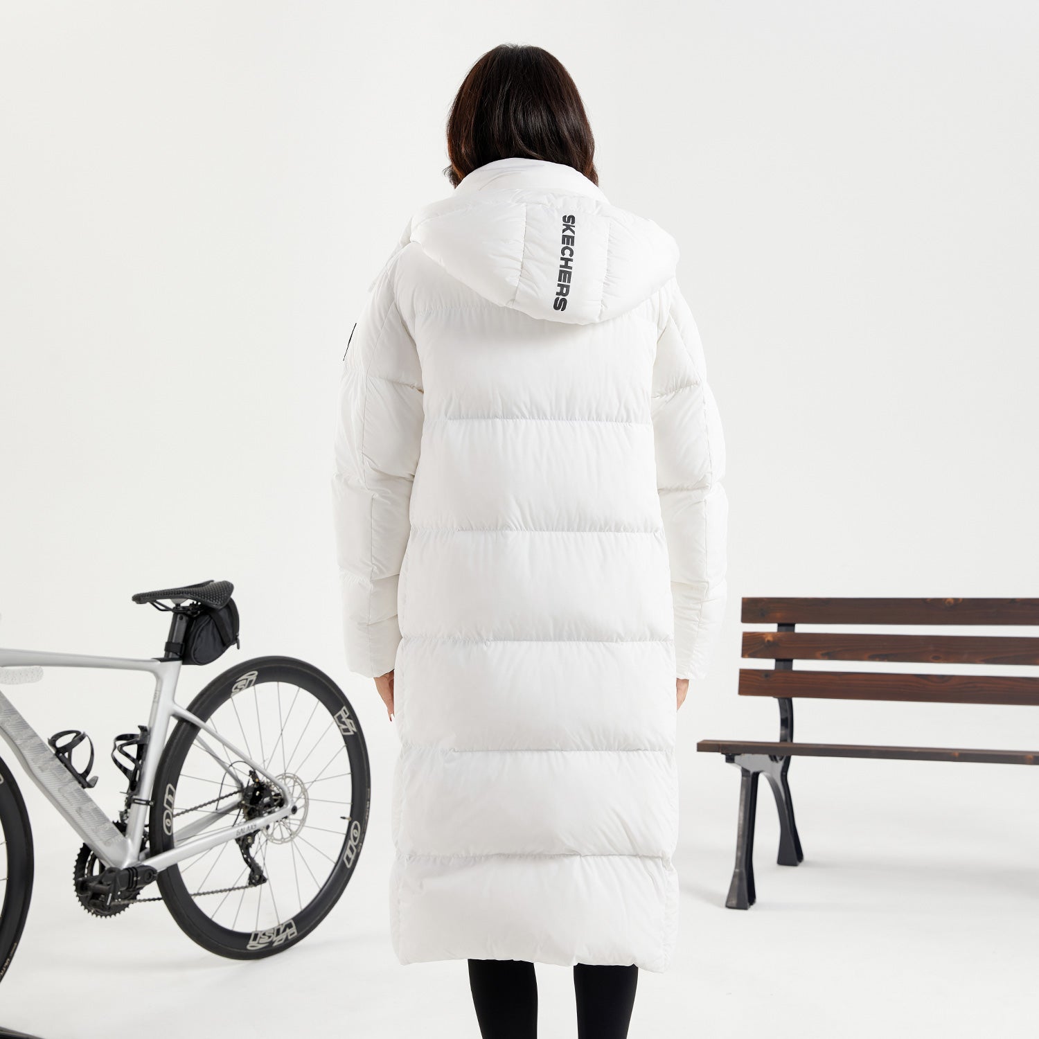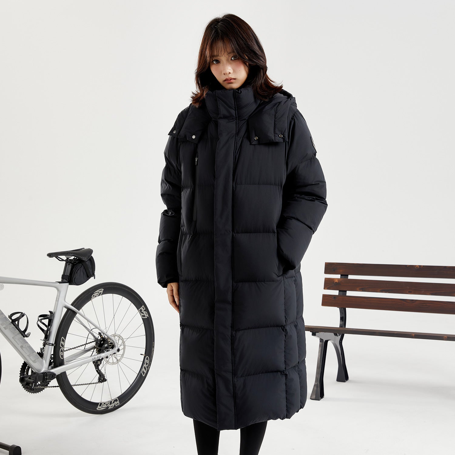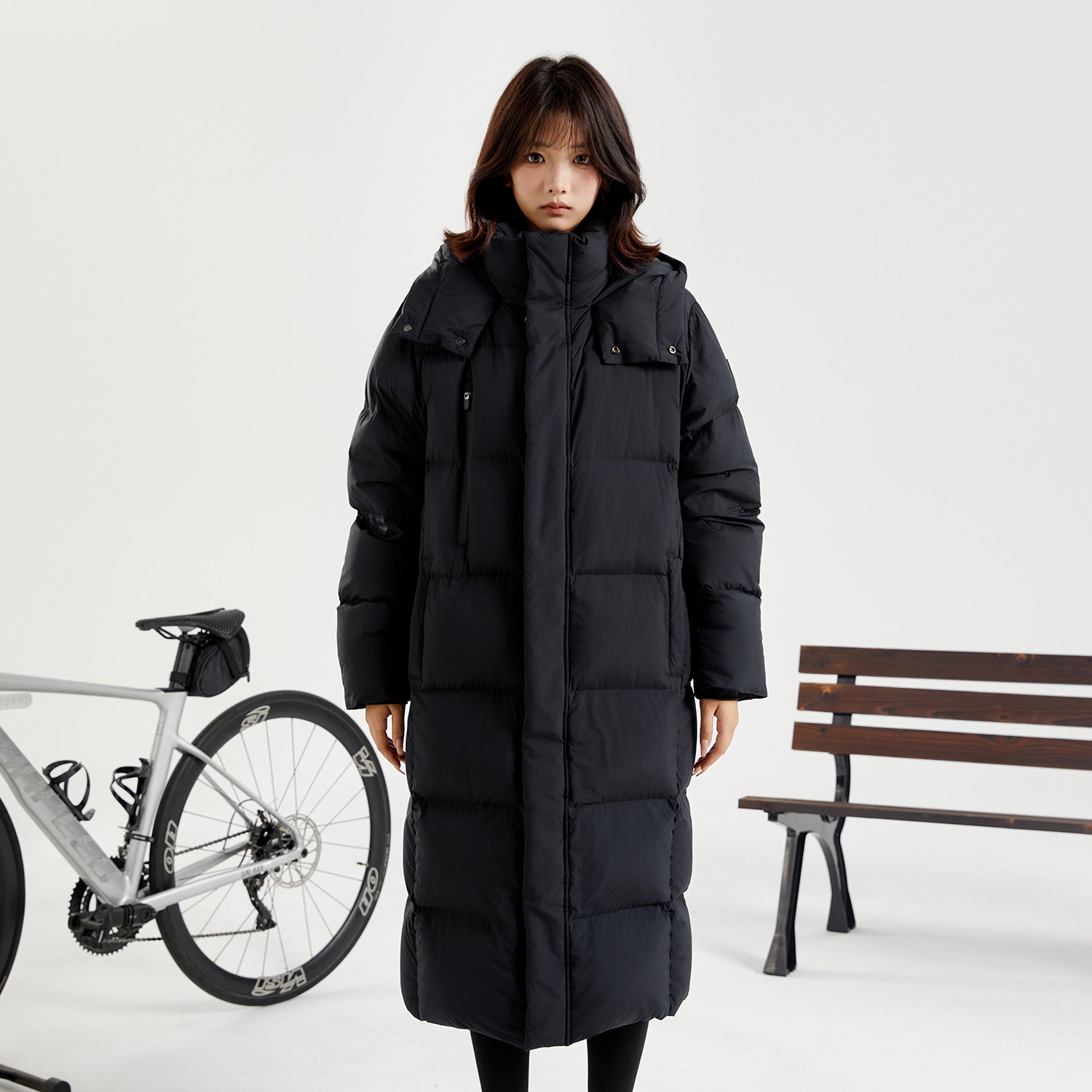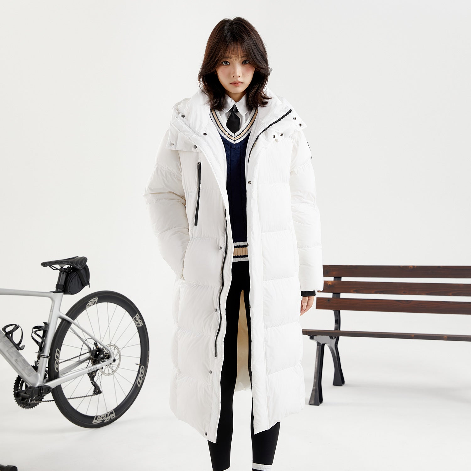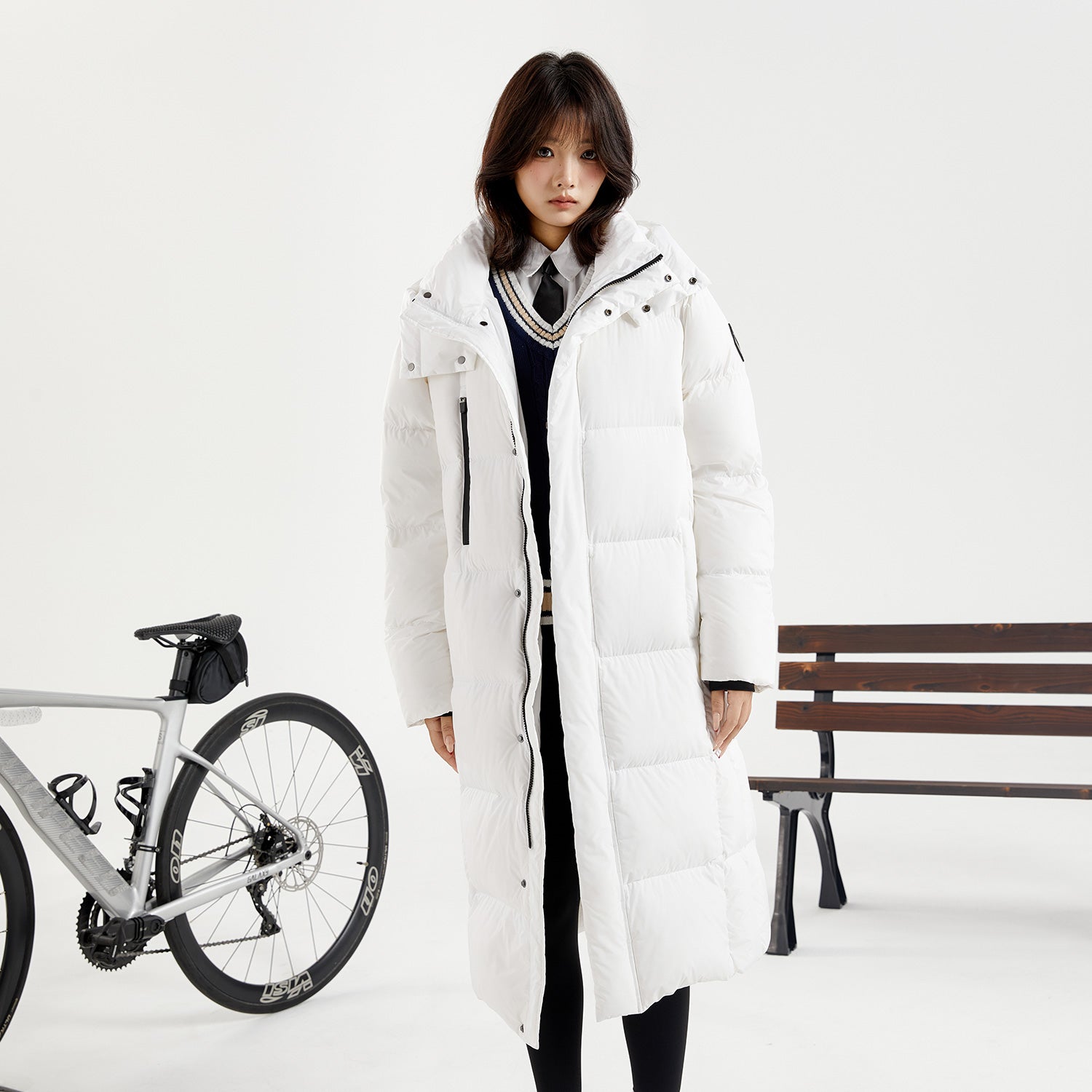 Женский длинный пуховик с капюшоном и белым пуховым наполнителем обеспечивает тепло, защиту от ветра и влаги. Модель выполнена в универсальном городском стиле с функциональным дизайном для активного и повседневного ношения.