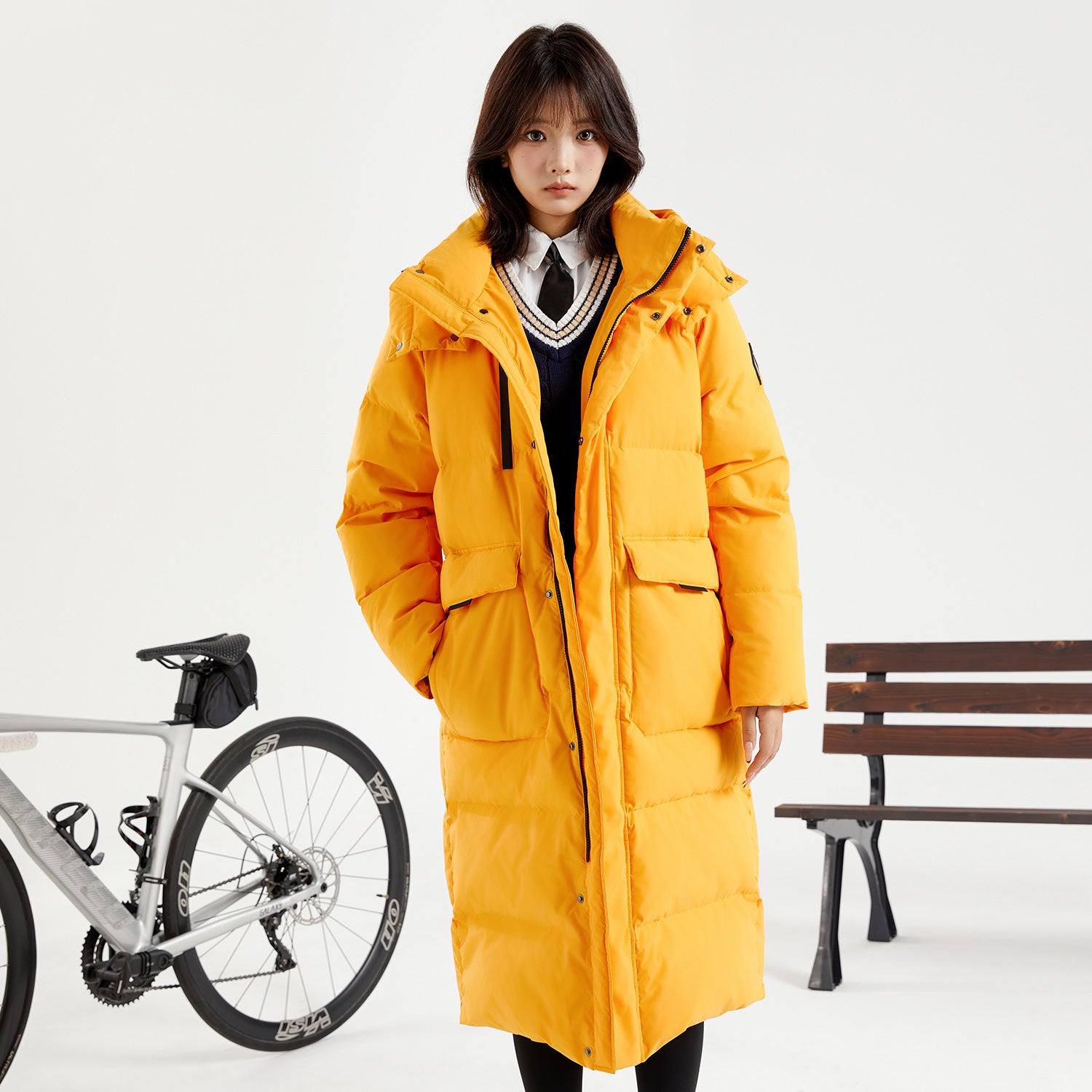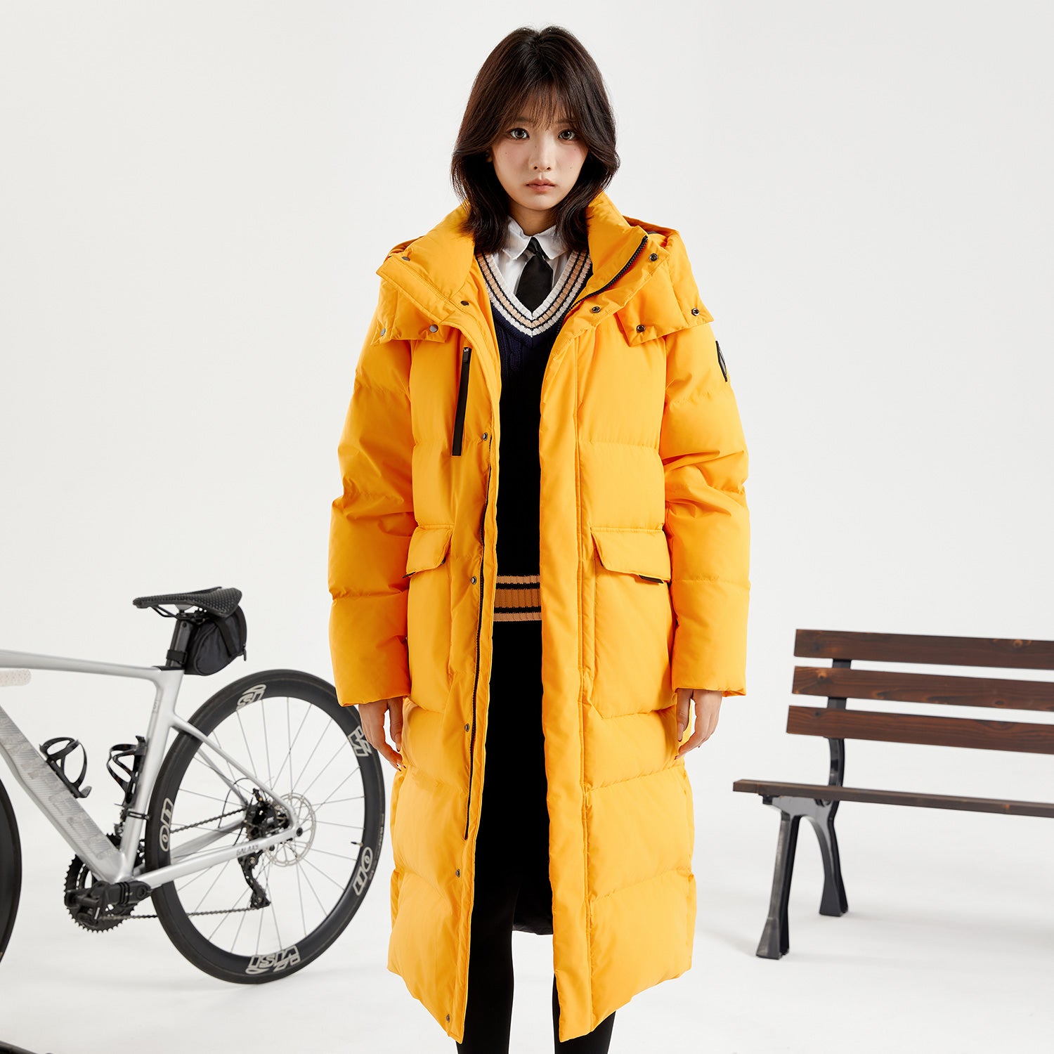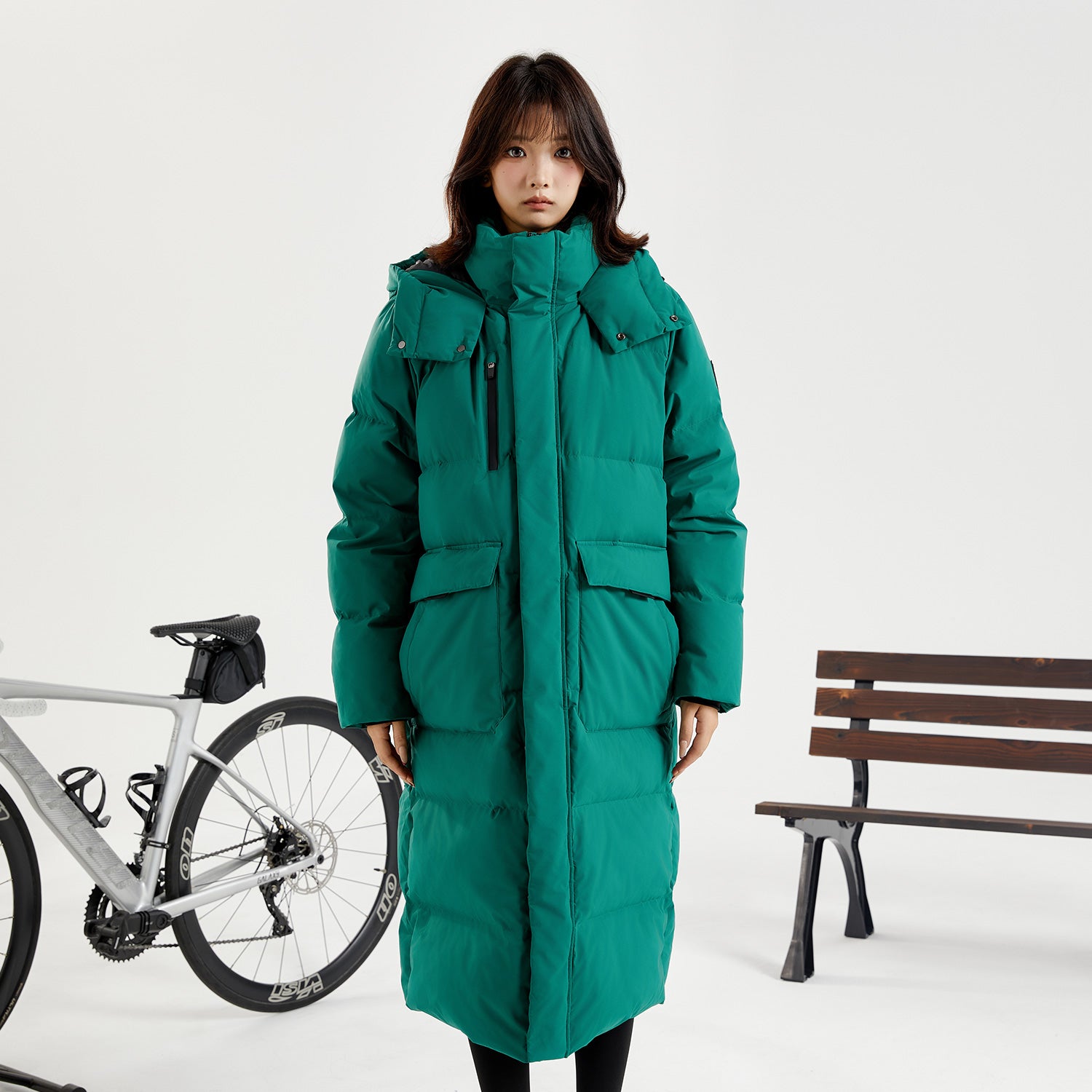 Женская зимняя куртка с капюшоном и застежкой‑молнией, выполненная из мягкой и теплой ткани с наполнителем из белого утиного пуха. Модель защищает от ветра и влаги, обеспечивая комфорт и тепло в холодную погоду.