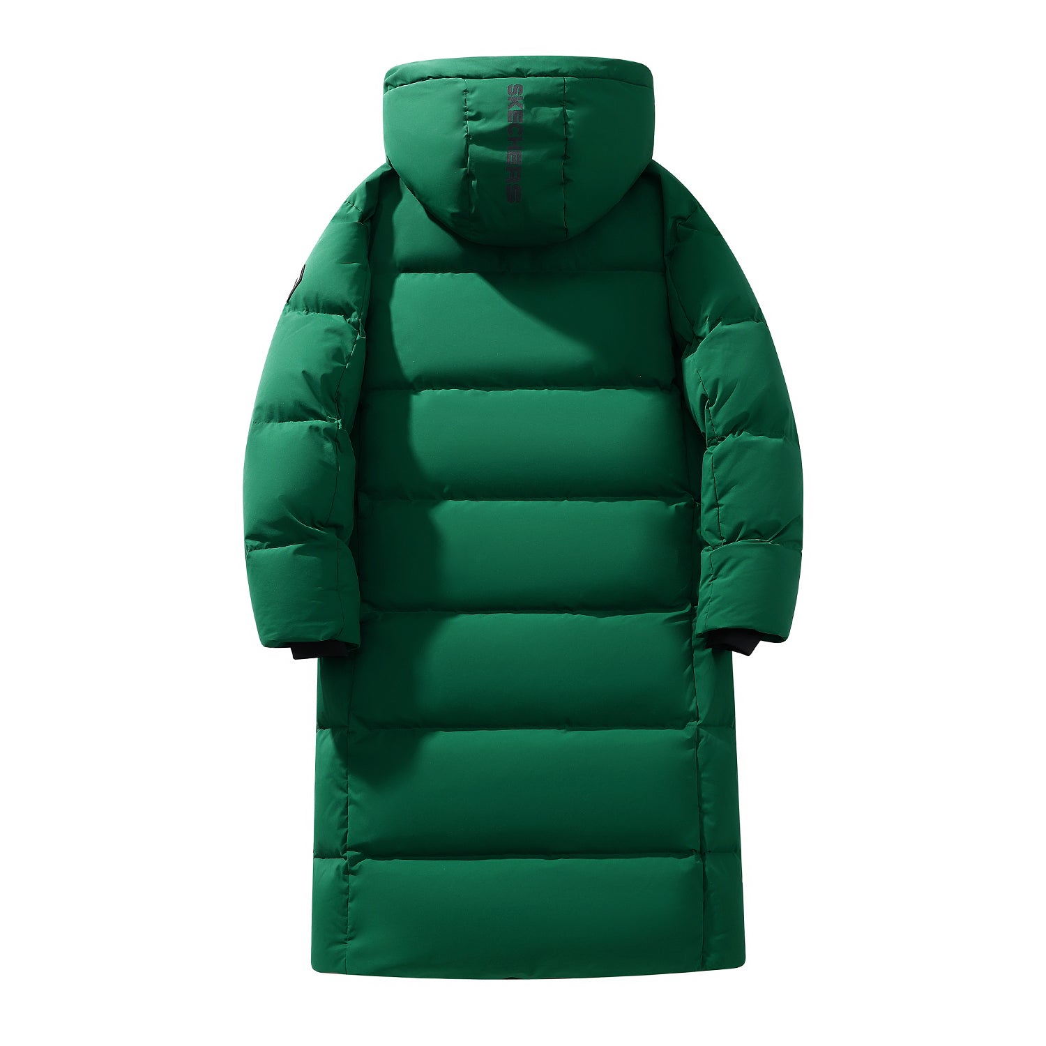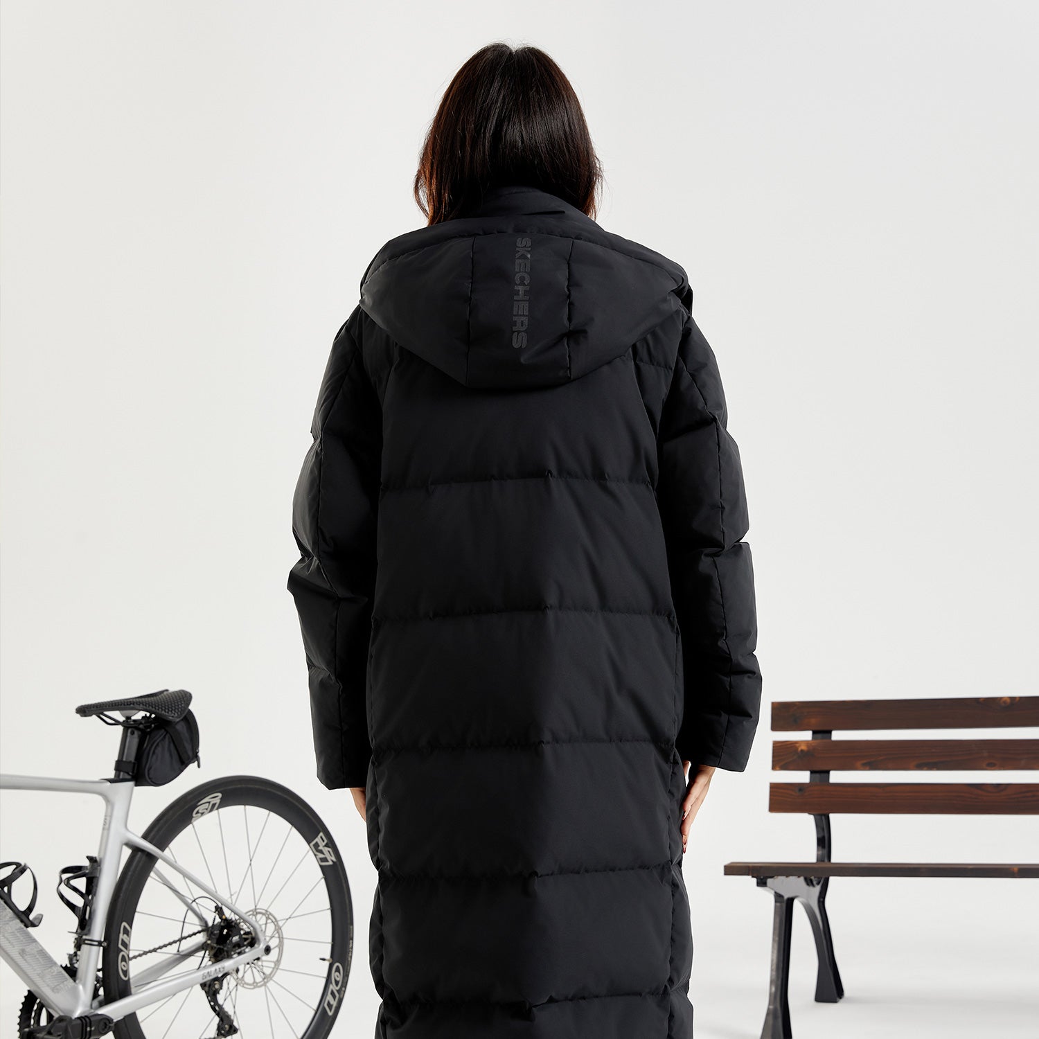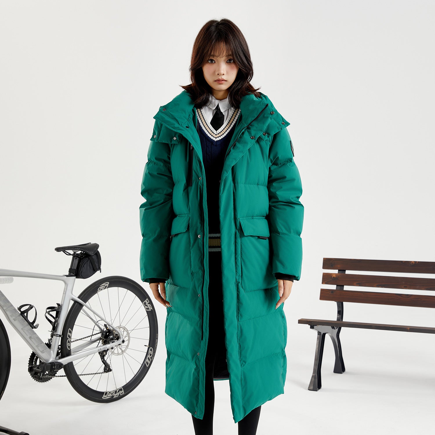 Женская зимняя куртка с капюшоном и застежкой‑молнией, выполненная из мягкой и теплой ткани с наполнителем из белого утиного пуха. Модель защищает от ветра и влаги, обеспечивая комфорт и тепло в холодную погоду.
