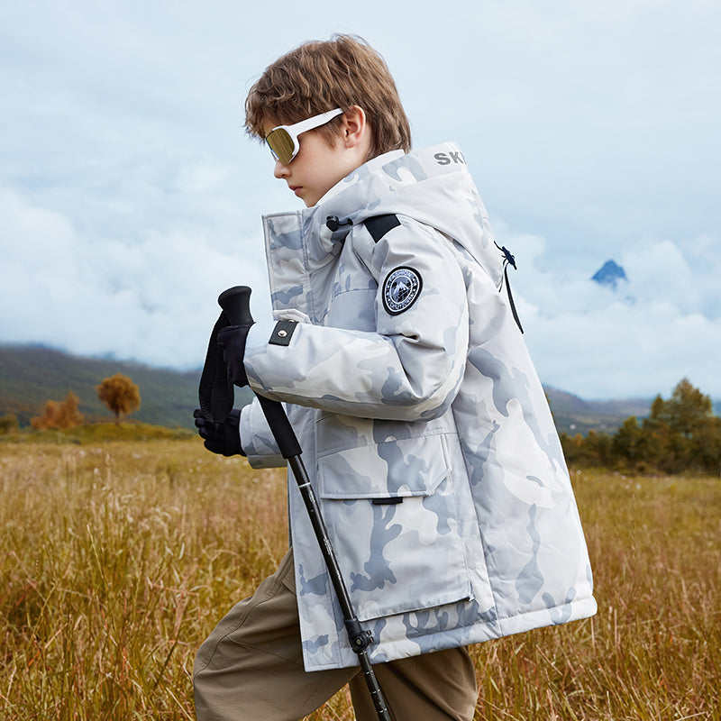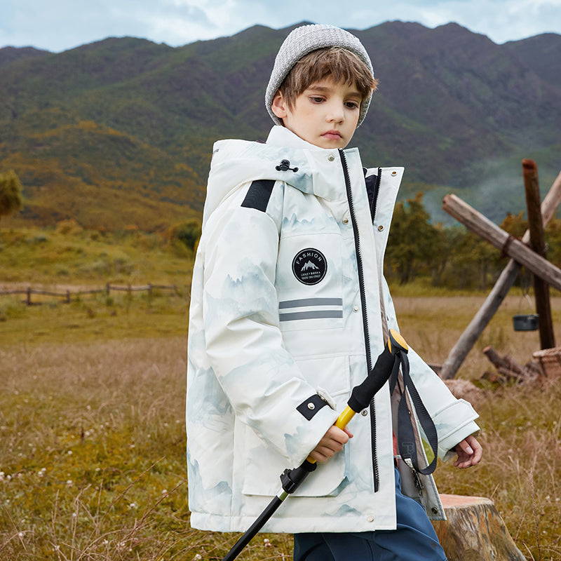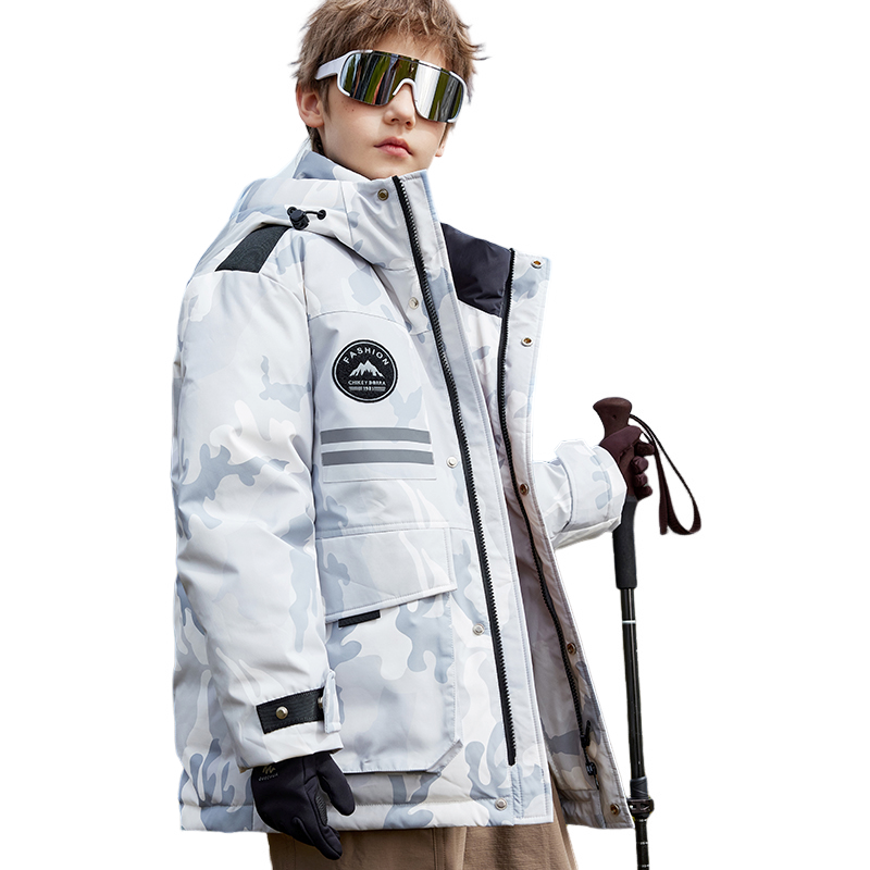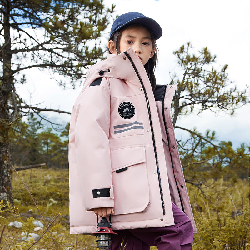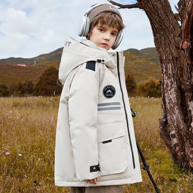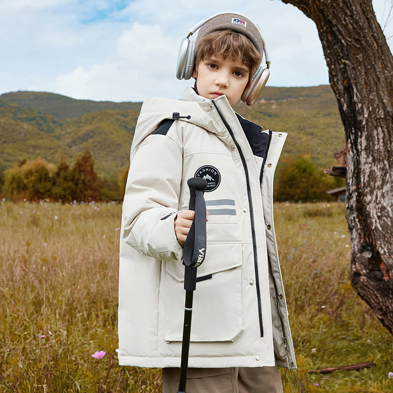 Длинный детский пуховик с капюшоном и контрастными вставками, наполненный белым утиным пухом. Модель свободного кроя с утепленной подкладкой обеспечивает тепло, комфорт и уличный стиль для активного отдыха и повседневной носки.
