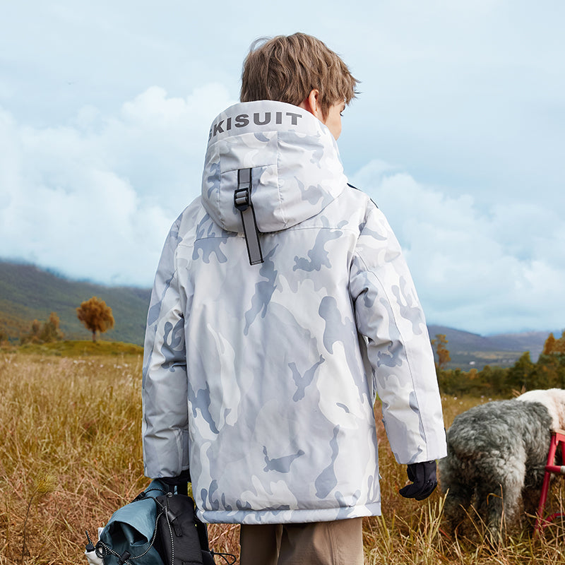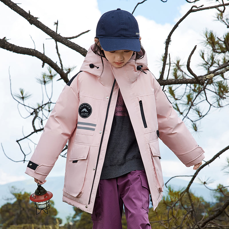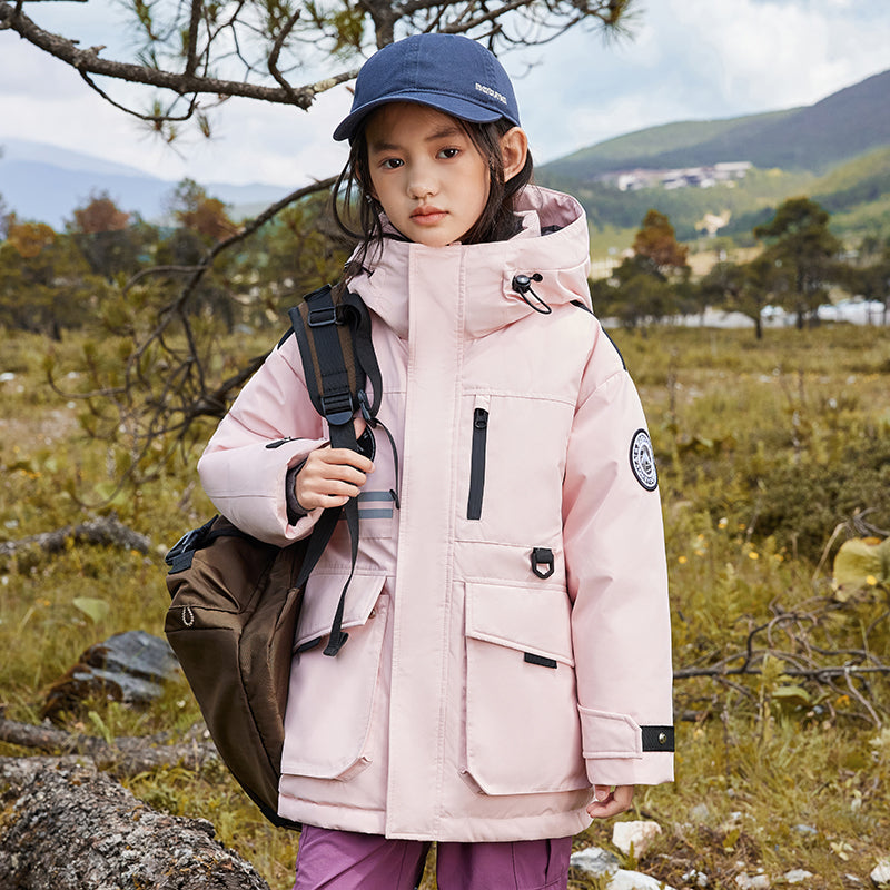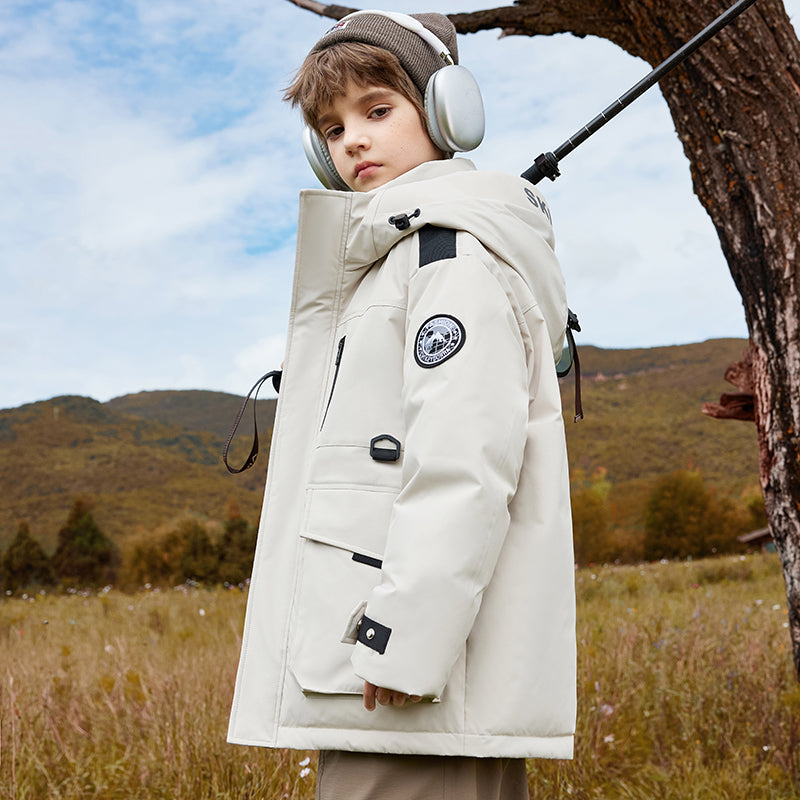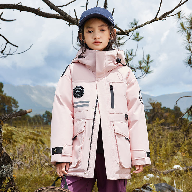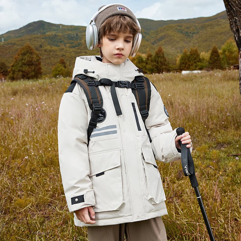Длинный детский пуховик с капюшоном и контрастными вставками, наполненный белым утиным пухом. Модель свободного кроя с утепленной подкладкой обеспечивает тепло, комфорт и уличный стиль для активного отдыха и повседневной носки.