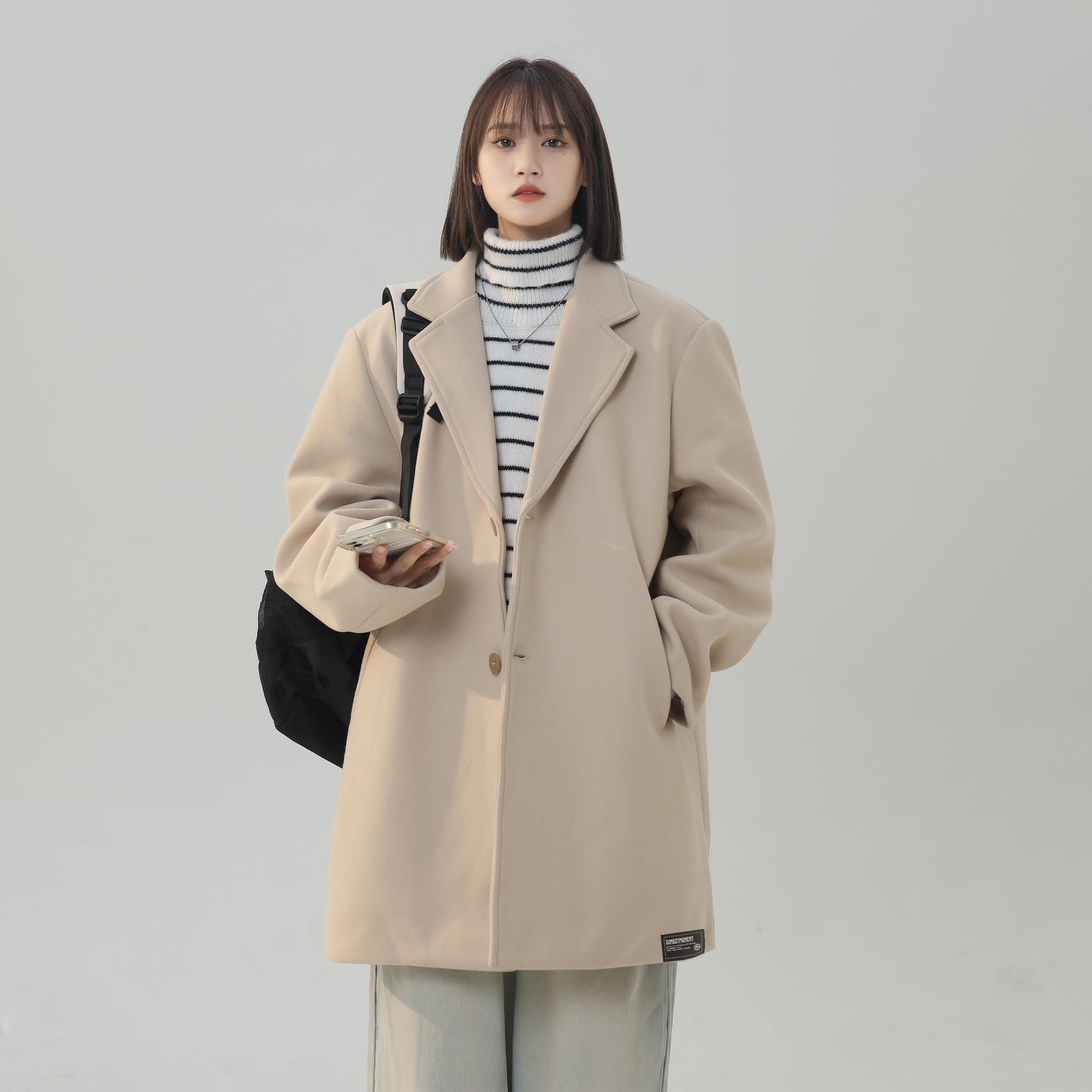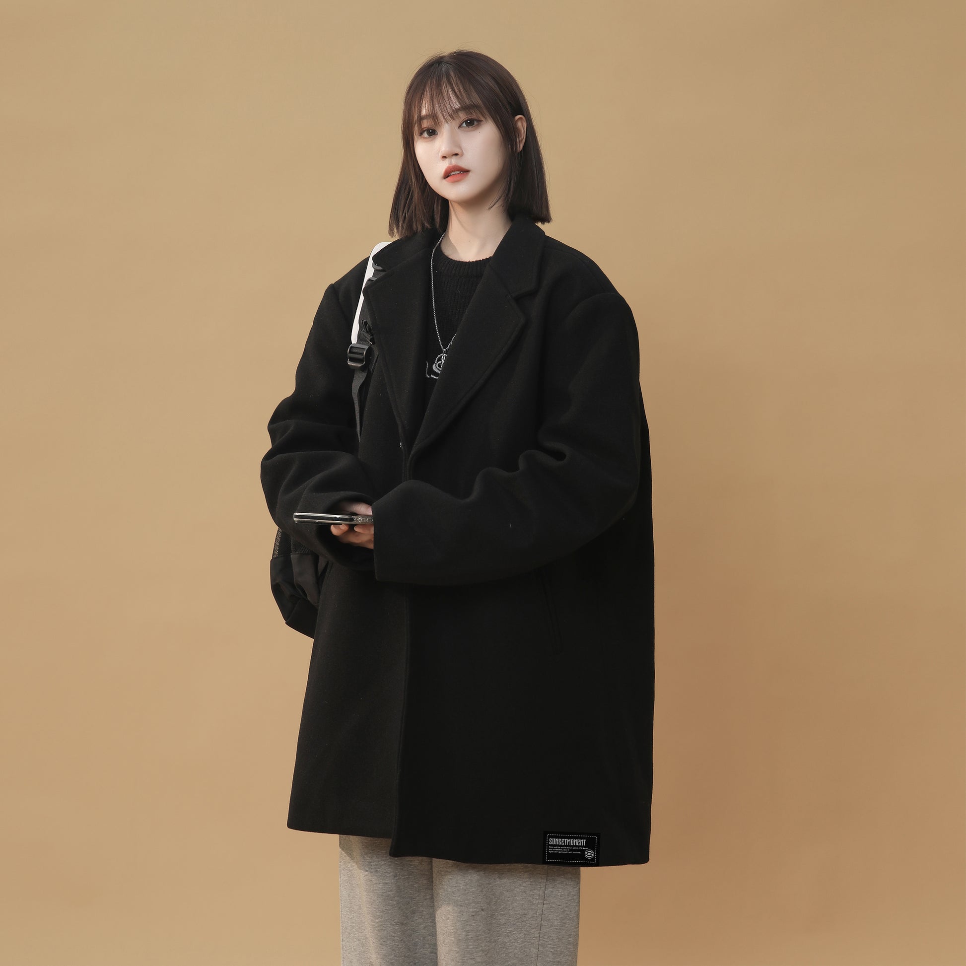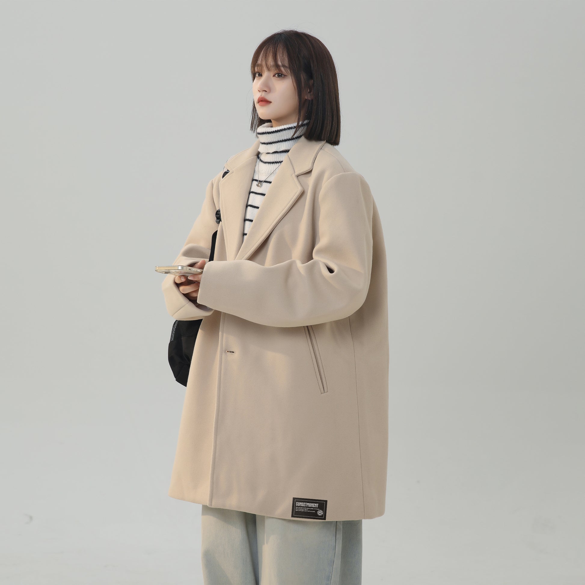 Женское пальто в корейском стиле с однобортной застежкой и отложным воротником. Модель с длинными рукавами и свободным силуэтом выполнена из полиэстера с шерстяной тканью и подкладкой, сочетает комфорт, тепло и стиль для осени, зимы и весны.