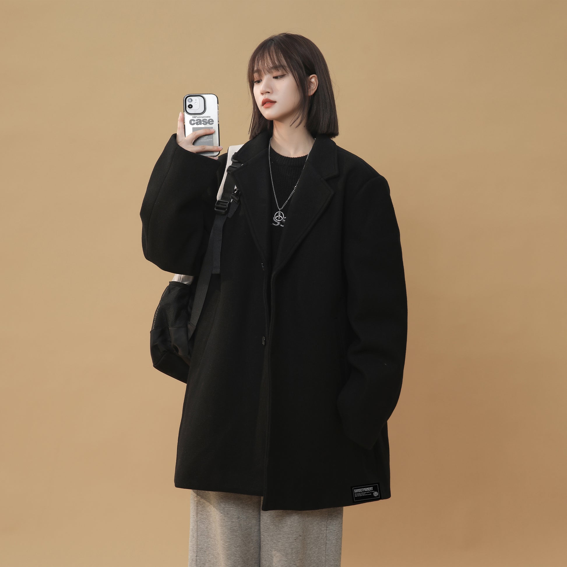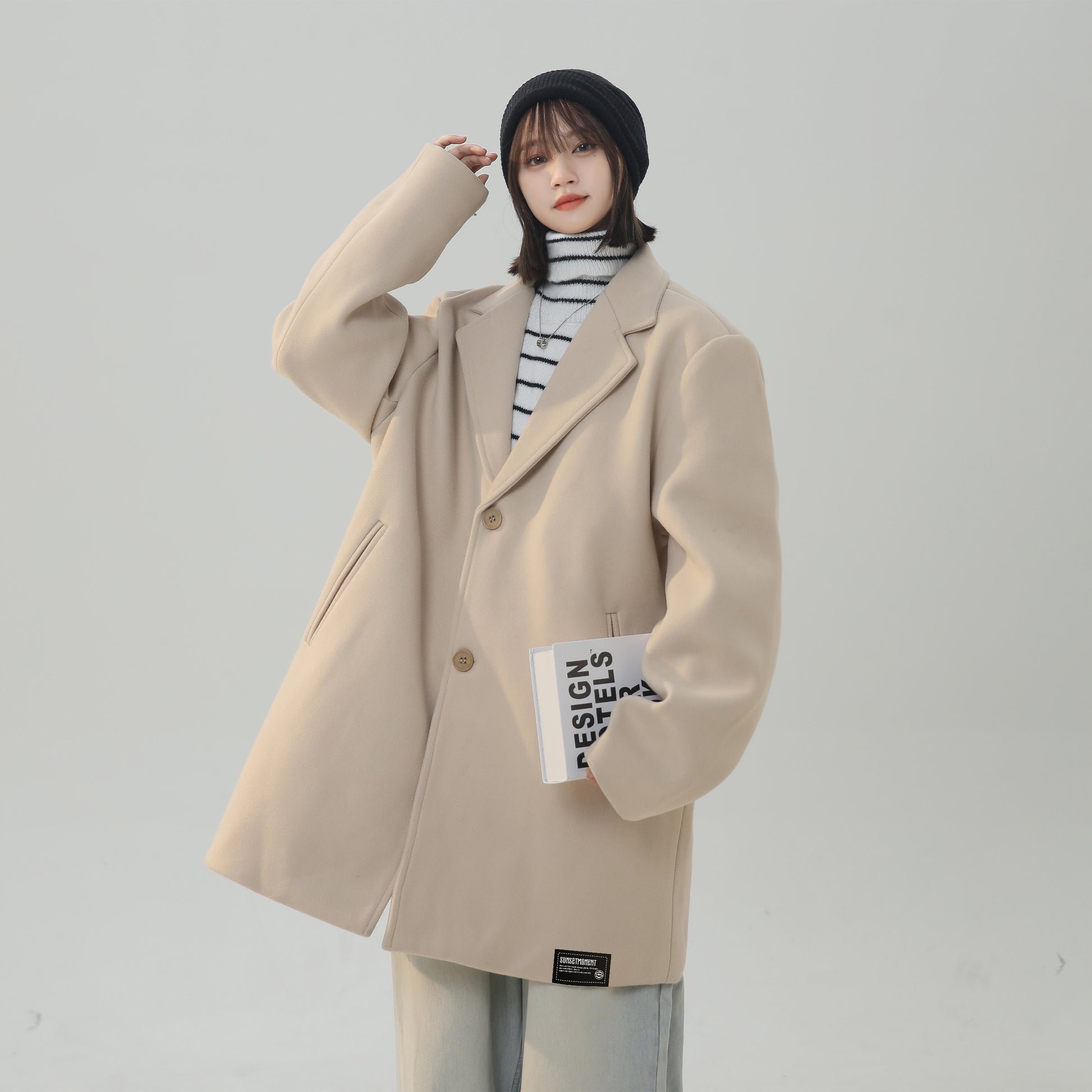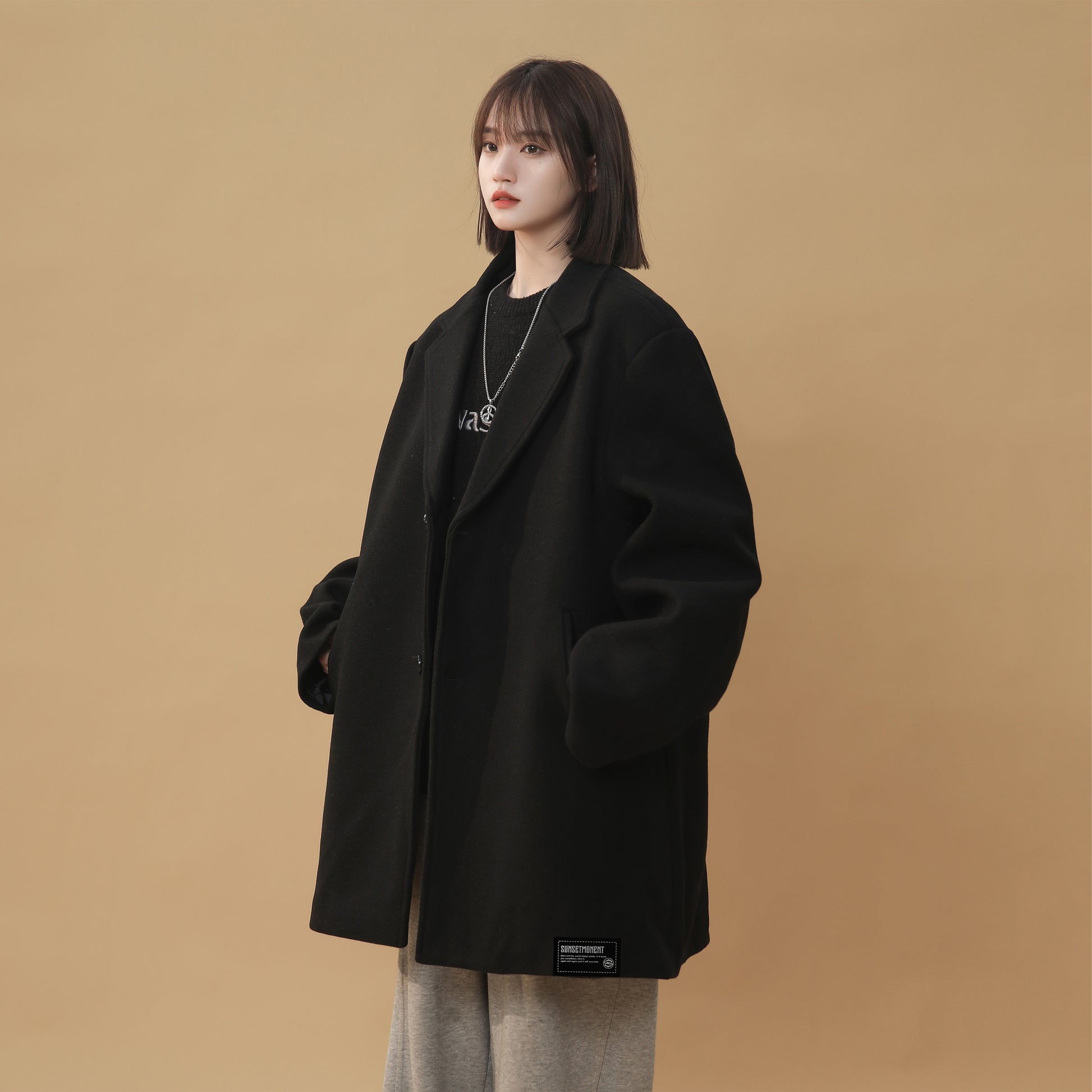 Женское пальто в корейском стиле с однобортной застежкой и отложным воротником. Модель с длинными рукавами и свободным силуэтом выполнена из полиэстера с шерстяной тканью и подкладкой, сочетает комфорт, тепло и стиль для осени, зимы и весны.